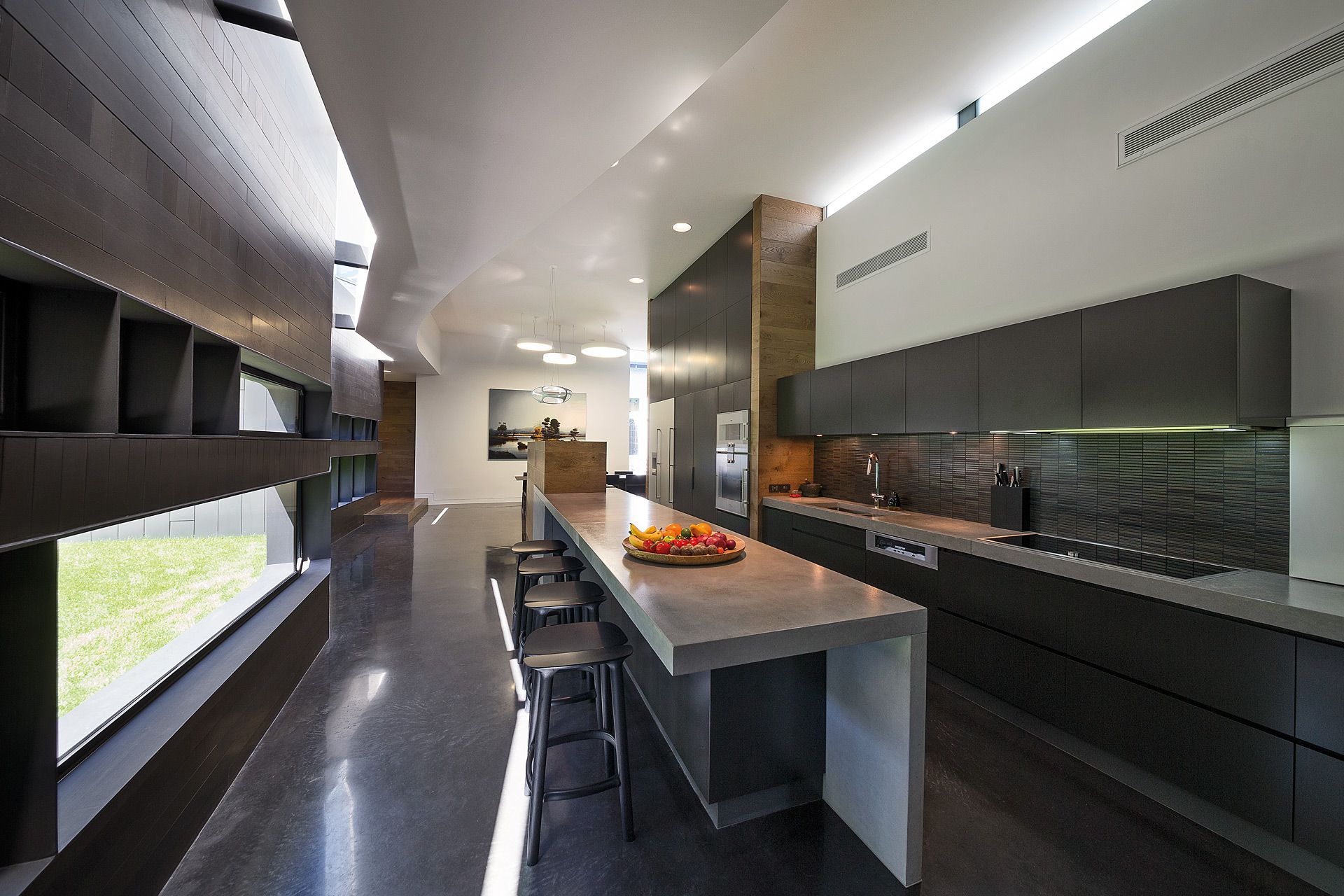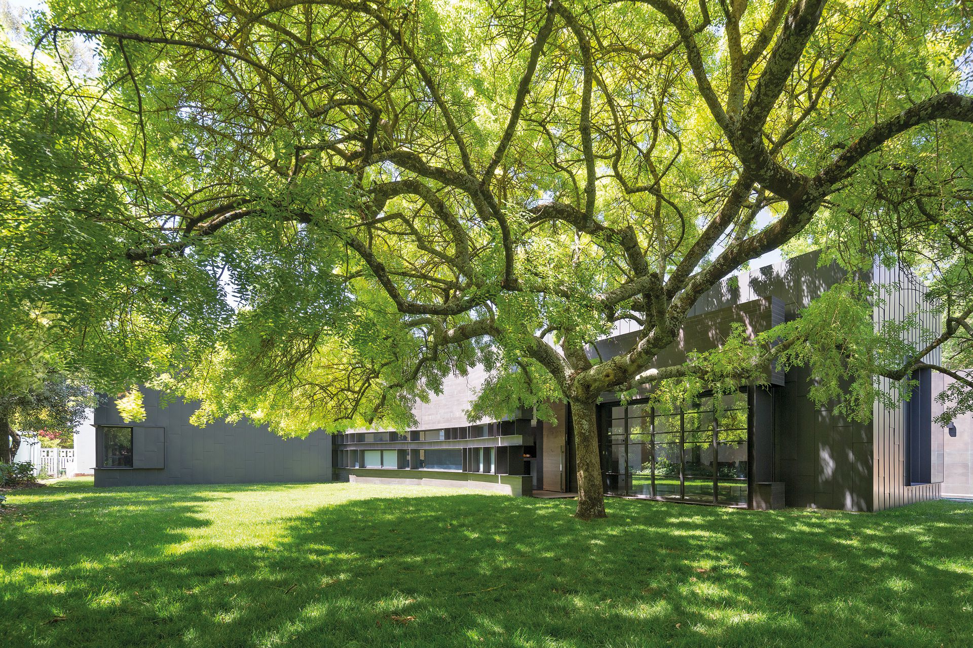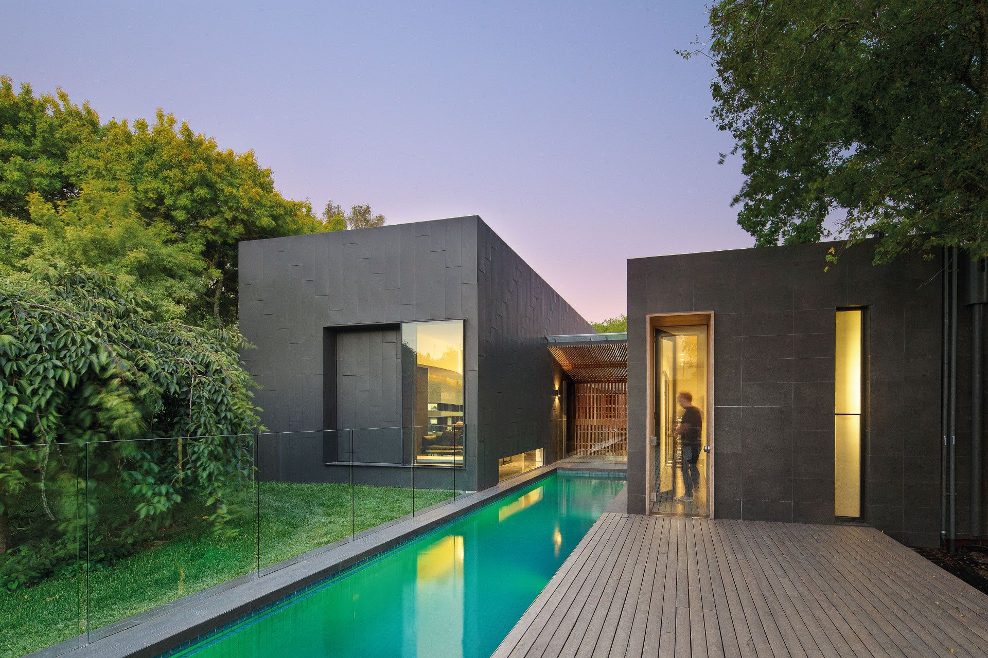 A sinuous basalt wall with steel framed slot windows forms the interface between the new living, dining and kitchen and a verdant 1920s garden at the rear of a Federation home. A mature Golden Ash forms an external canopy to the living space, accessed through glazed folding doors. A 20m lap pool and courtyard separate the living spaces from a pottery studio, gym and change facilities. This project was undertaken by Janet McGaw Architects and Atelier Wagner Architects in association.