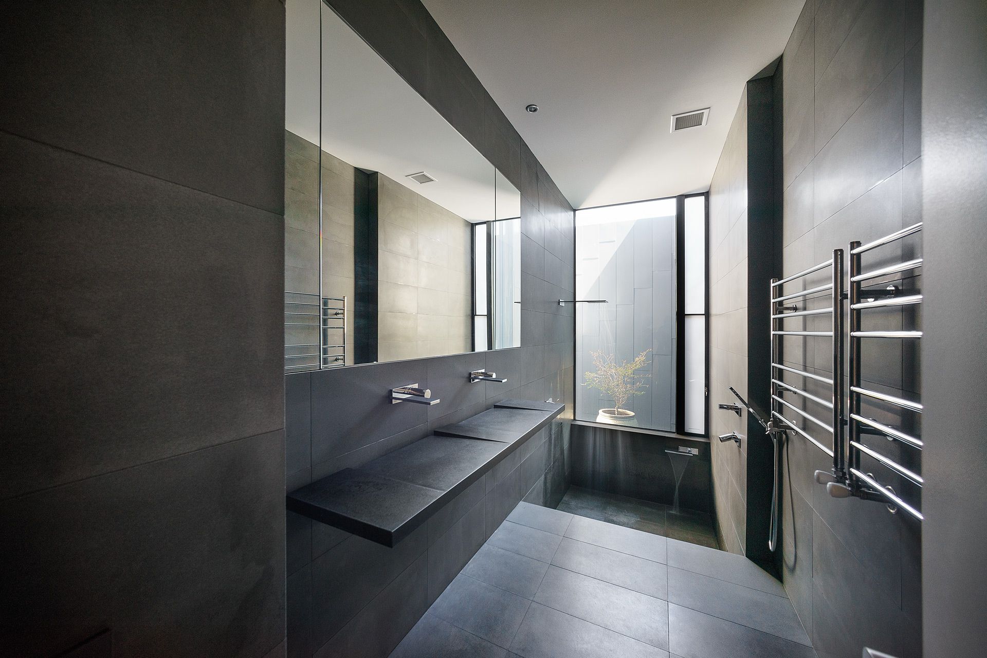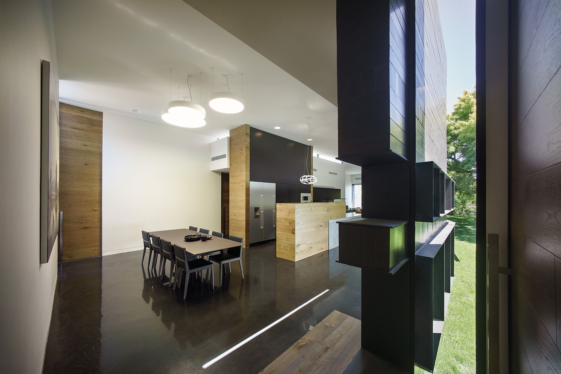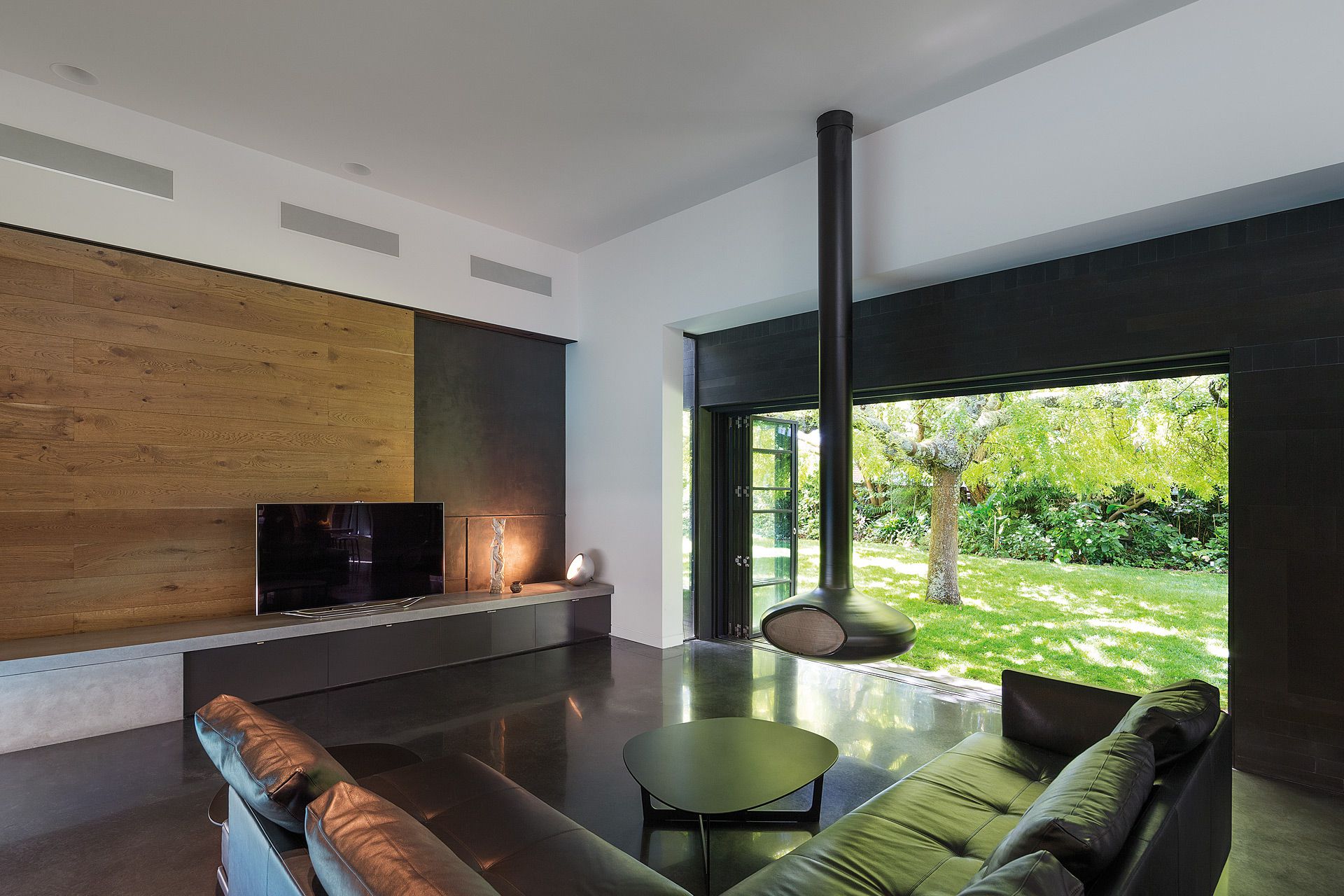 A sinuous basalt wall with steel framed slot windows forms the interface between the new living, dining and kitchen and a verdant 1920s garden at the rear of a Federation home. A mature Golden Ash forms an external canopy to the living space, accessed through glazed folding doors. A 20m lap pool and courtyard separate the living spaces from a pottery studio, gym and change facilities. This project was undertaken by Janet McGaw Architects and Atelier Wagner Architects in association.