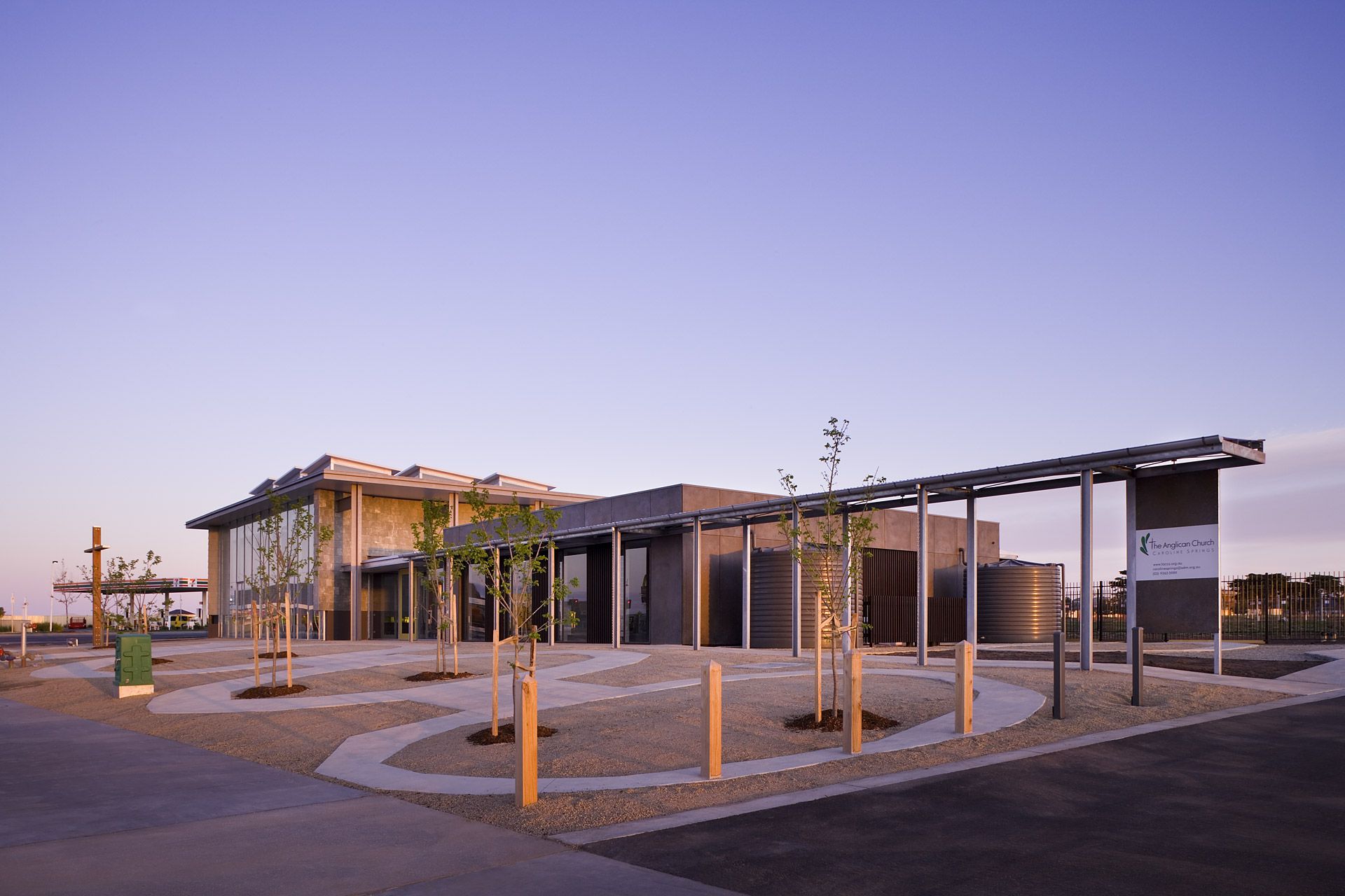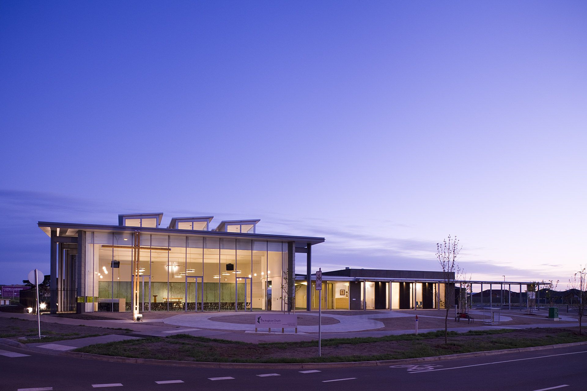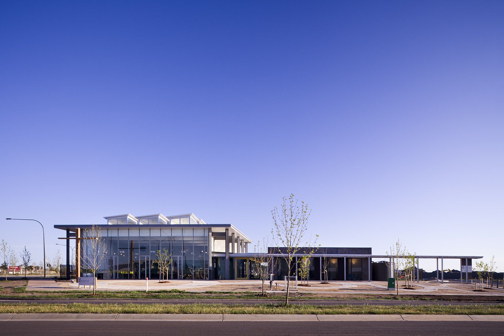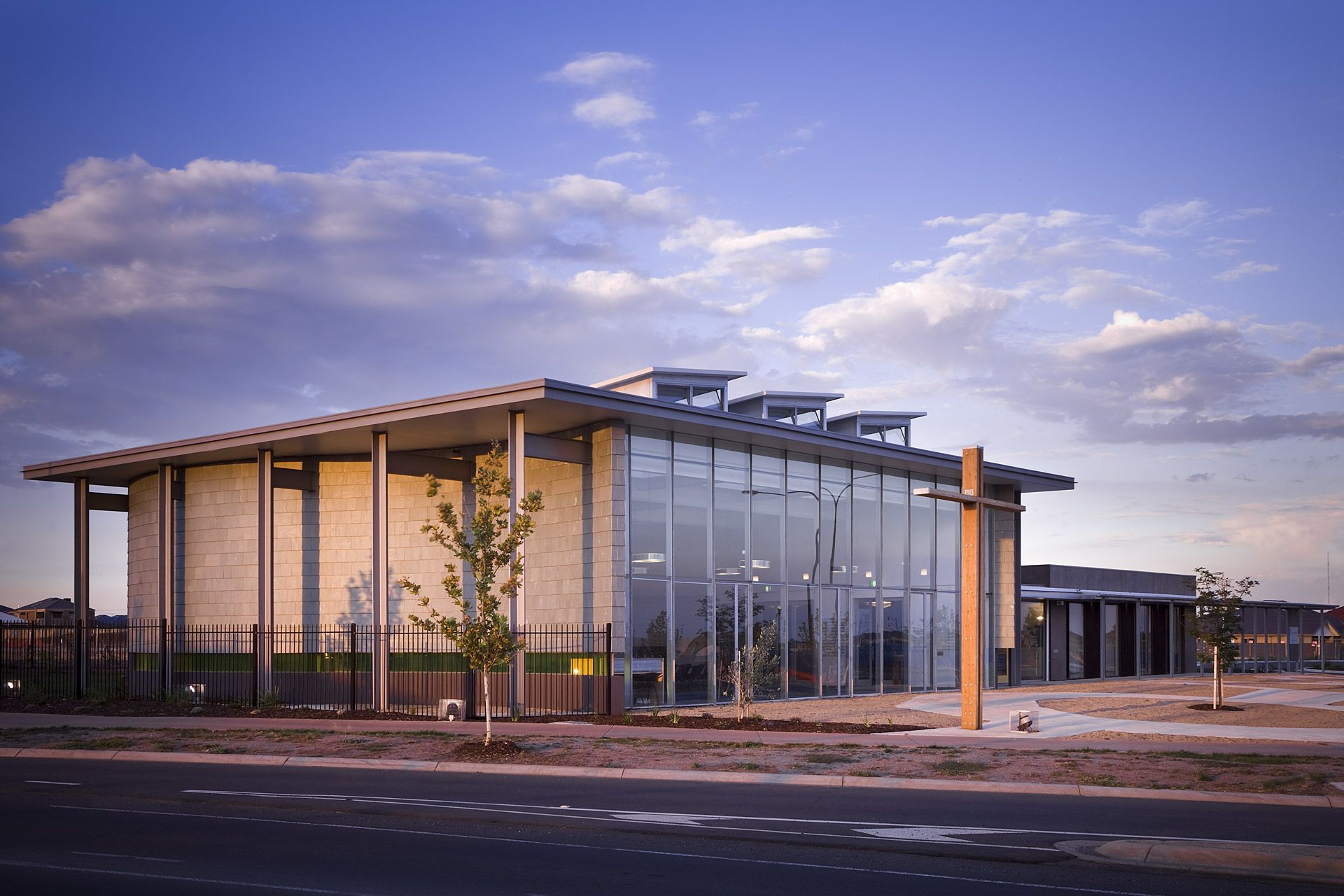 The fully glazed southern façade of the 250 person worship centre responds to both the main vista of Caroline Springs and the town centre by inviting all to be involved in its worship or fellowship activities.  Its curvilinear slate clad walls embrace the space, free of the structure under a large protective flat roof with openable glazed lanterns providing passive ventilation and minimizing artificial lighting.  The space opens onto a foyer space with adjacent meeting rooms, offices and support facilities.