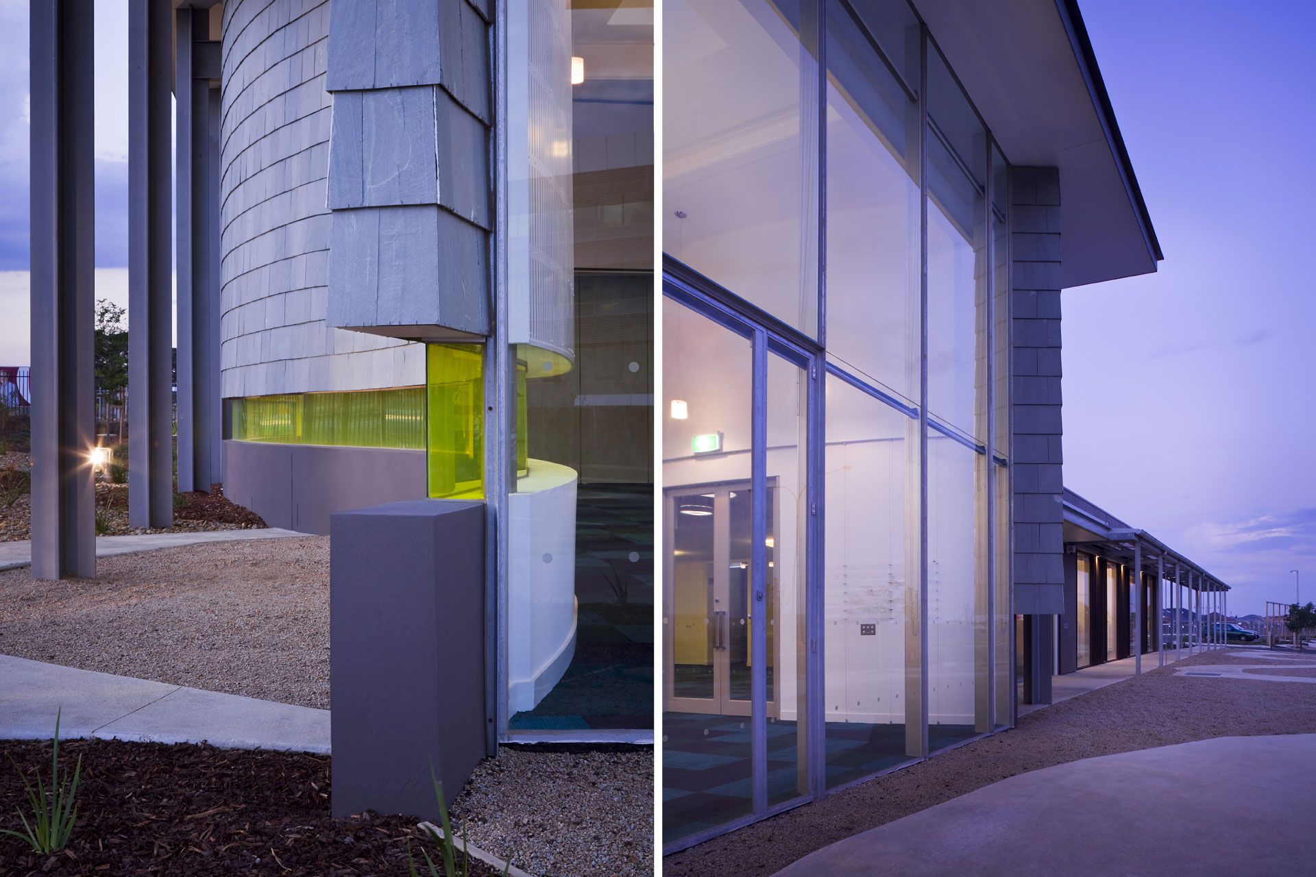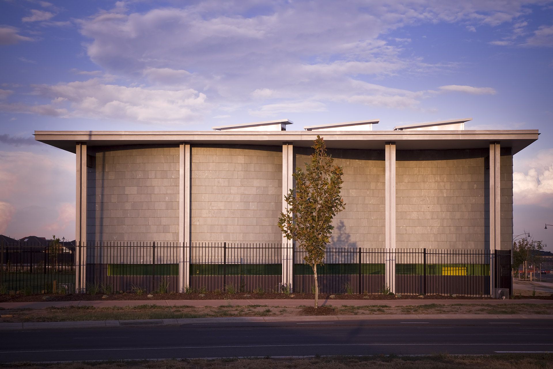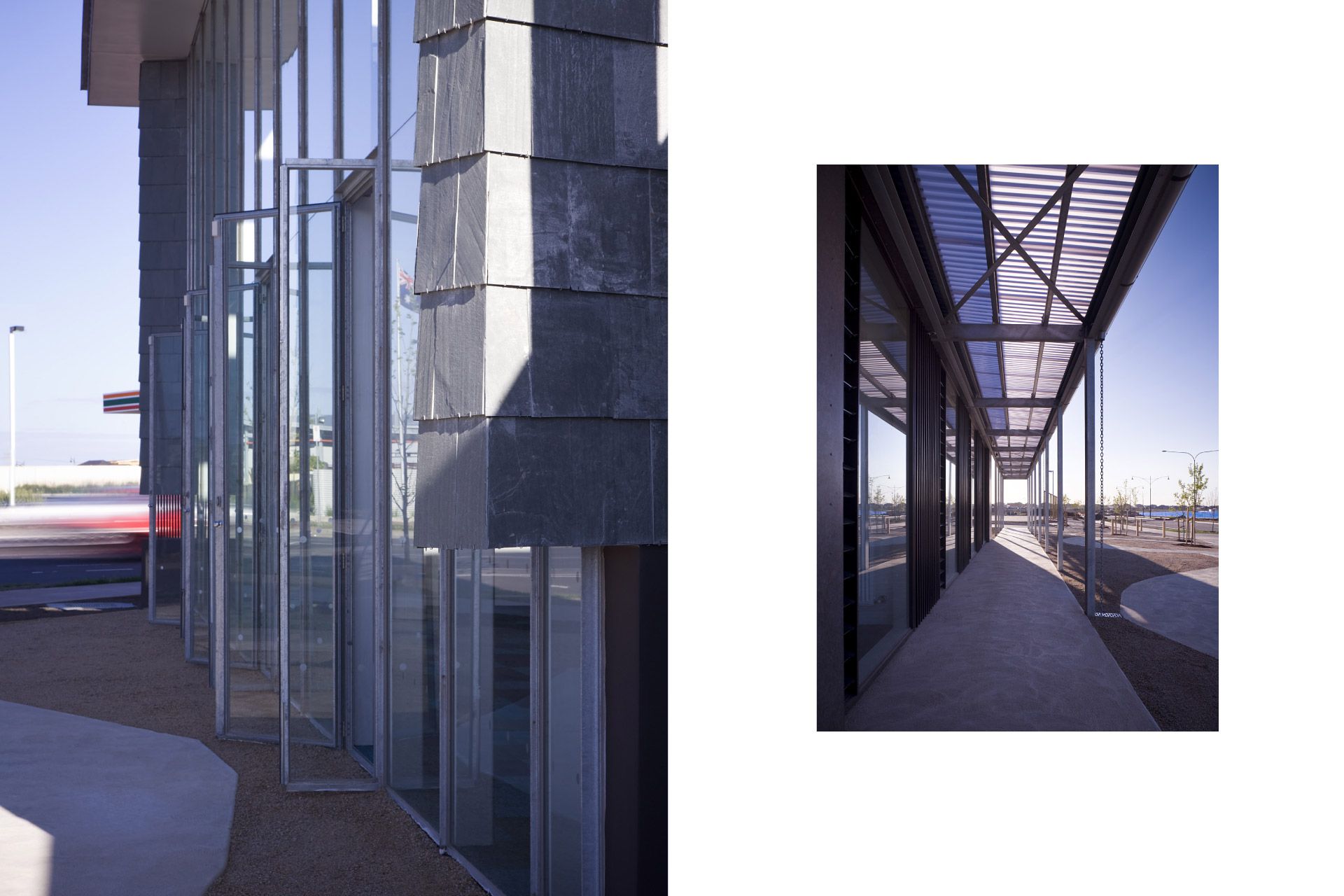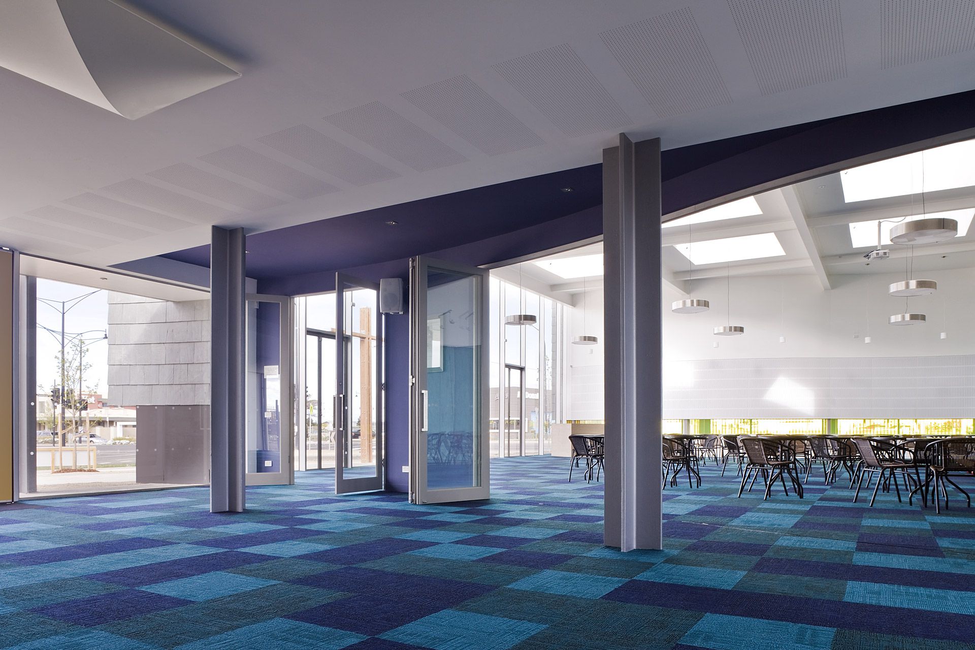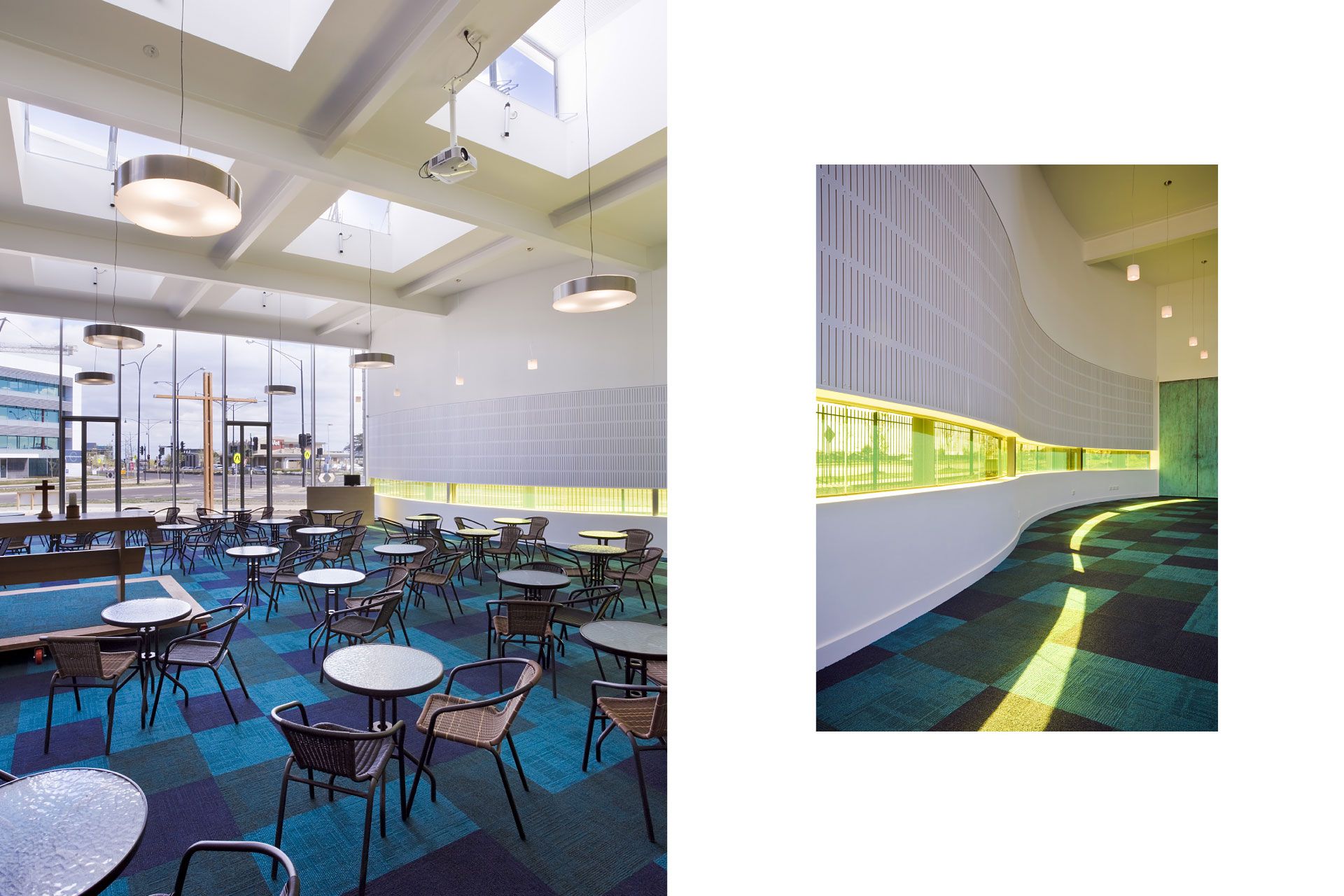 The fully glazed southern façade of the 250 person worship centre responds to both the main vista of Caroline Springs and the town centre by inviting all to be involved in its worship or fellowship activities.  Its curvilinear slate clad walls embrace the space, free of the structure under a large protective flat roof with openable glazed lanterns providing passive ventilation and minimizing artificial lighting.  The space opens onto a foyer space with adjacent meeting rooms, offices and support facilities.