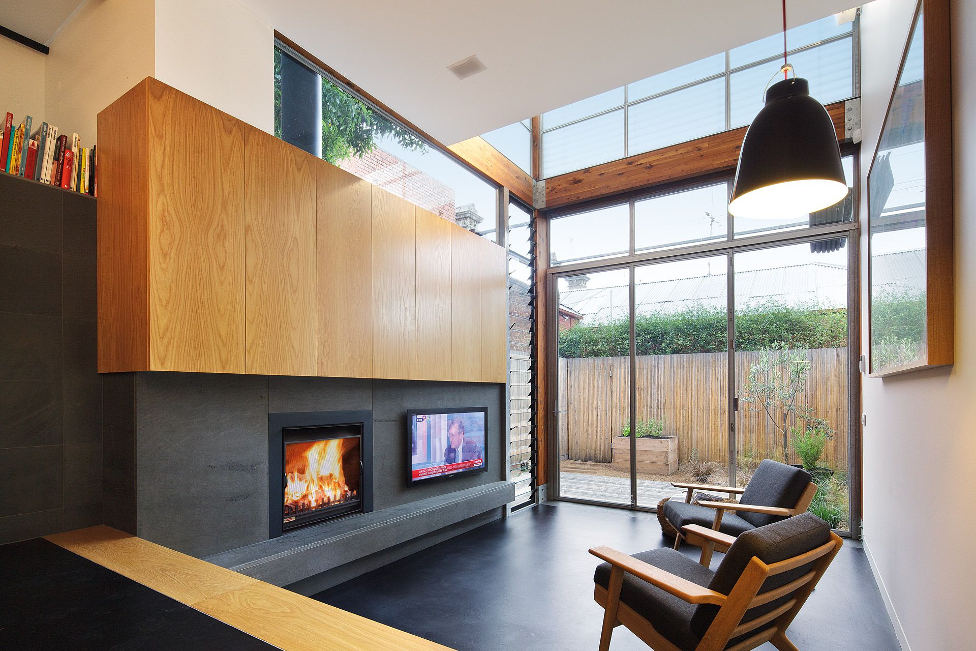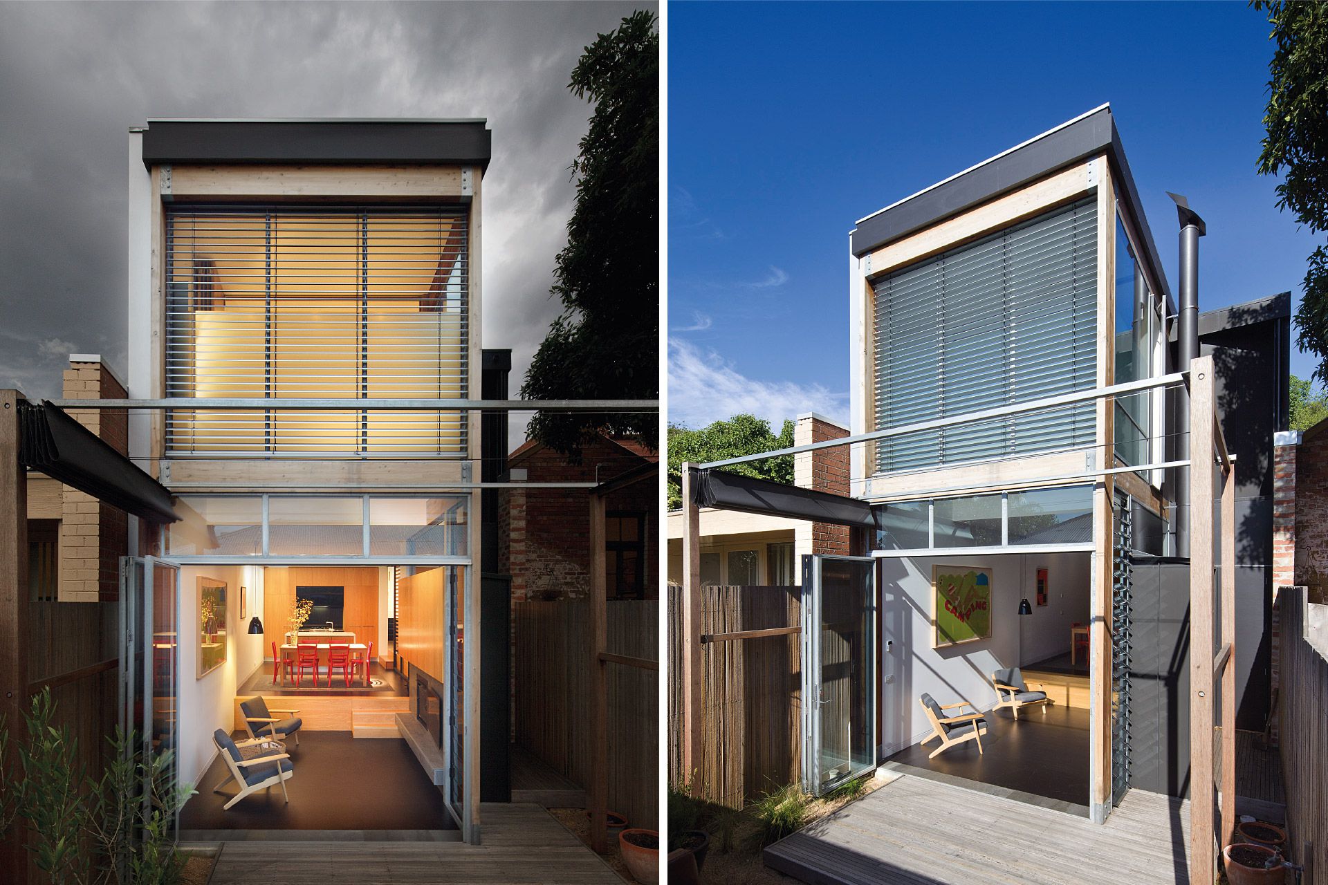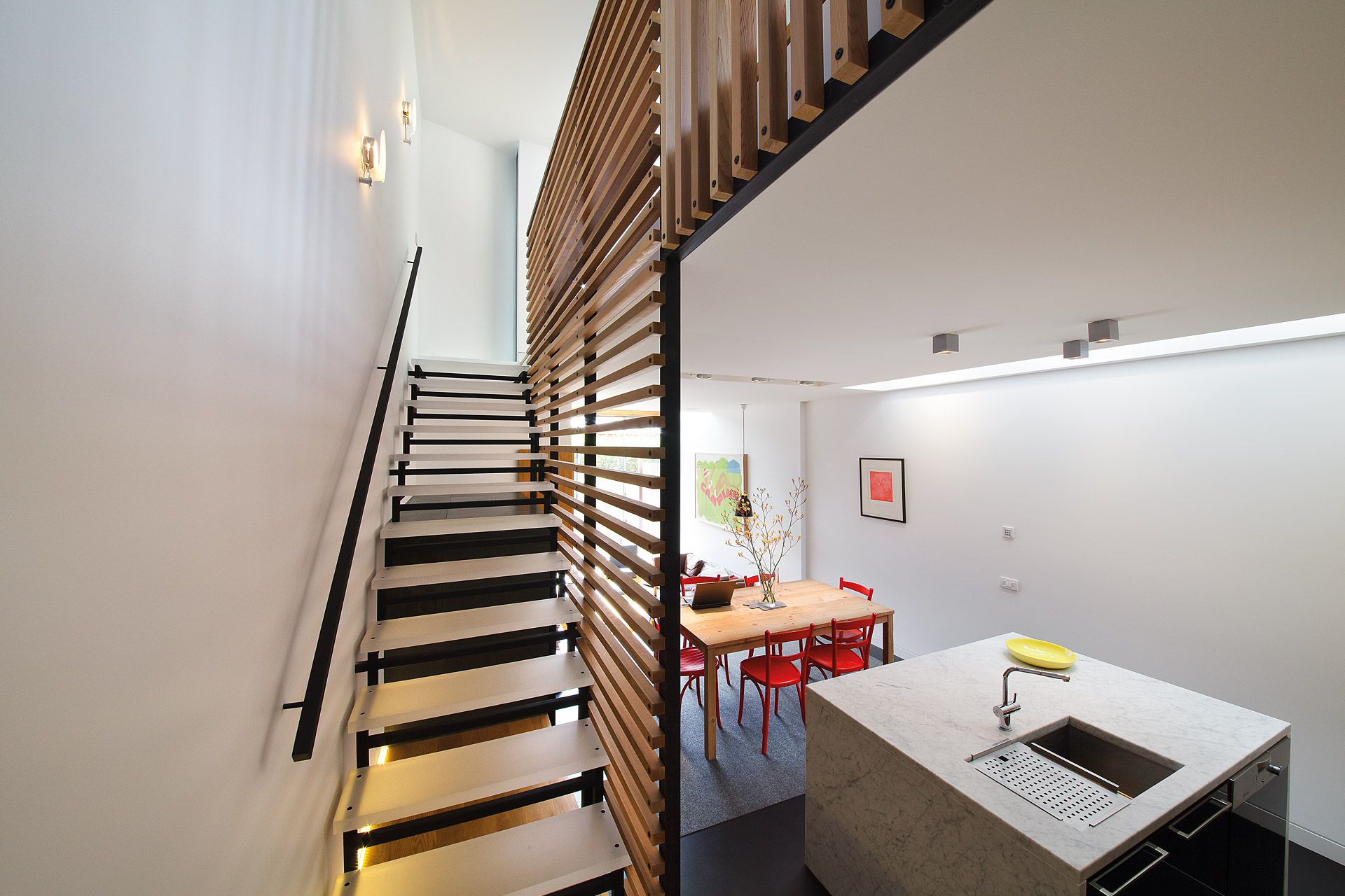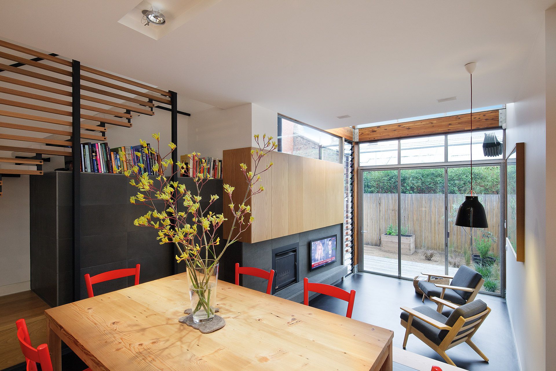 From the Victorian terrace house street level entrance, this house has been designed as a series of interlocking spaces cascading down a steeply sloping narrow site before coming to rest as a double height living space, extending into the rear garden on a spotted gum platform. A translucent polycarbonate stair with cedar battened balustrade gently rises through the forms reaching an upper level barbeque deck while allowing light to flow into and nourish the spaces below.