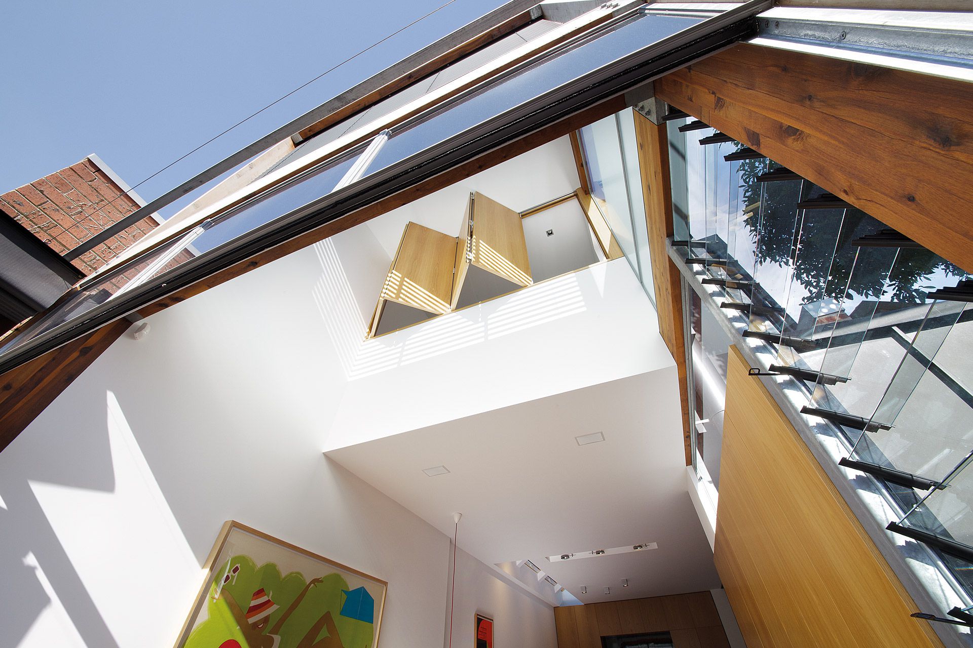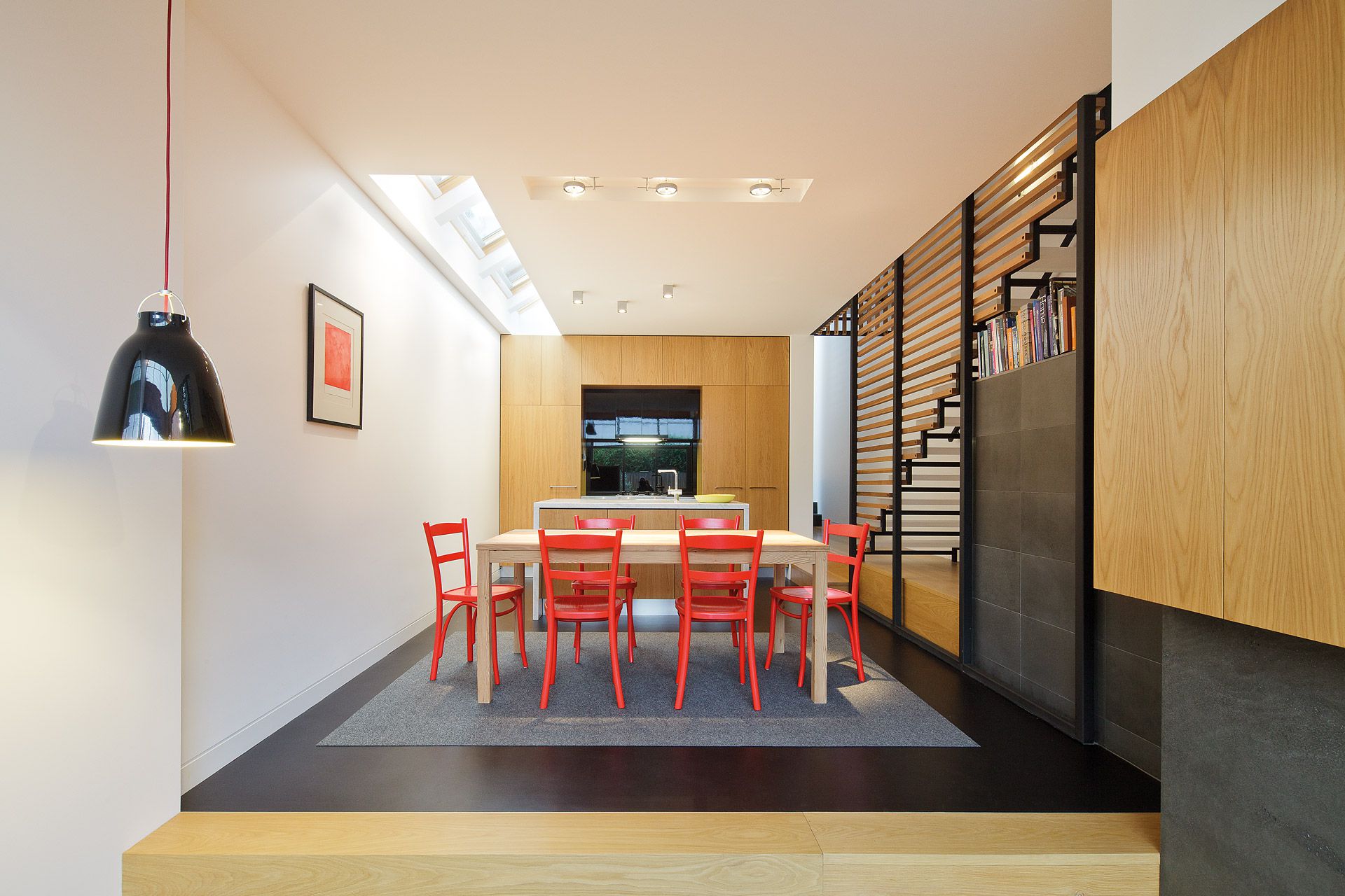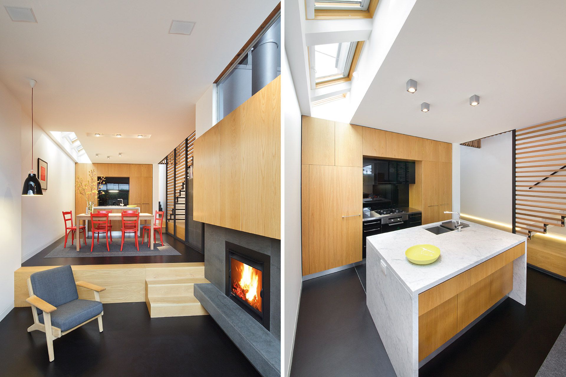From the Victorian terrace house street level entrance, this house has been designed as a series of interlocking spaces cascading down a steeply sloping narrow site before coming to rest as a double height living space, extending into the rear garden on a spotted gum platform. A translucent polycarbonate stair with cedar battened balustrade gently rises through the forms reaching an upper level barbeque deck while allowing light to flow into and nourish the spaces below.