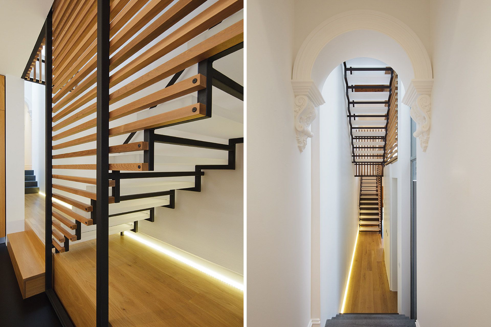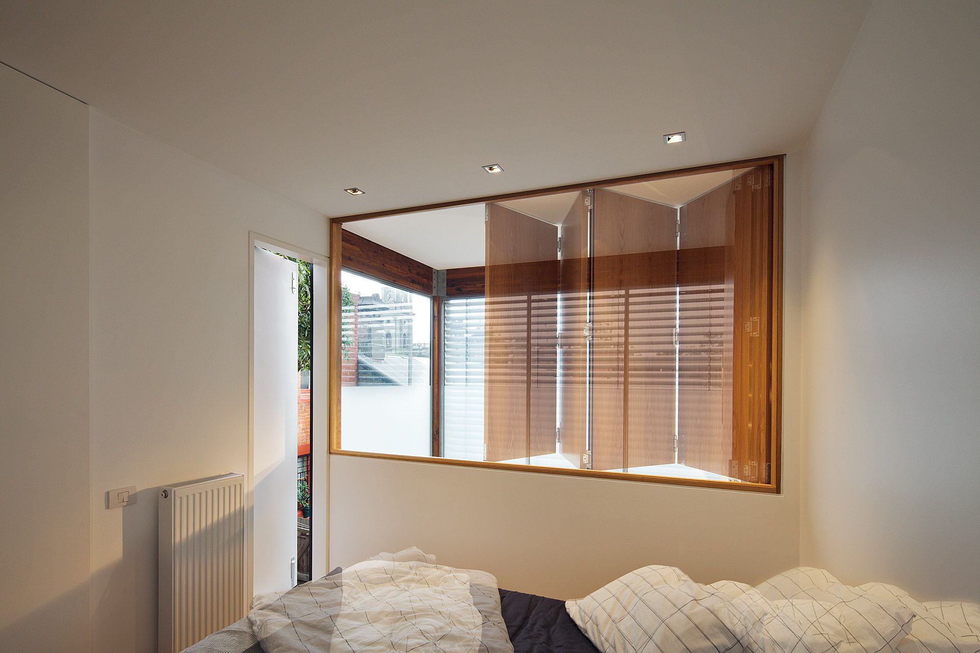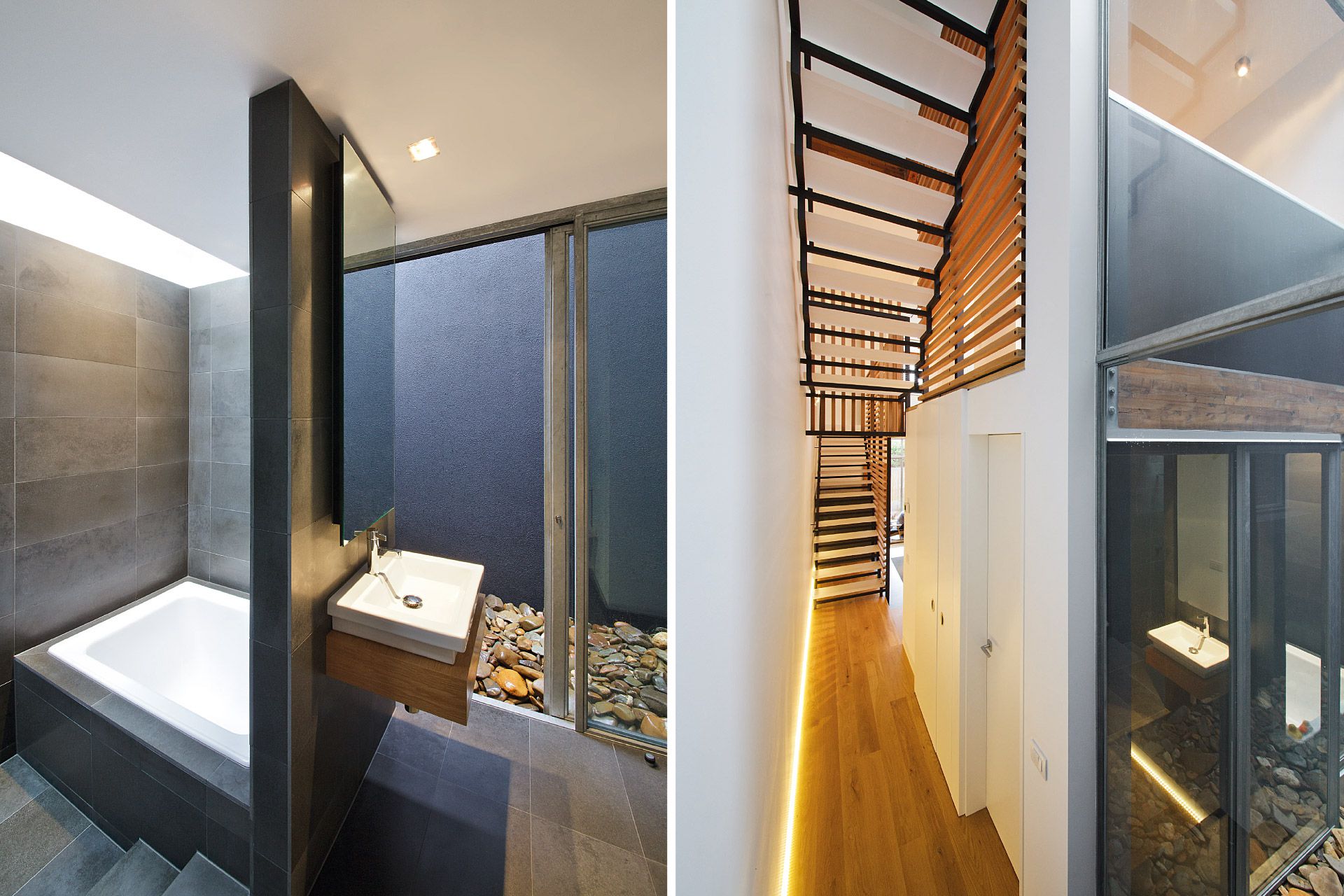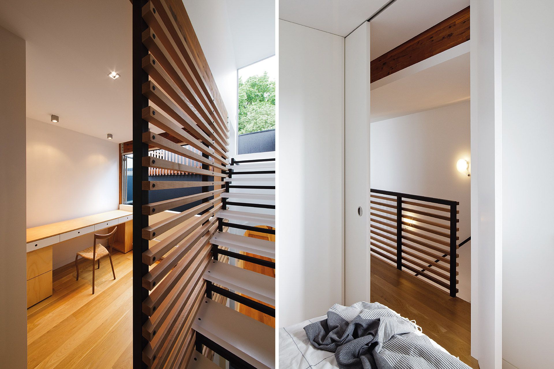 From the Victorian terrace house street level entrance, this house has been designed as a series of interlocking spaces cascading down a steeply sloping narrow site before coming to rest as a double height living space, extending into the rear garden on a spotted gum platform. A translucent polycarbonate stair with cedar battened balustrade gently rises through the forms reaching an upper level barbeque deck while allowing light to flow into and nourish the spaces below.