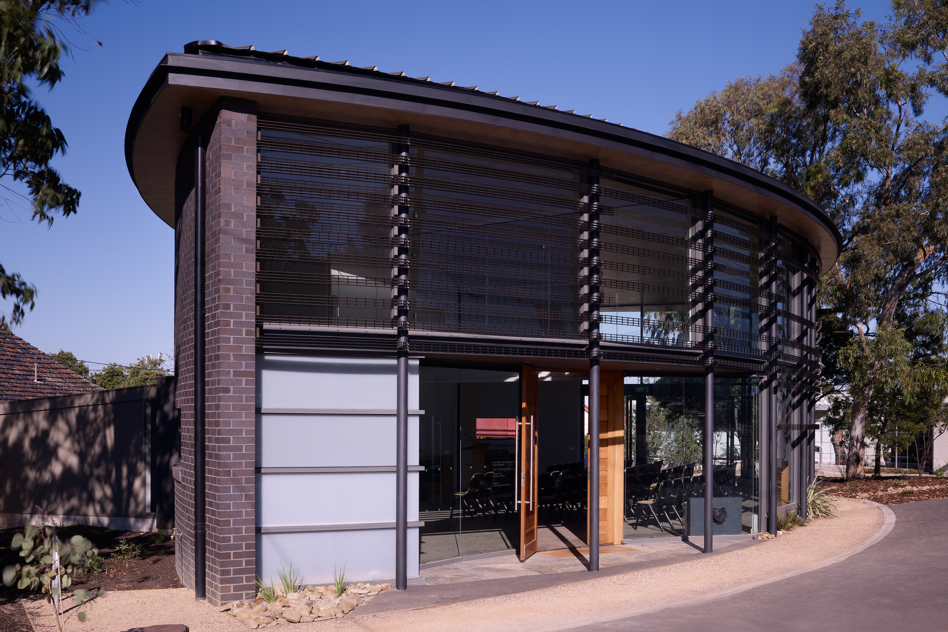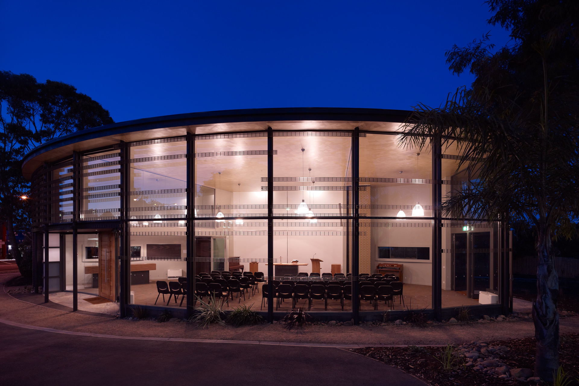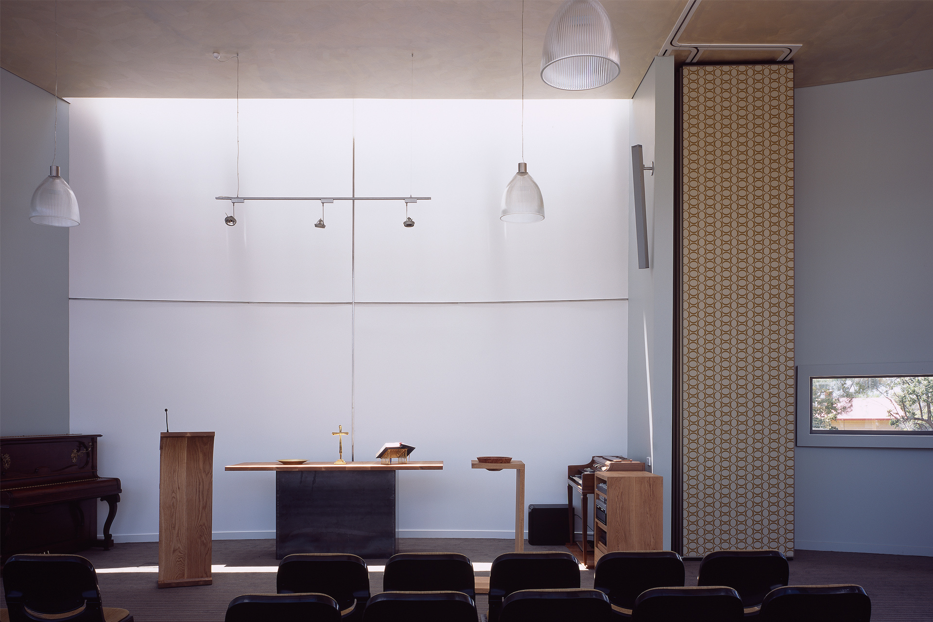 The worship space embraces Watsonia through its open and welcoming façade and forecourt.  The space itself is divisible into three: narthex, worship space for 55 people and meeting space or can be united to provide for larger gatherings. A solar protected rooflight introduces light and imbues an expression of time over a stainless steel cross incised into the curved white reredos.  The holy table and sanctuary furniture have been designed in oiled solid American oak accompanied by raw black steel.