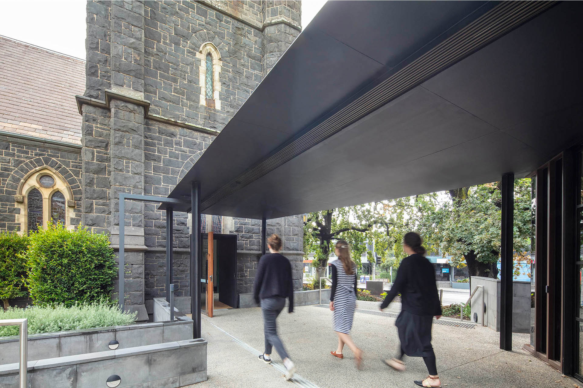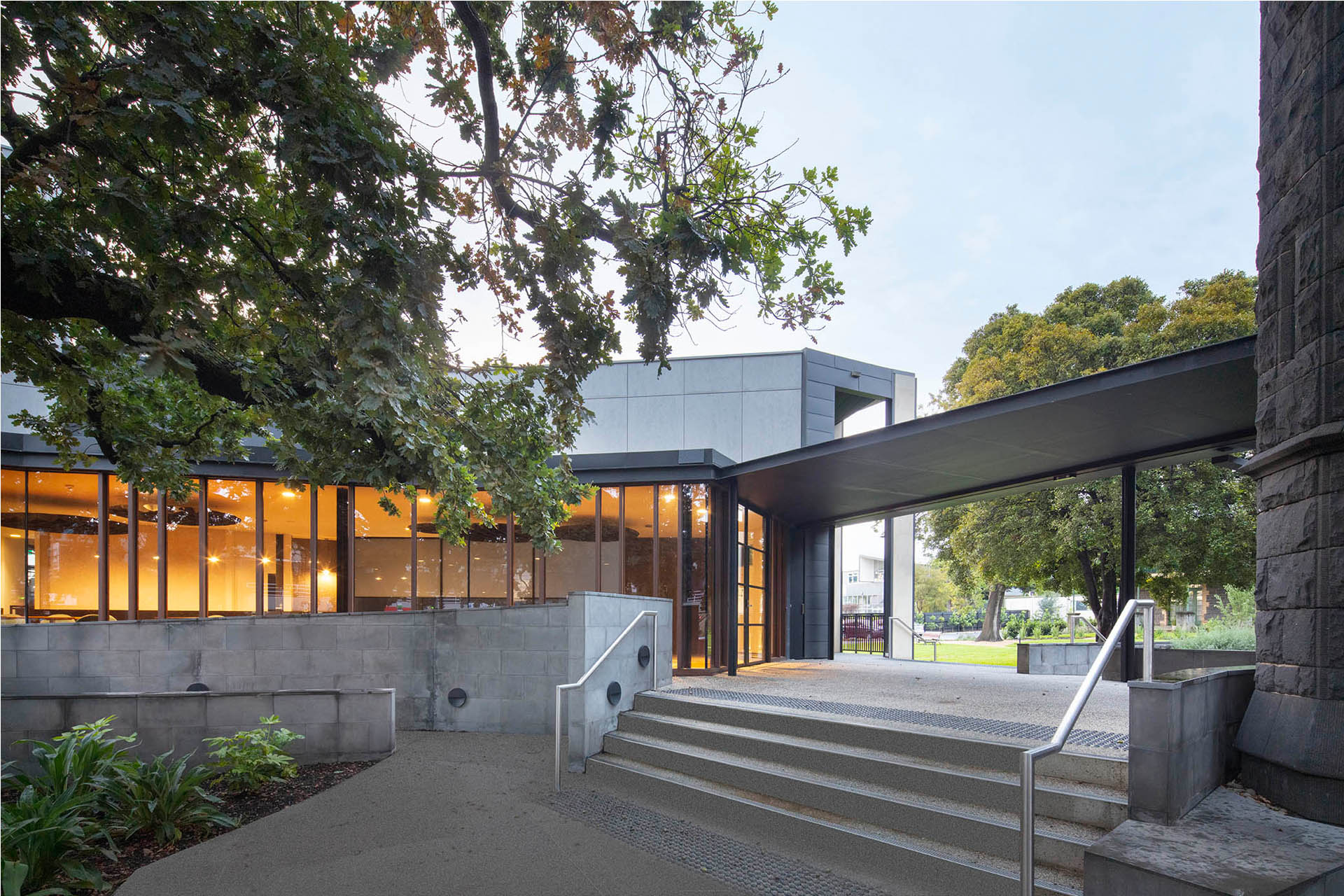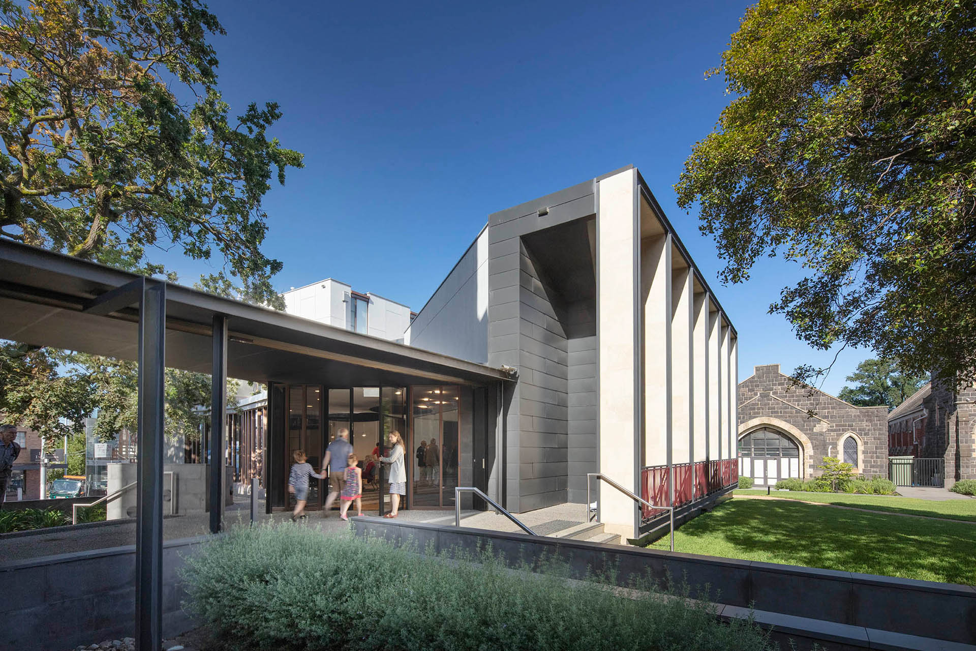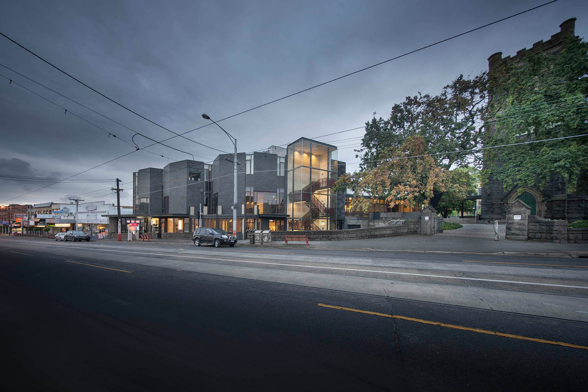 The four storey mixed use centre utilises the site’s topography to create two levels at grade: a street level providing income generating commercial tenancies with café terrace and parish offices while the church level above, connected directly into the church via its historic tower, accommodates a children’s centre, seminar complex, hospitality foyer and halls with commercial kitchen. Two levels of apartments are situated above. The complex has been designed to operate on all sides: connecting the church to Kew Junction’s commercial strip, responding to the church forecourt with its two large historic oaks, completing the historic quadrangle of nineteenth century basalt clad buildings and finally providing a secure children’s playground. The form of the building is designed to optimise viewing corridors of the 1863 church and 1913 hall while bearing witness to the range of activities within. Basalt cladding is used extensively to relate to the existing building stock while a frameless glazed staircase unites the various levels.