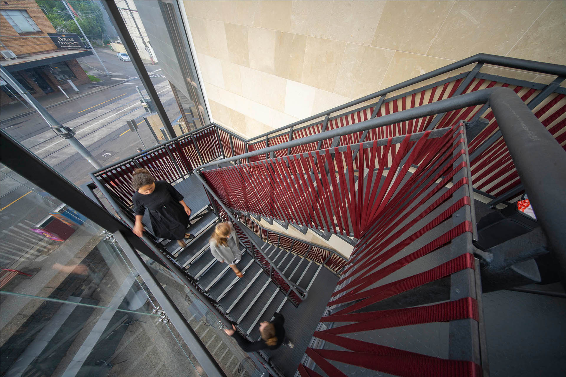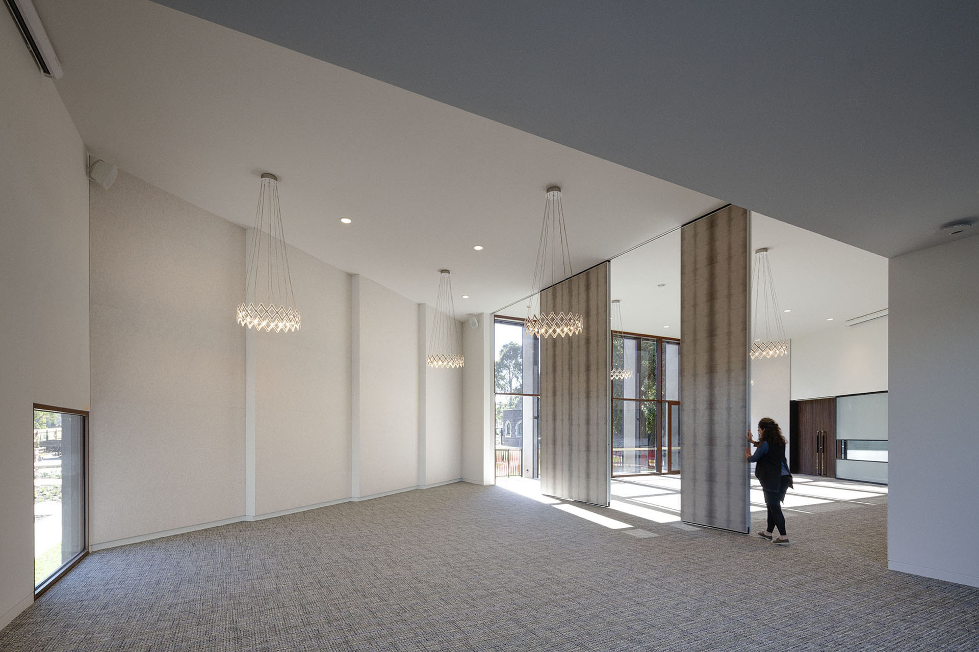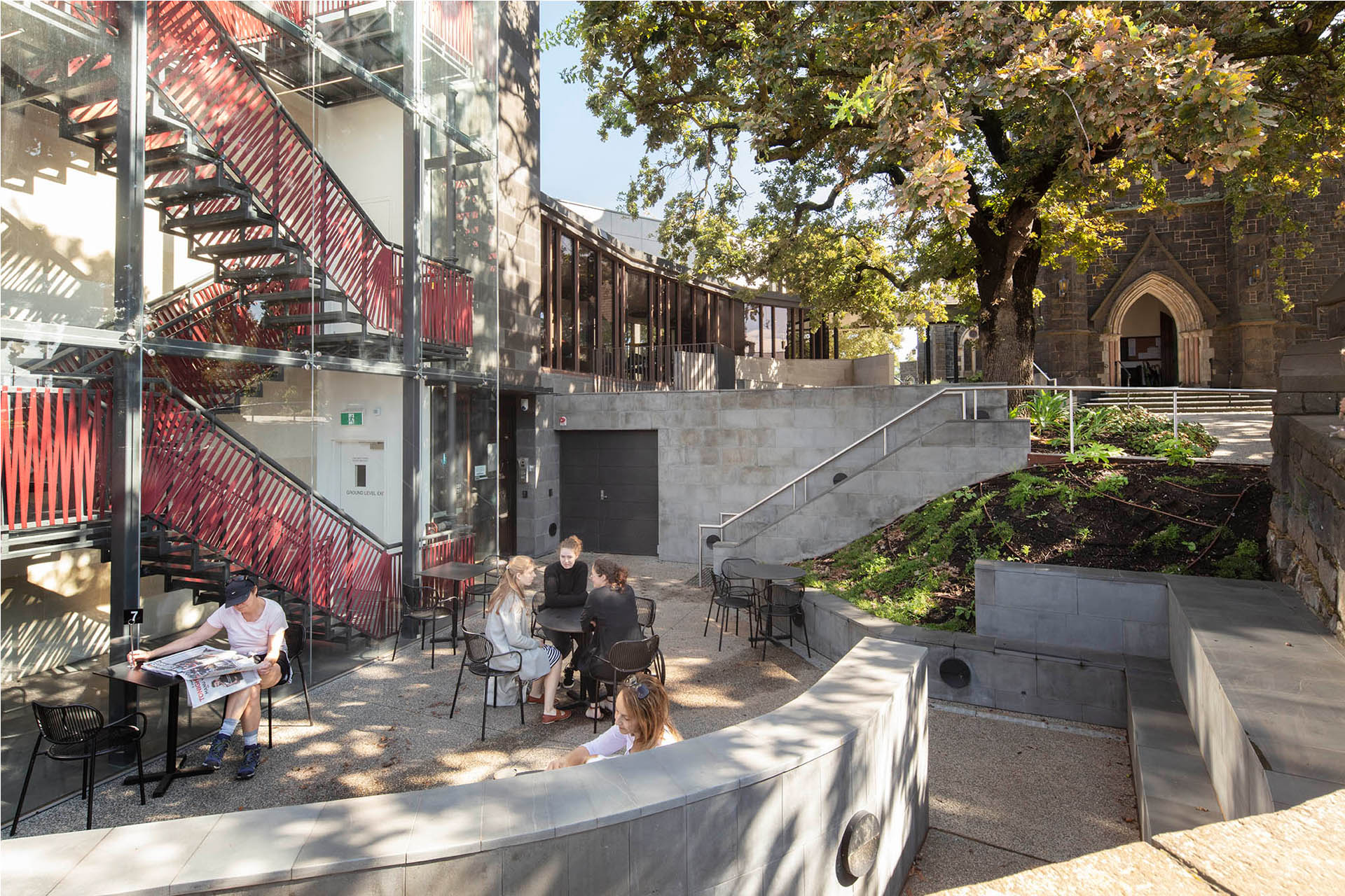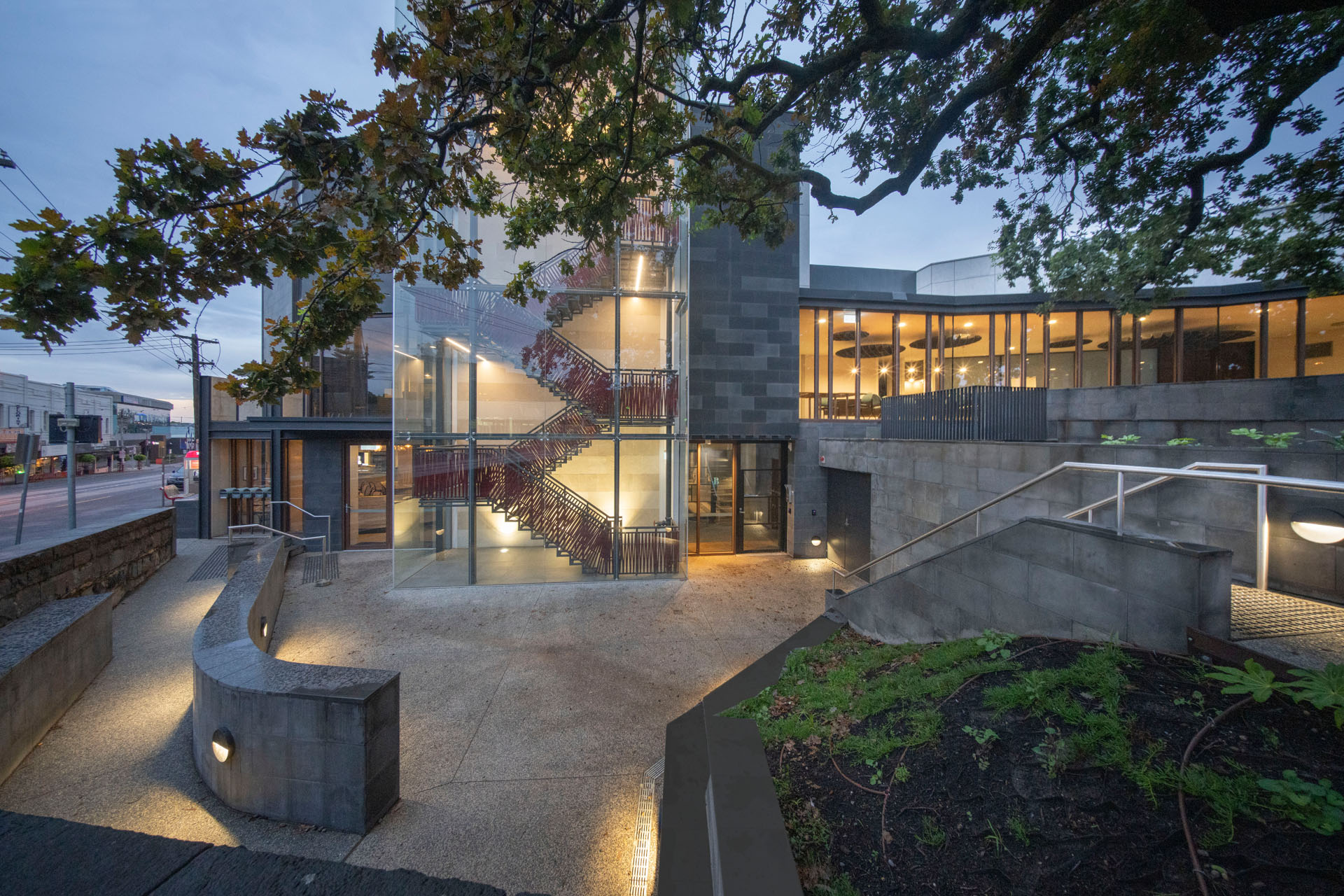 The four storey mixed use centre utilises the site’s topography to create two levels at grade: a street level providing income generating commercial tenancies with café terrace and parish offices while the church level above, connected directly into the church via its historic tower, accommodates a children’s centre, seminar complex, hospitality foyer and halls with commercial kitchen. Two levels of apartments are situated above. The complex has been designed to operate on all sides: connecting the church to Kew Junction’s commercial strip, responding to the church forecourt with its two large historic oaks, completing the historic quadrangle of nineteenth century basalt clad buildings and finally providing a secure children’s playground. The form of the building is designed to optimise viewing corridors of the 1863 church and 1913 hall while bearing witness to the range of activities within. Basalt cladding is used extensively to relate to the existing building stock while a frameless glazed staircase unites the various levels.