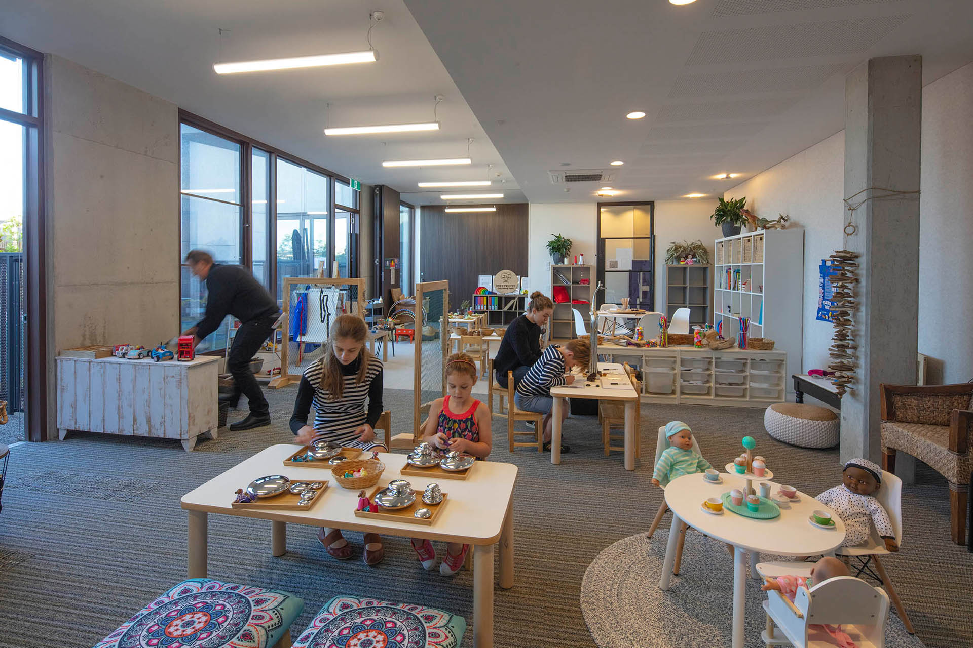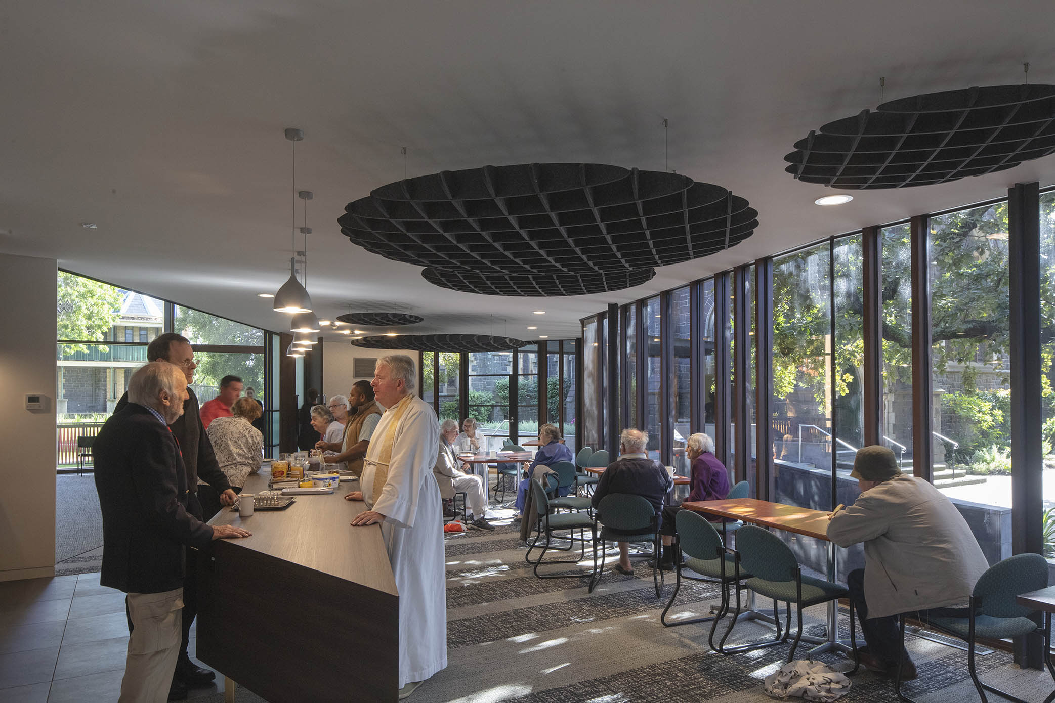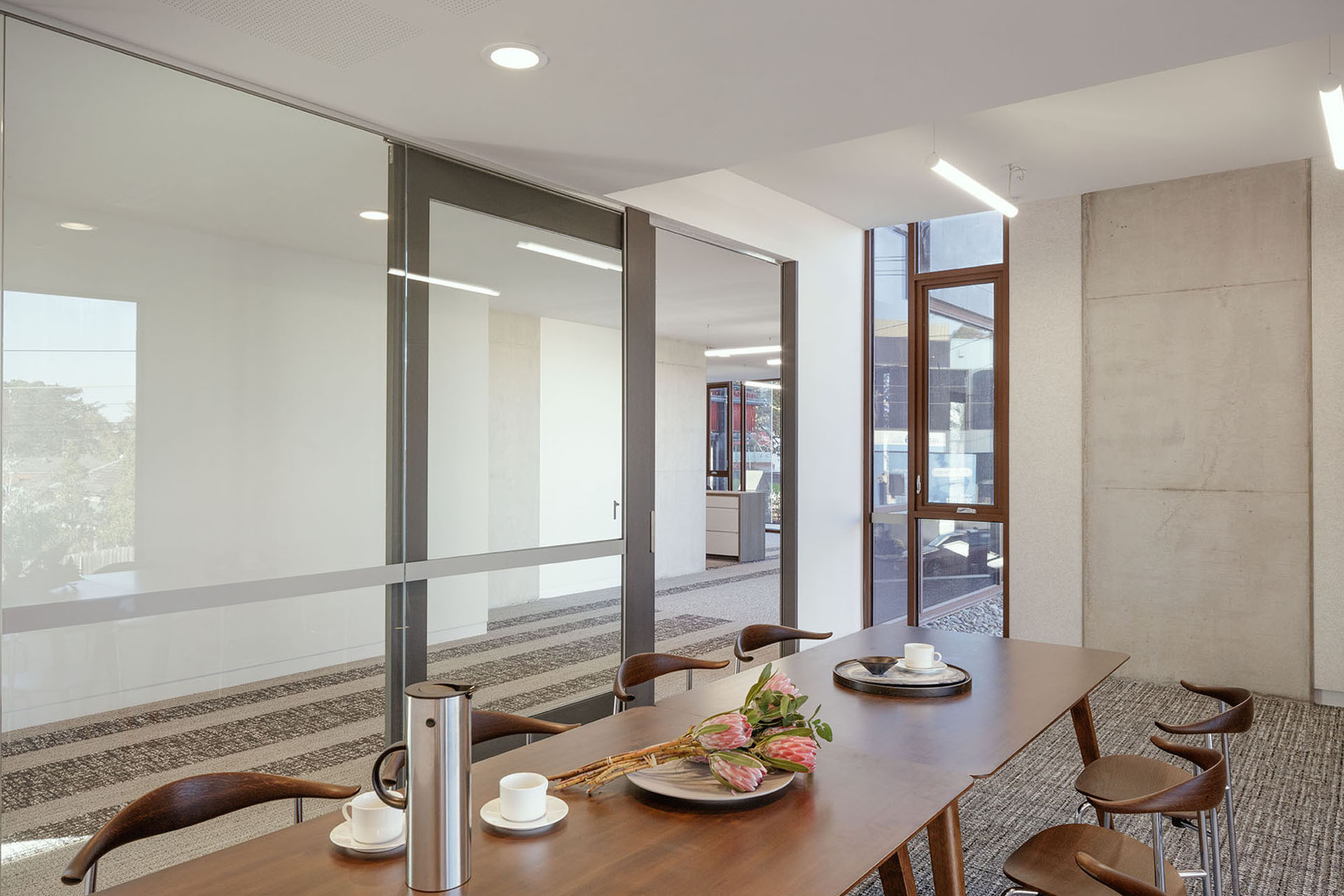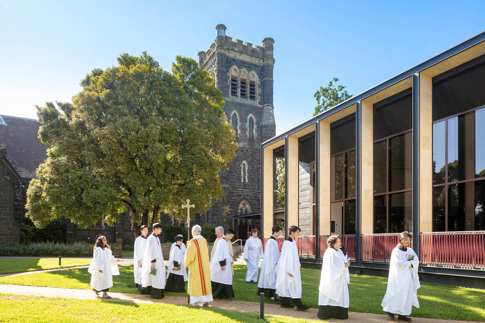 The four storey mixed use centre utilises the site’s topography to create two levels at grade: a street level providing income generating commercial tenancies with café terrace and parish offices while the church level above, connected directly into the church via its historic tower, accommodates a children’s centre, seminar complex, hospitality foyer and halls with commercial kitchen. Two levels of apartments are situated above. The complex has been designed to operate on all sides: connecting the church to Kew Junction’s commercial strip, responding to the church forecourt with its two large historic oaks, completing the historic quadrangle of nineteenth century basalt clad buildings and finally providing a secure children’s playground. The form of the building is designed to optimise viewing corridors of the 1863 church and 1913 hall while bearing witness to the range of activities within. Basalt cladding is used extensively to relate to the existing building stock while a frameless glazed staircase unites the various levels.
