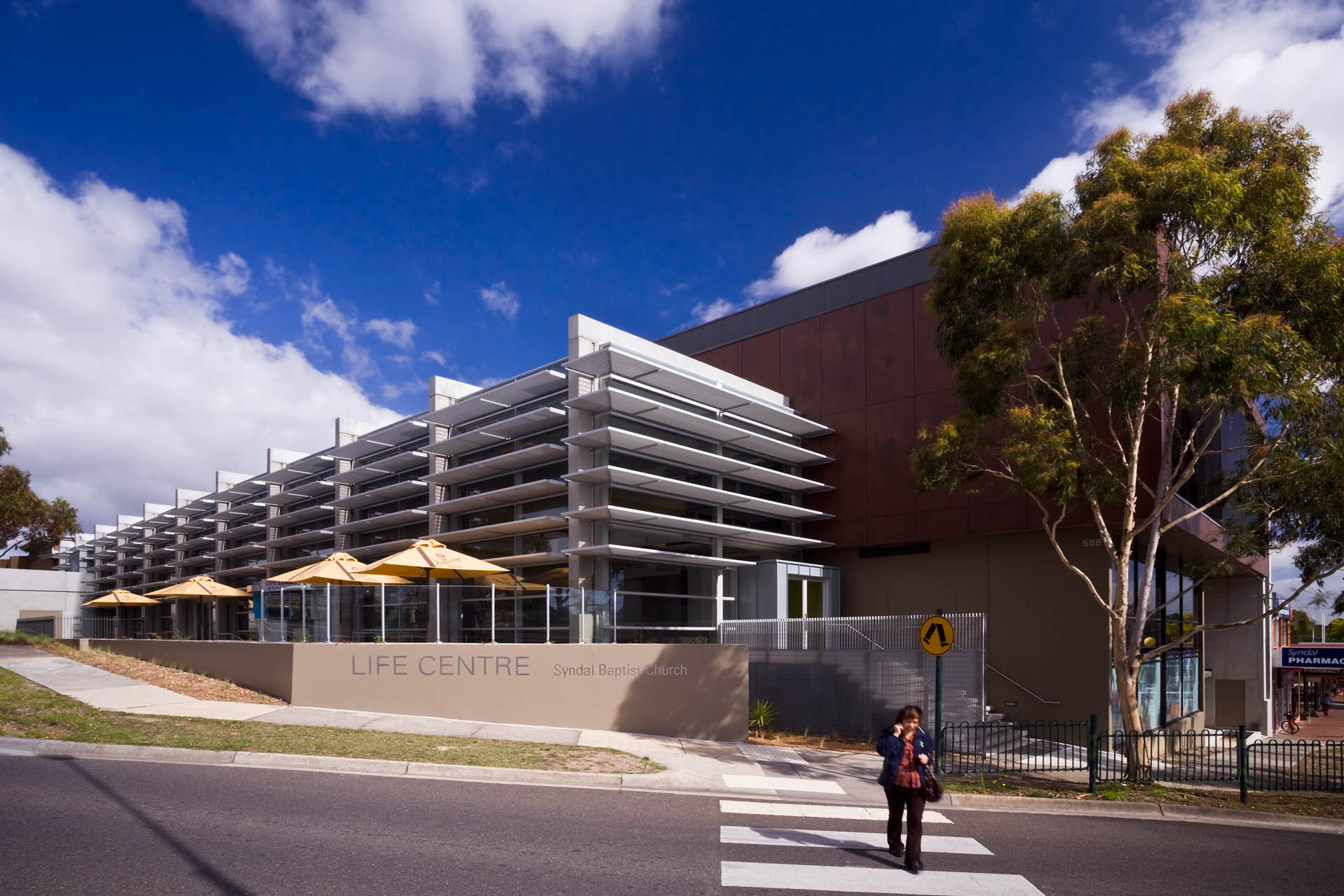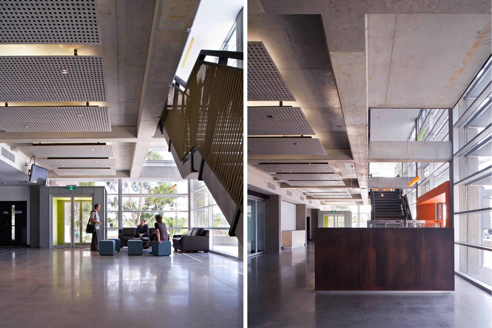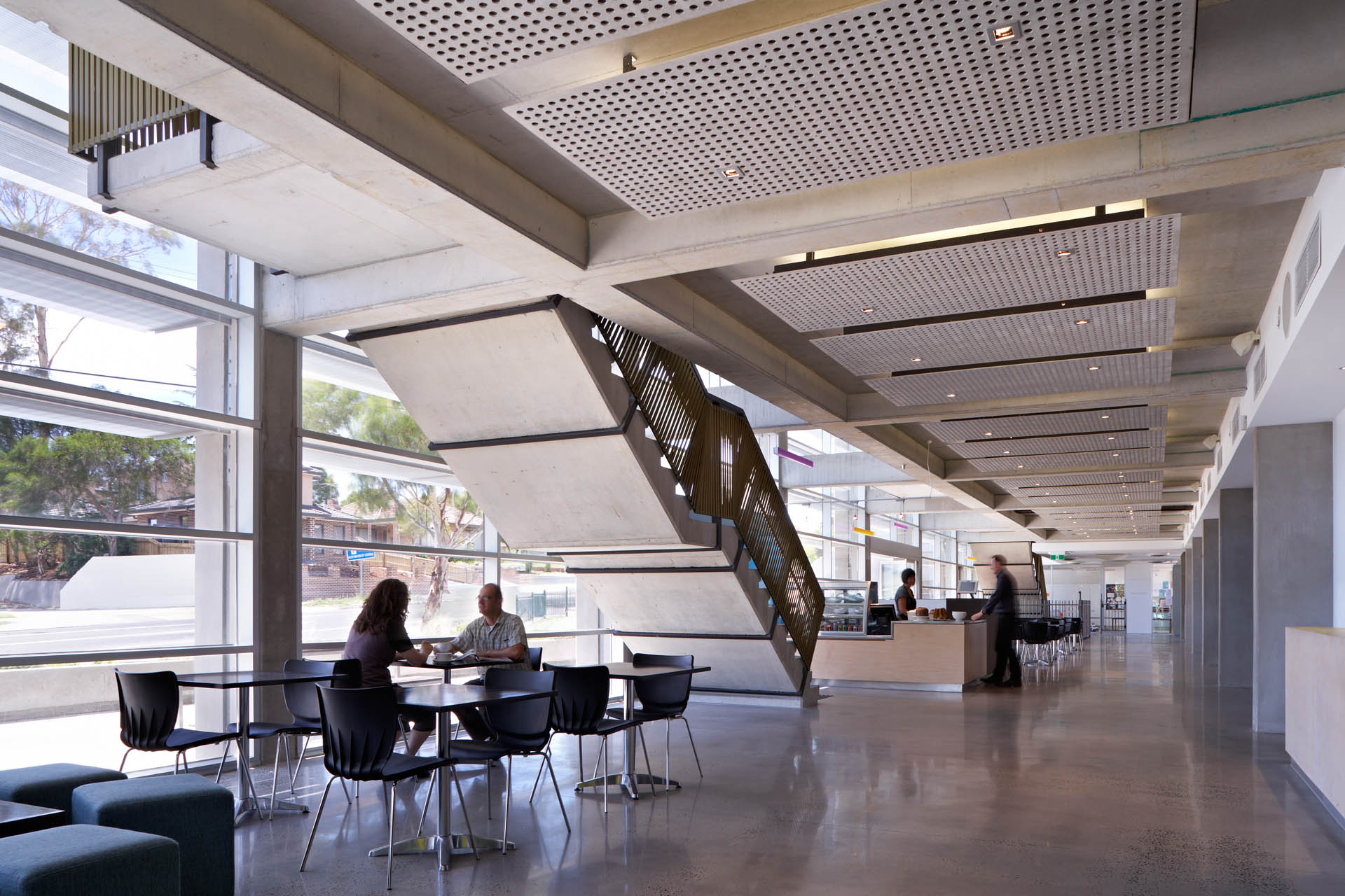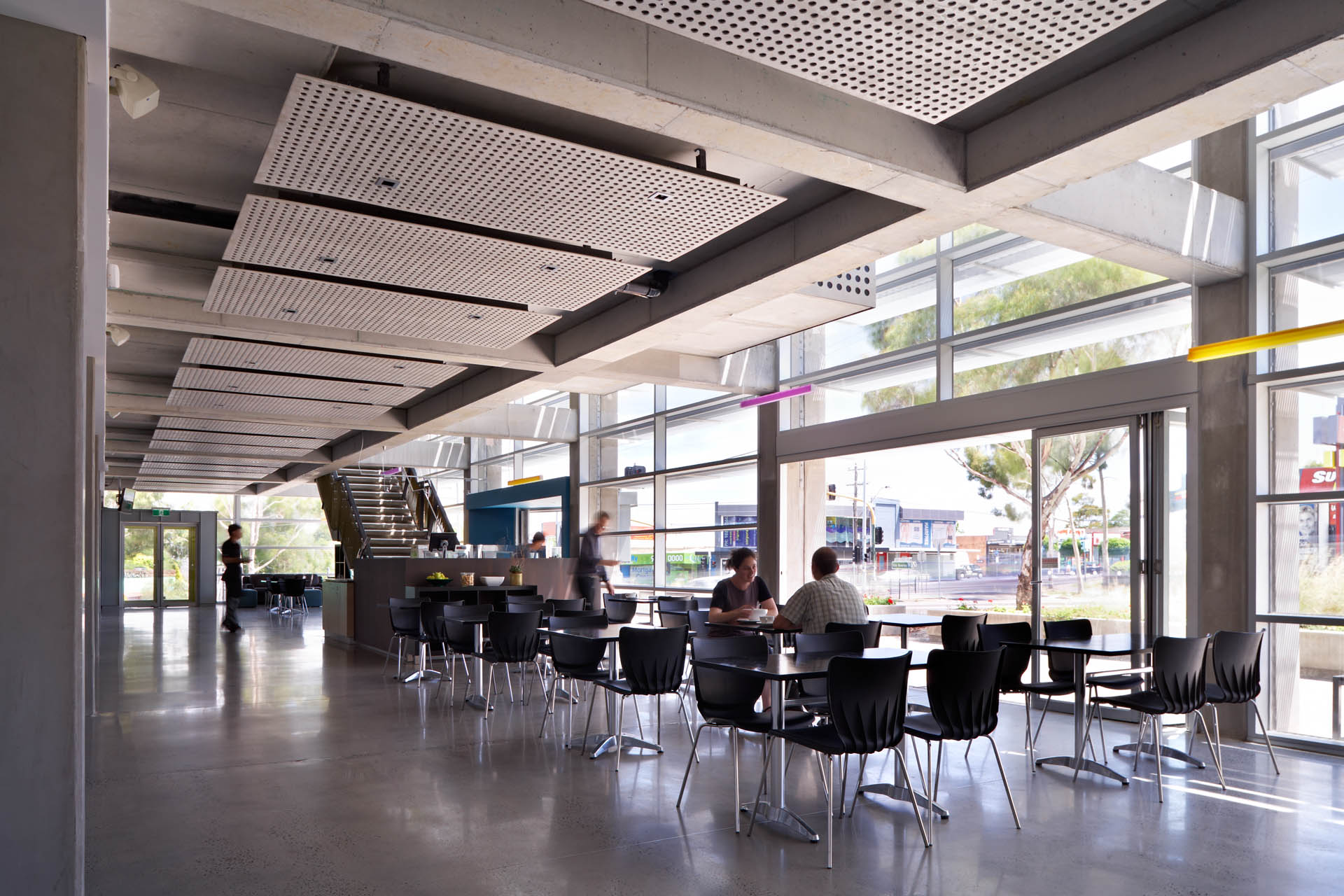 The café is situated front of house of the Life Centre as a linear inside-outside meeting space interconnecting people and activities with meeting rooms along its length and a childrens’ play area at one end. A fully glazed northern façade floods the space with daylight and a series of folding doors provide connection to an outside terrace. Polished concrete floors, expressed trabeated structure with suspended perforated acoustic panels over characterize the space. The projecting coffee shop with its external servery and brightly finished interior provides a visual and active focus to the space. At night the activation of suspended coloured fluorescent lighting hanging within the two storey void of the spine transforms the space into a distinctive nocturnal local urban identity.