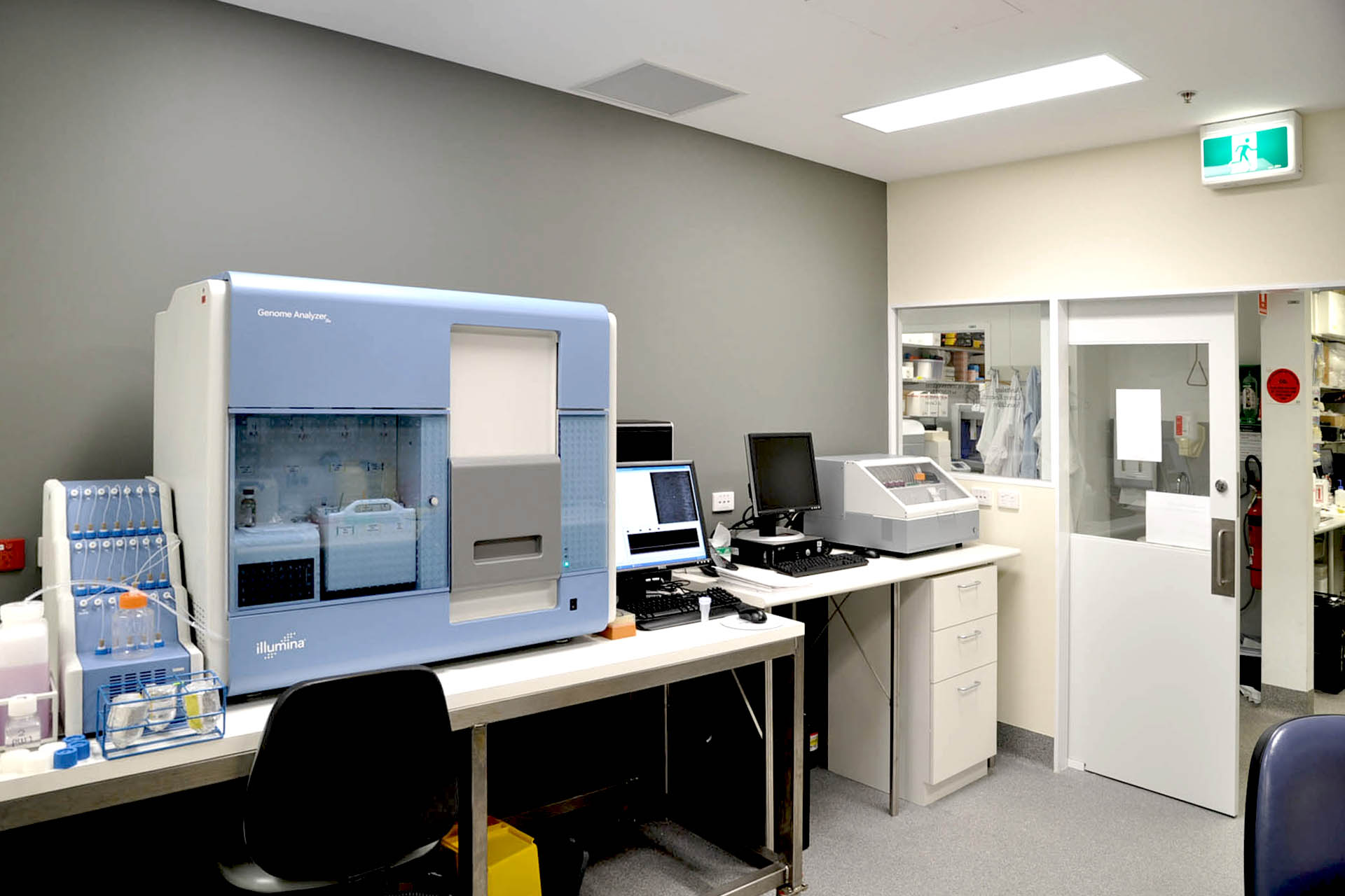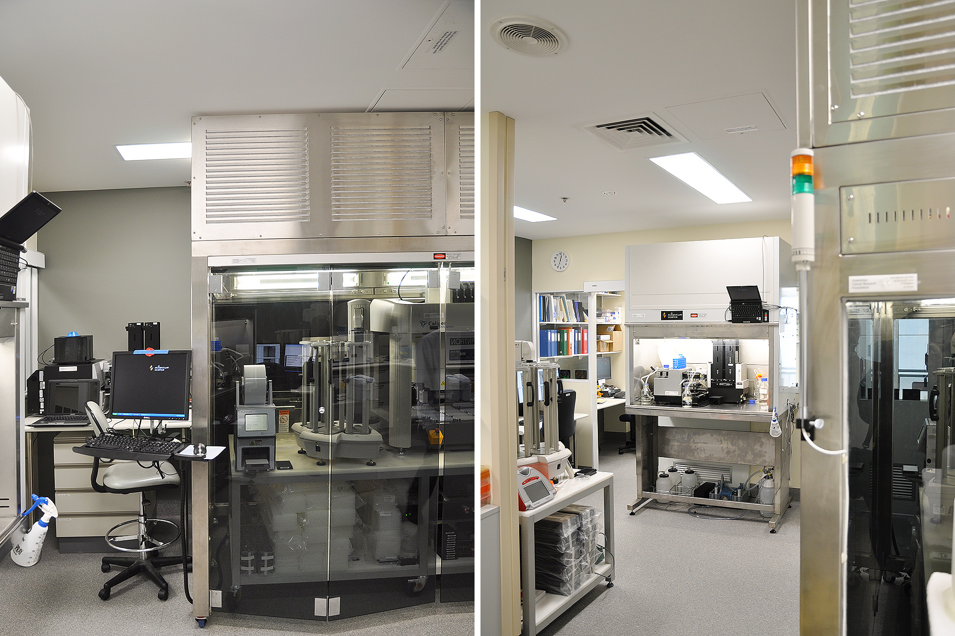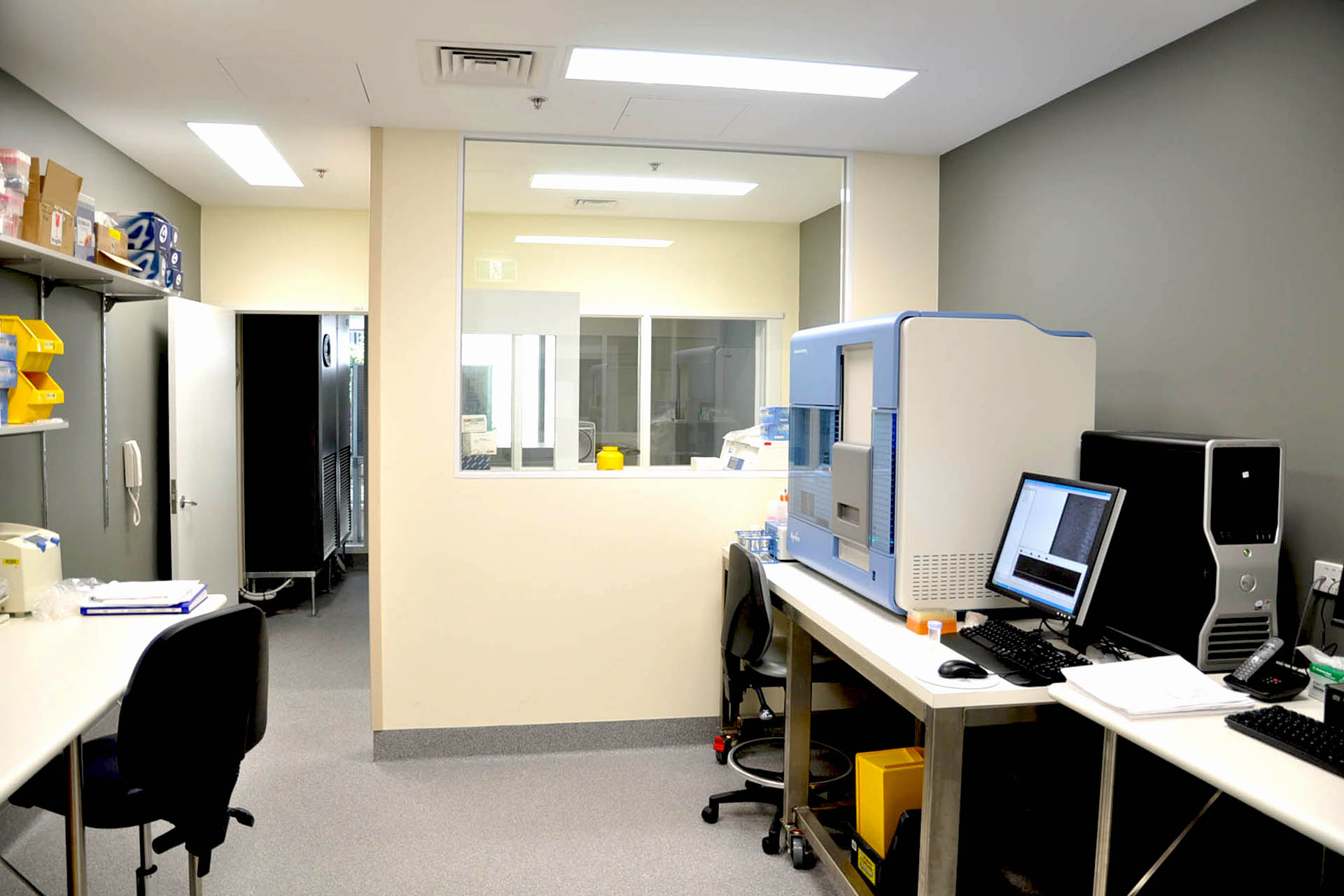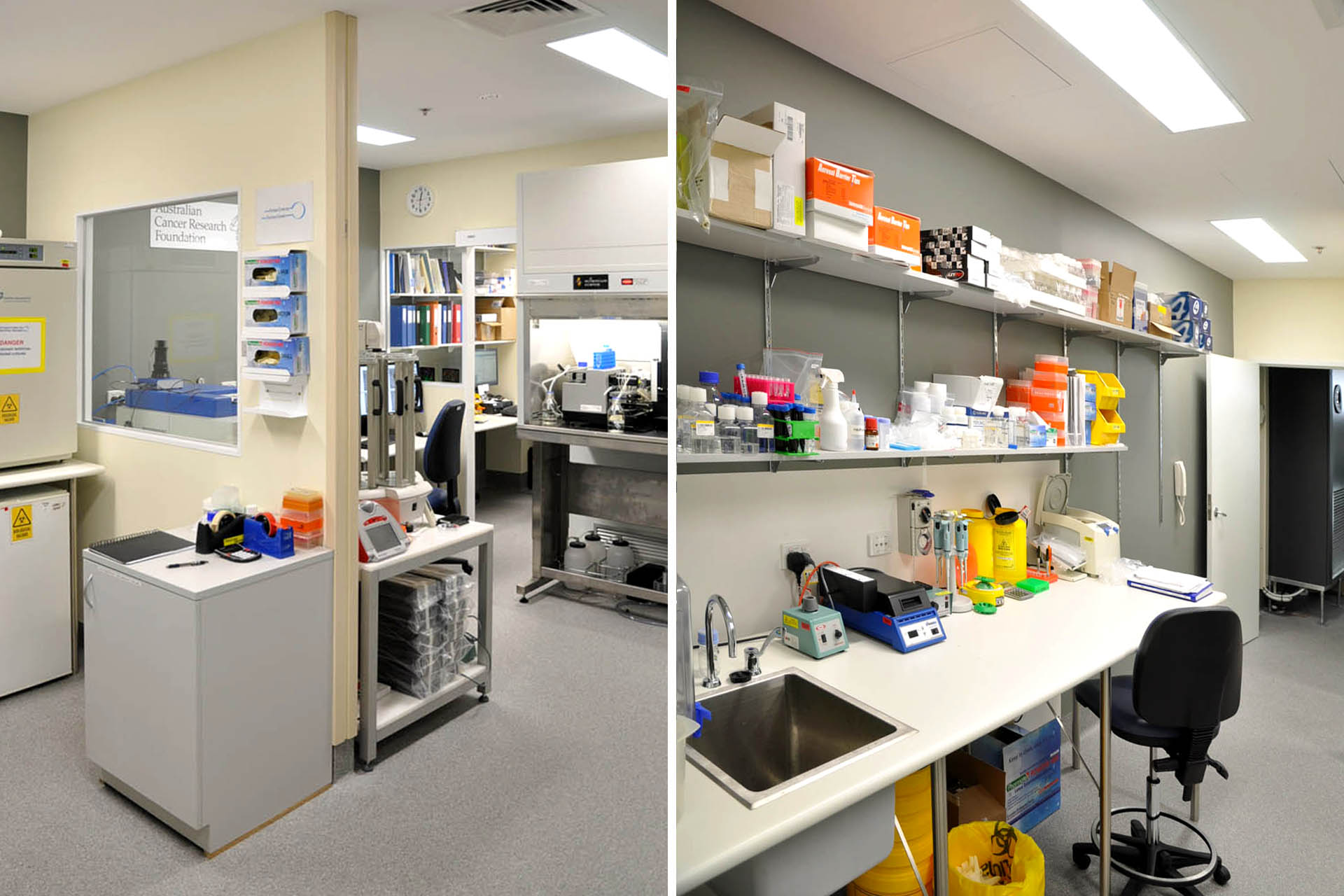 This laboratory was funded by the Australian Cancer Research Foundation as a genomics research laboratory. The fitout has two parts: a screening room with freezer centrifuge room and office; a Next GEN sequencing room with PCR setup room and computer support room. The project had a significant requirement for maintaining set ambient room temperature conditions with positive pressure and equipment specific exhaust hoods.