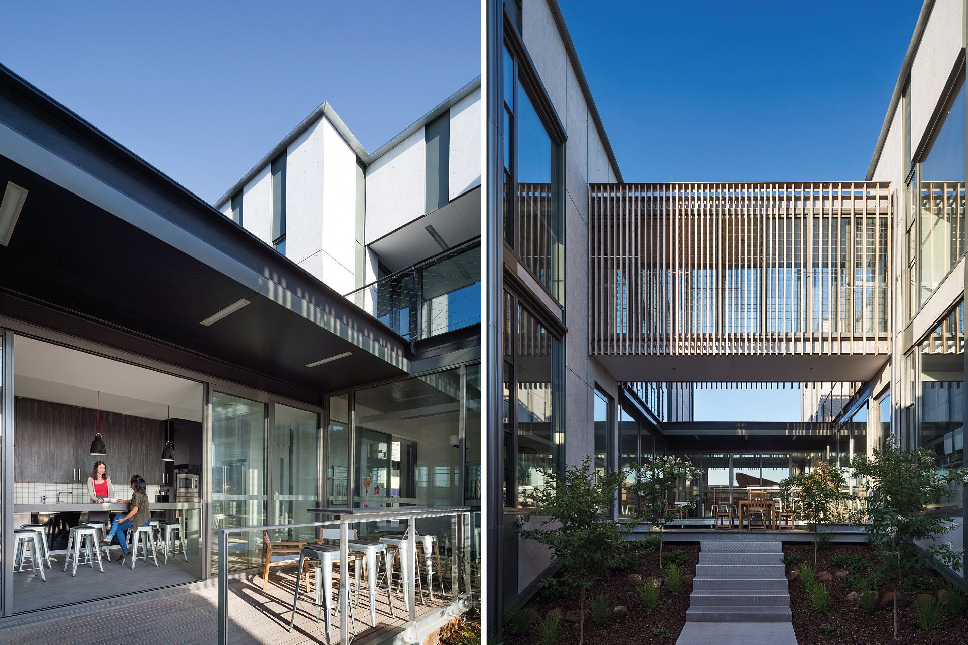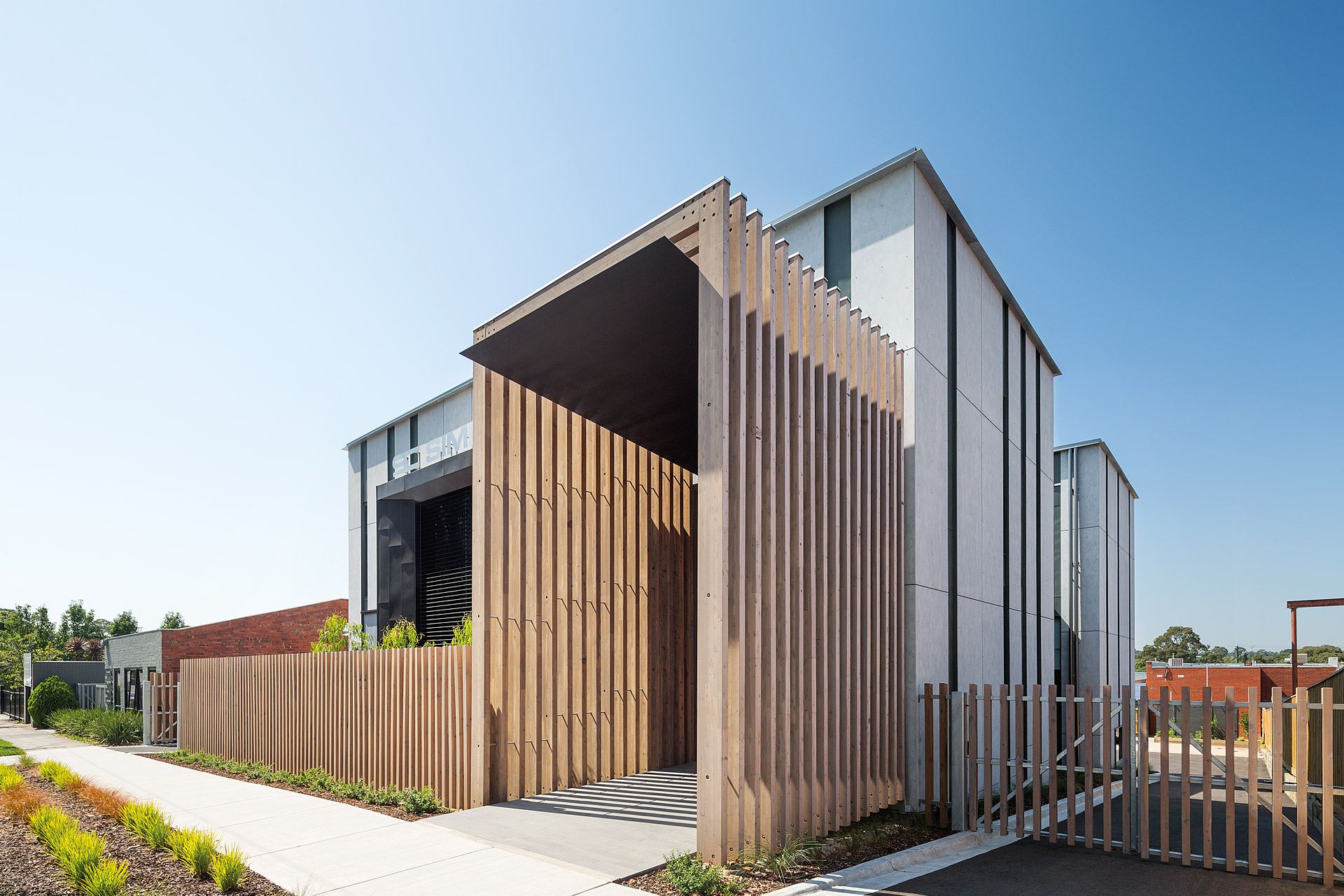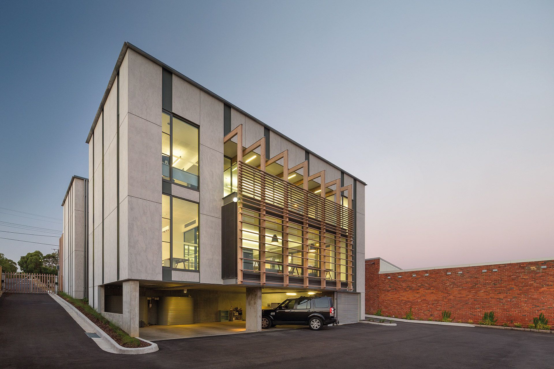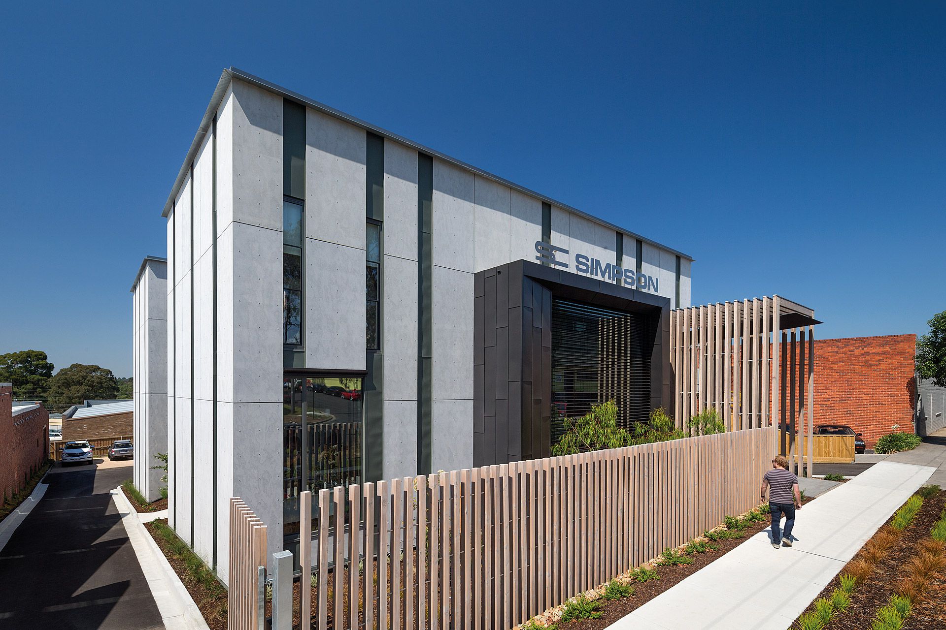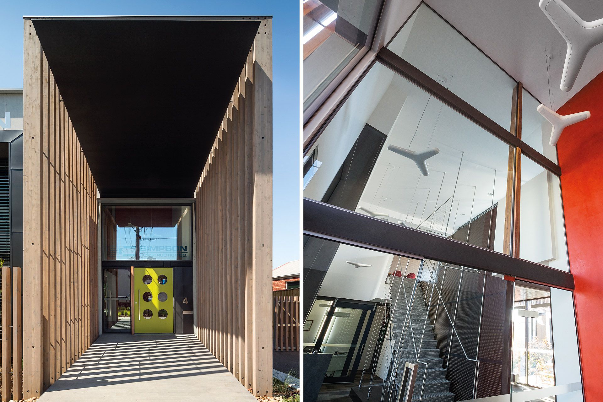Two pavilions accommodate an interconnecting array of internal and external spaces providing flexible office facilities for Simpson Construction Co. The zinc striated cement clad pavilions are linked by a lower level communal staff kitchenette and an upper level glazed bridge forming a central courtyard. Laminated cypress pine battens with their patination of light and shade compliment the sheer finishes of the pavilion forms. Photovoltaic power generation and rain harvesting contribute to the offices’ environmentally sustainable character.