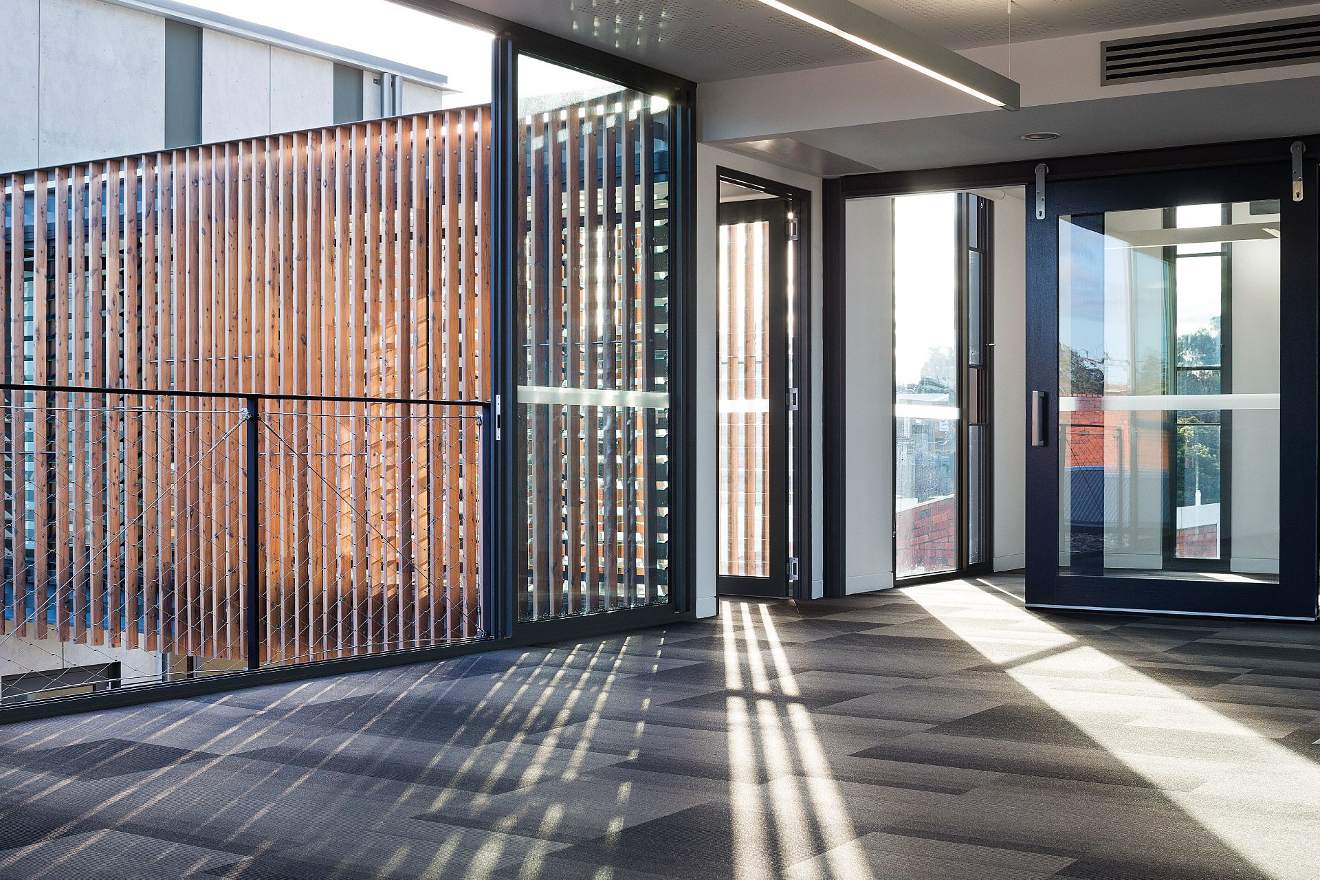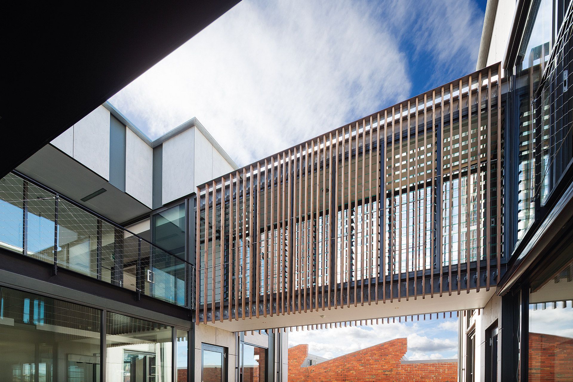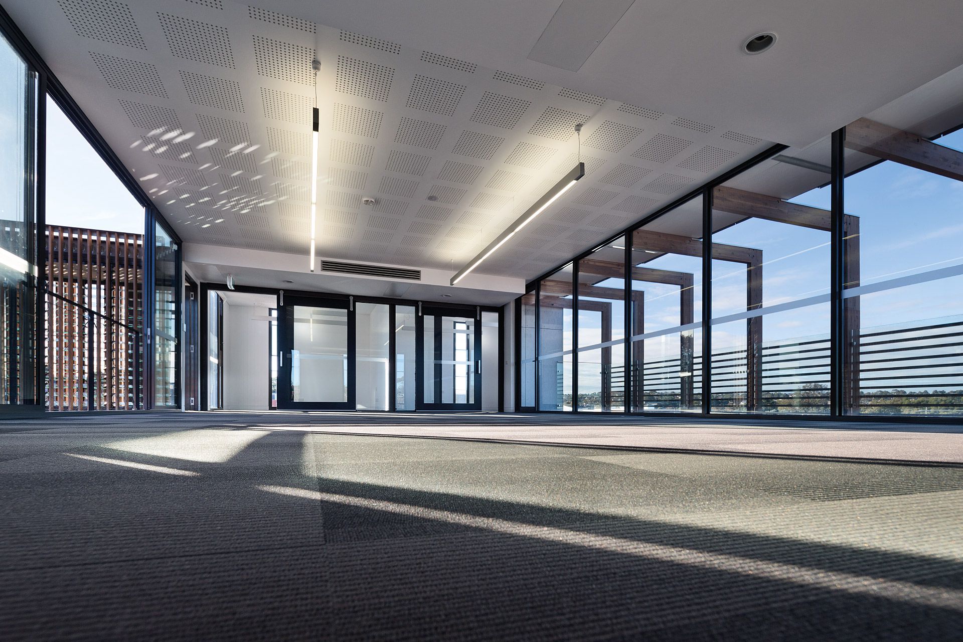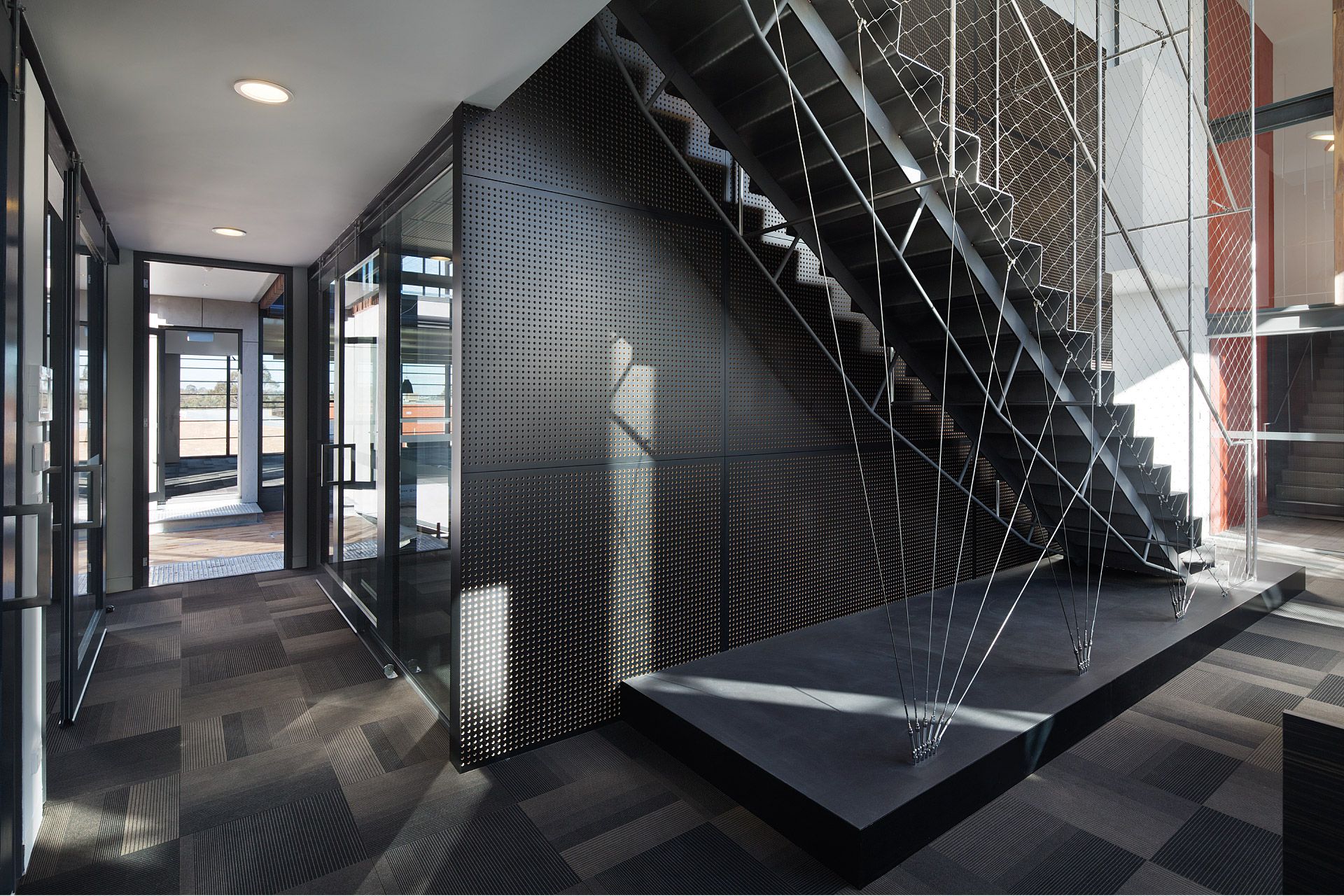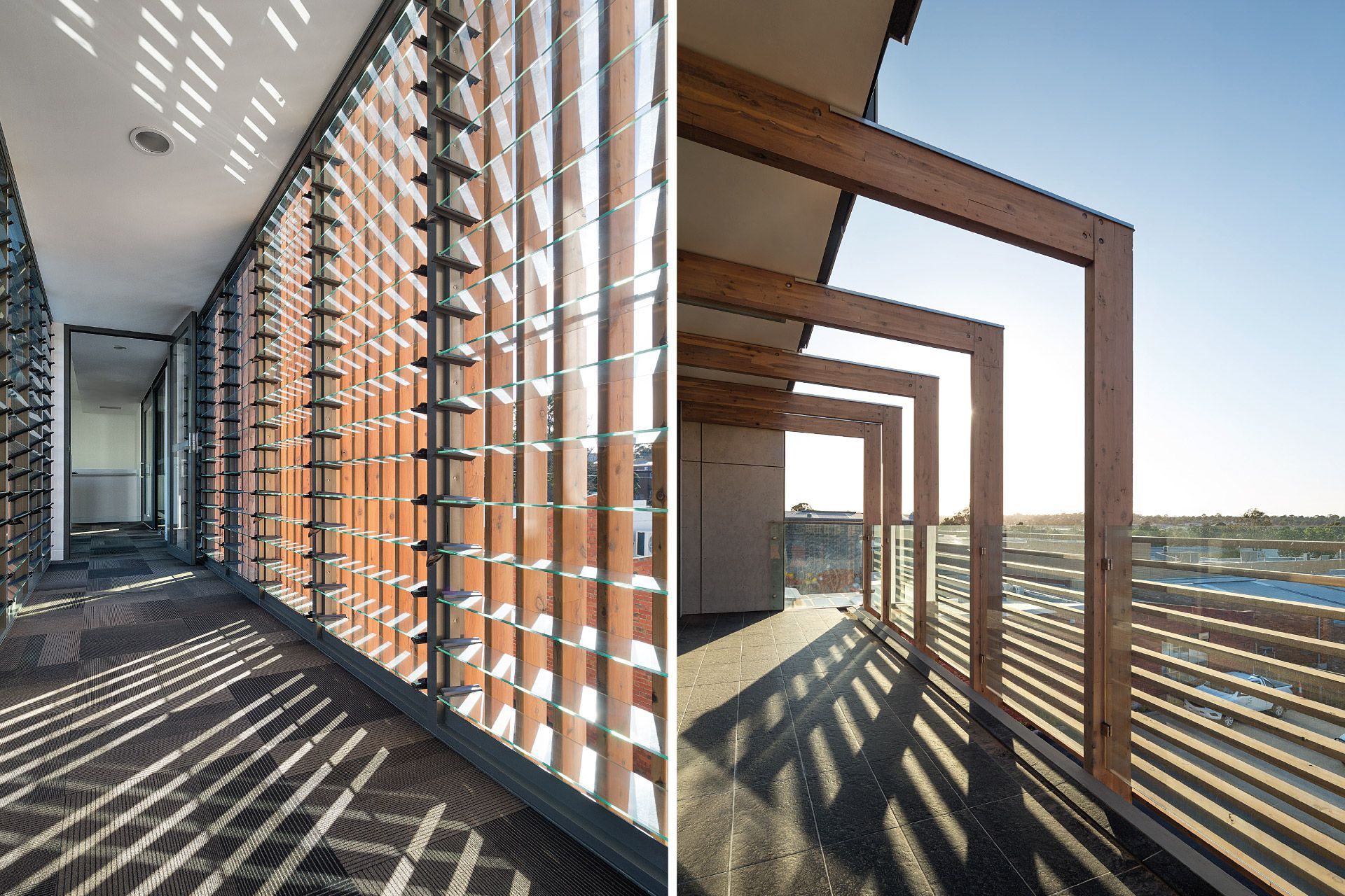 Two pavilions accommodate an interconnecting array of internal and external spaces providing flexible office facilities for Simpson Construction Co. The zinc striated cement clad pavilions are linked by a lower level communal staff kitchenette and an upper level glazed bridge forming a central courtyard. Laminated cypress pine battens with their patination of light and shade compliment the sheer finishes of the pavilion forms. Photovoltaic power generation and rain harvesting contribute to the offices’ environmentally sustainable character.