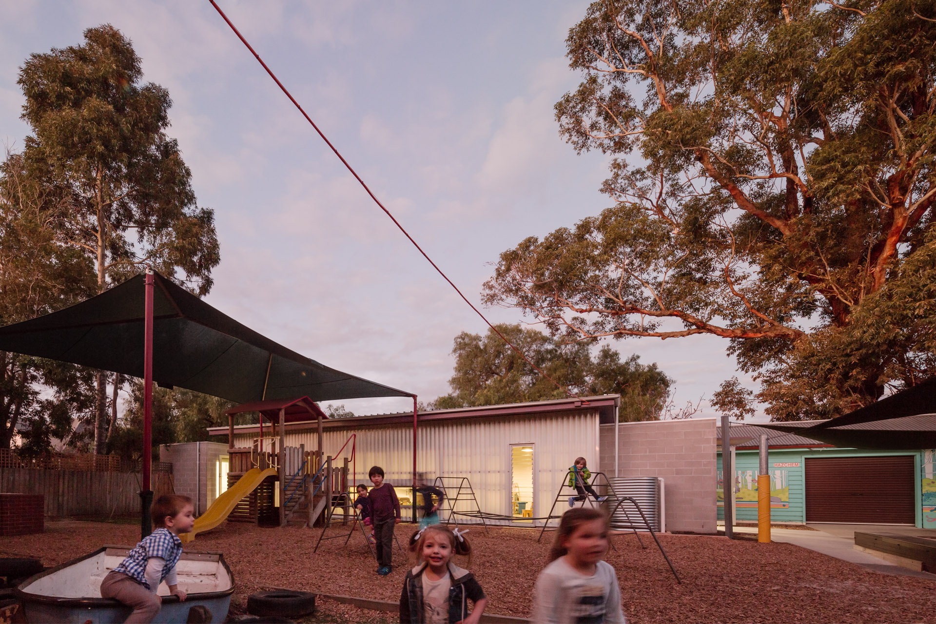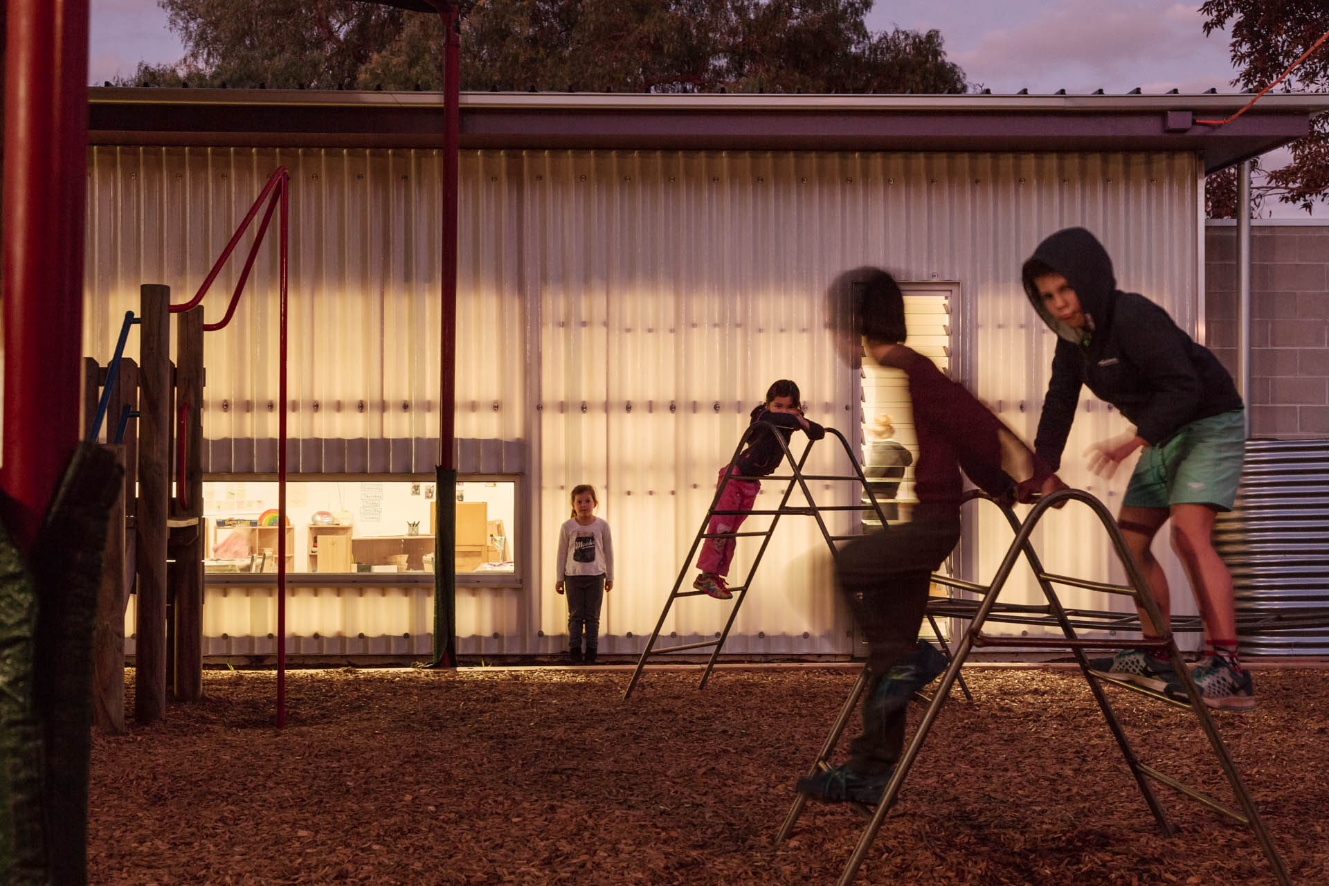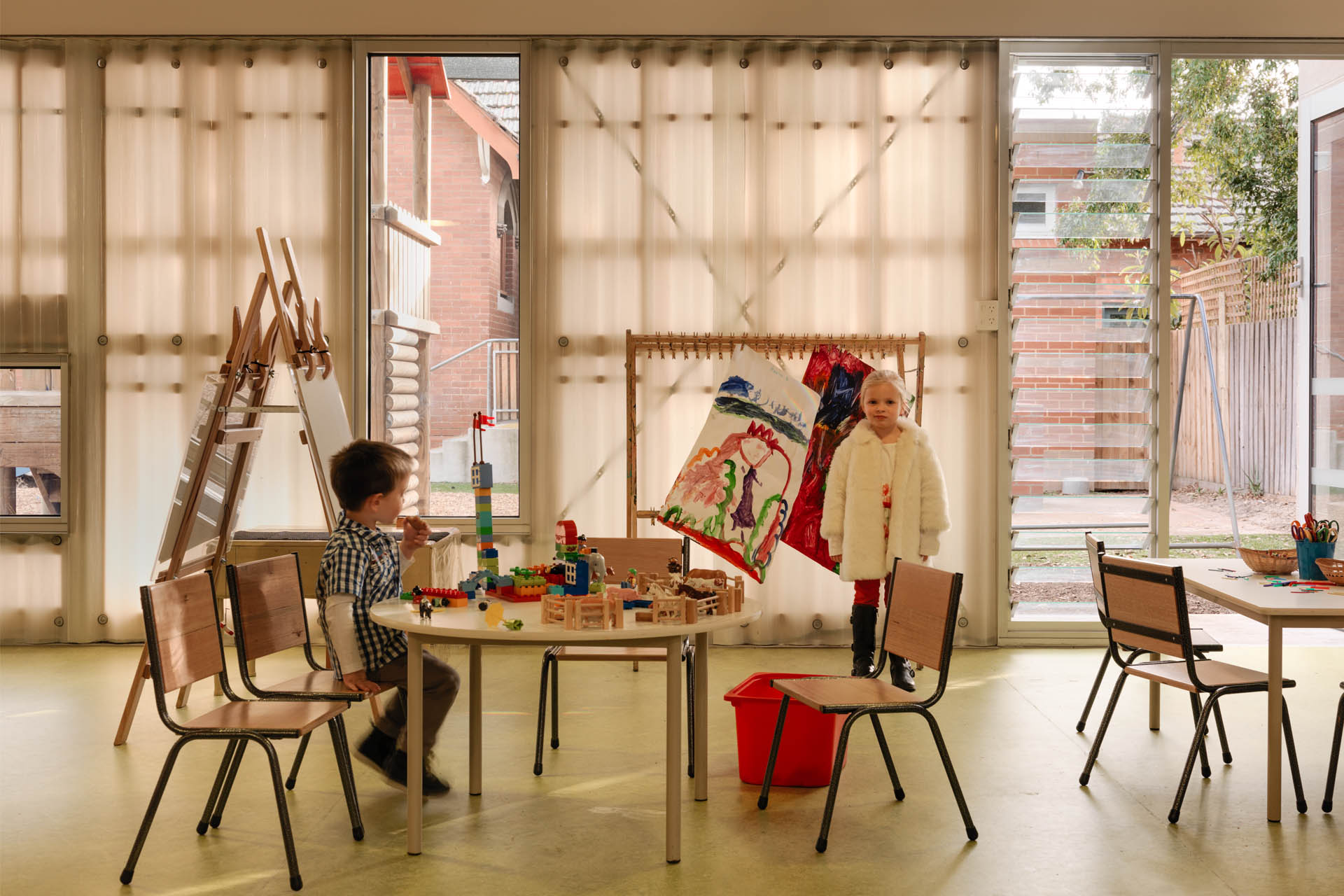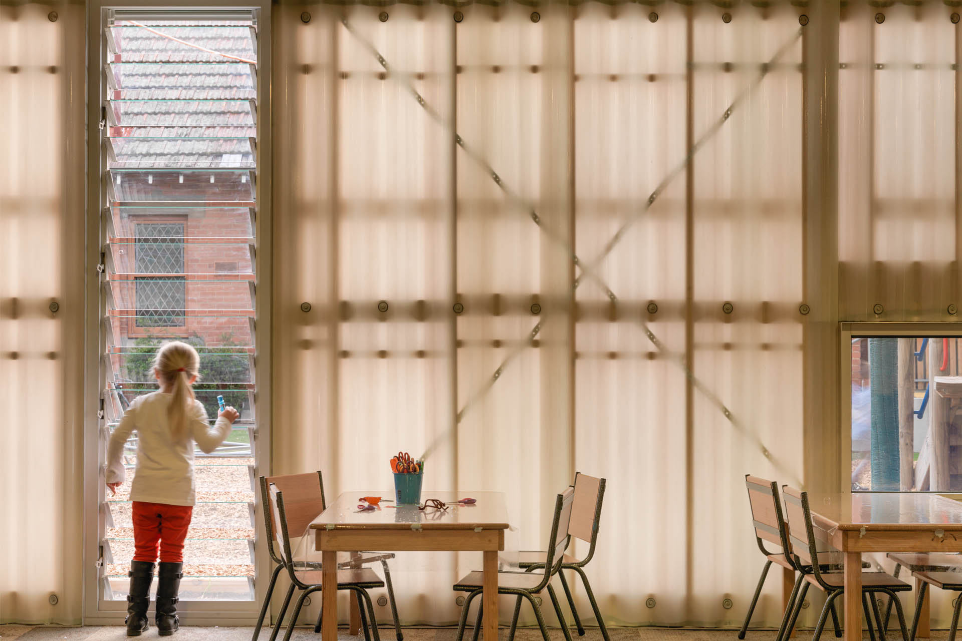 A translucent double skinned curtain of ribbed polyester is drawn to separate inside and outside of this free standing kindergarten for four year old children. Port holes of clear glazing allow the children to see through to the playground and to be seen. The central form is bookended by concrete block clad amenities which facilitate cross ventilation and enable a broader ingress of natural daylight. The children’s room is articulated by exposed timber posi-struts which also form contiguous opportunities for hanging artwork and displays, punctuated by broad industrial pendants. Neutral coloured carpet planks and vivid green resilient flooring demarcate the space into wet and dry activity areas.