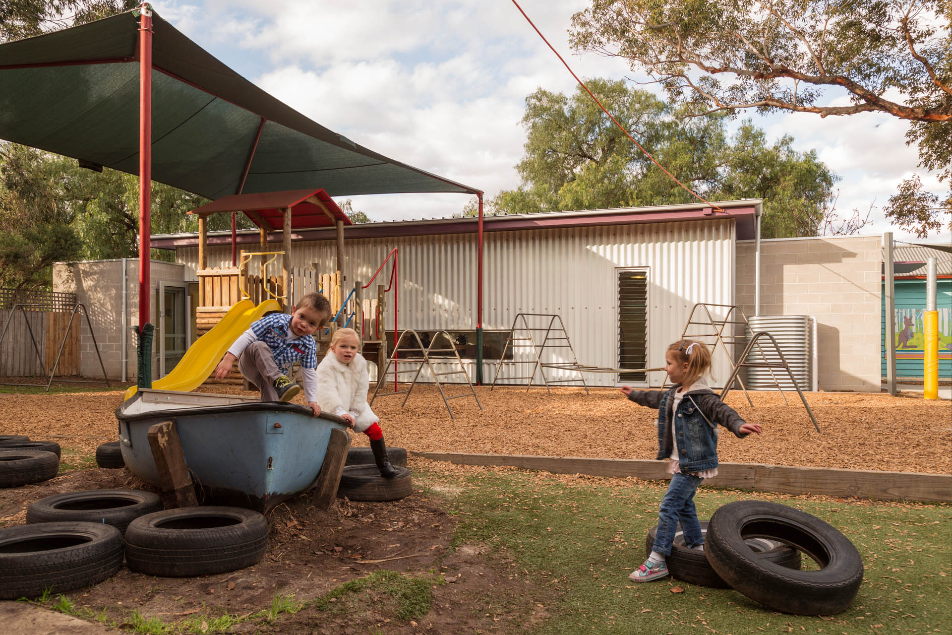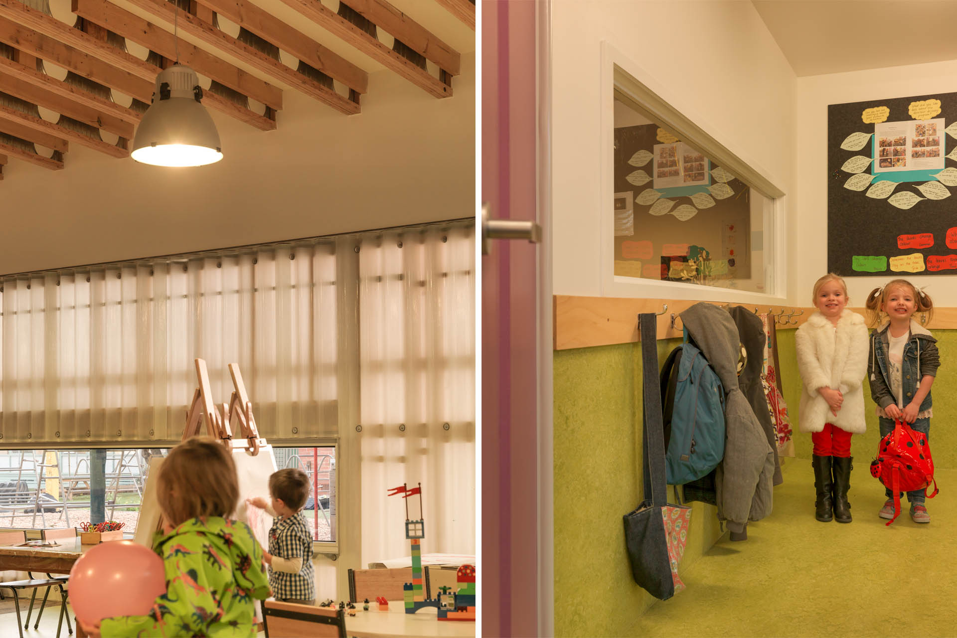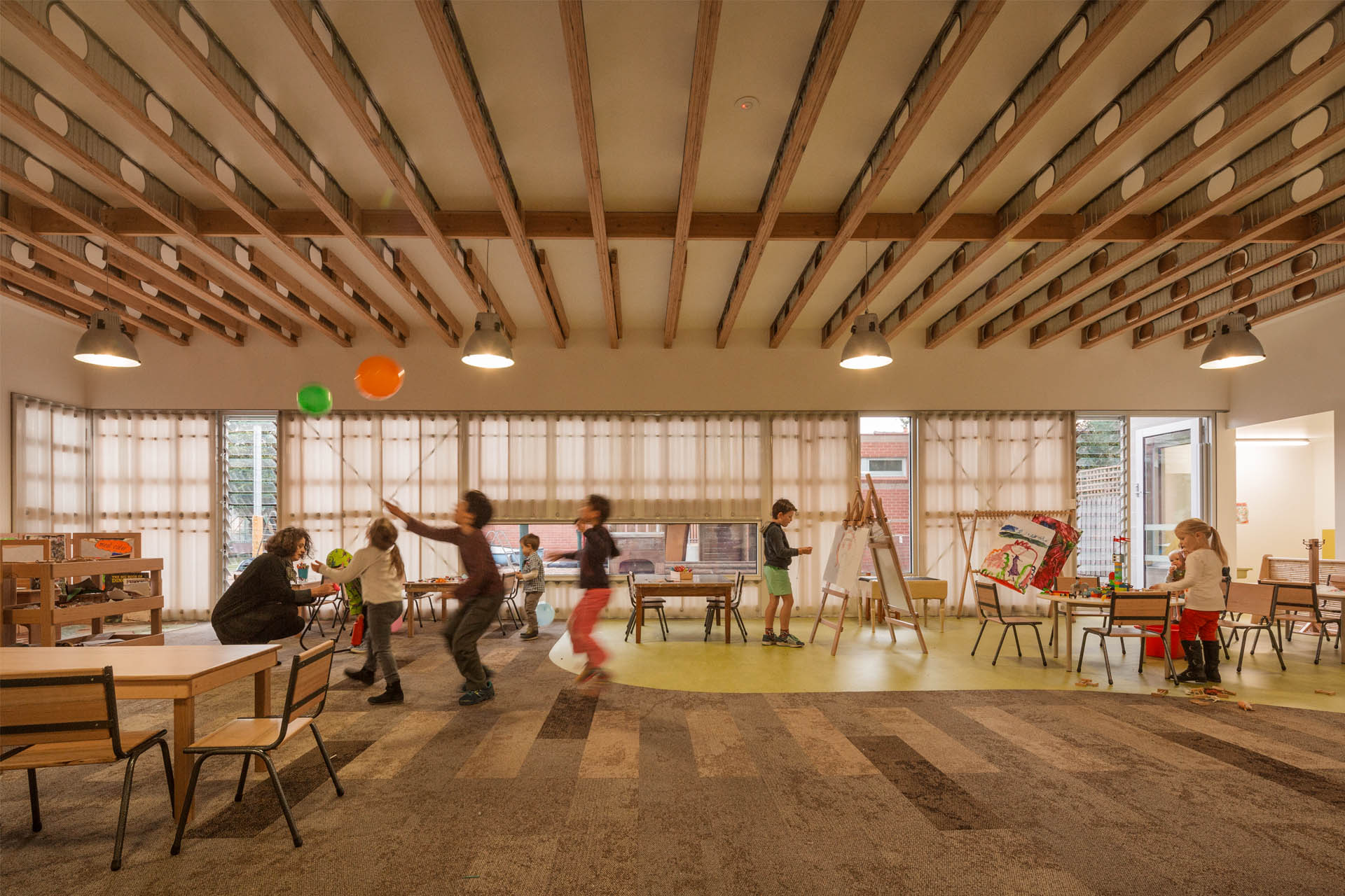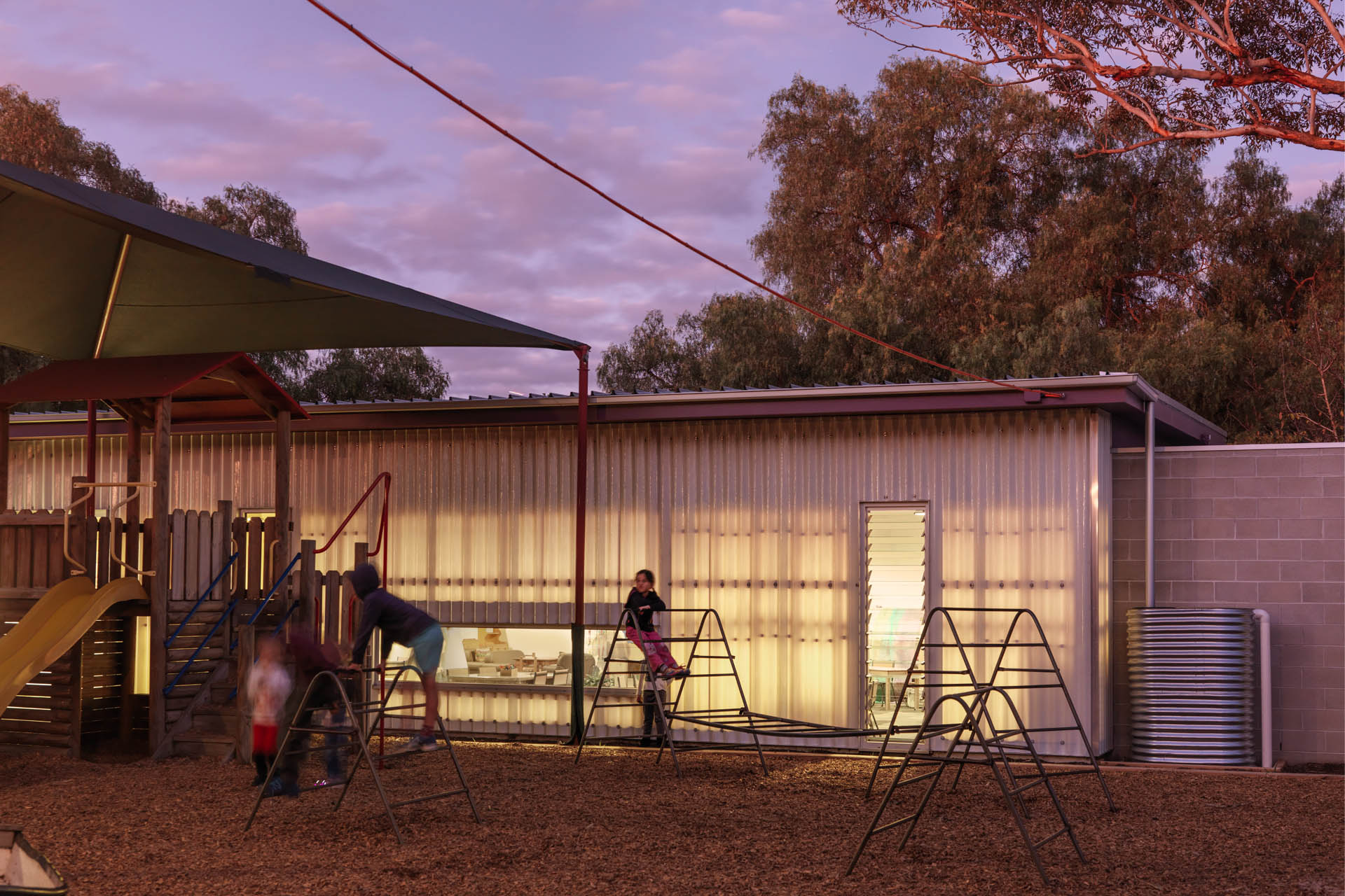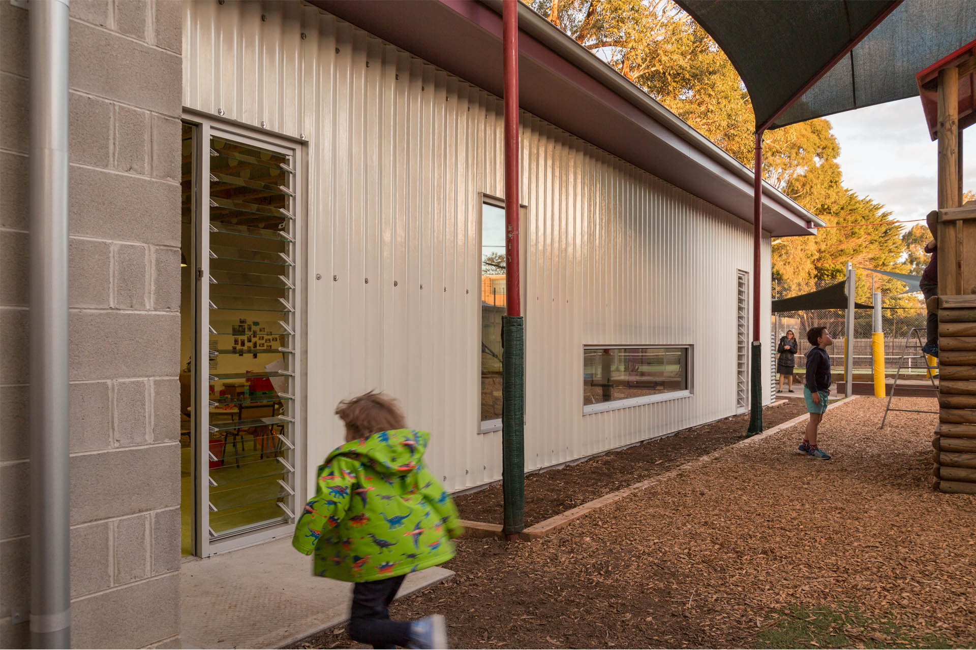 A translucent double skinned curtain of ribbed polyester is drawn to separate inside and outside of this free standing kindergarten for four year old children. Port holes of clear glazing allow the children to see through to the playground and to be seen. The central form is bookended by concrete block clad amenities which facilitate cross ventilation and enable a broader ingress of natural daylight. The children’s room is articulated by exposed timber posi-struts which also form contiguous opportunities for hanging artwork and displays, punctuated by broad industrial pendants. Neutral coloured carpet planks and vivid green resilient flooring demarcate the space into wet and dry activity areas.