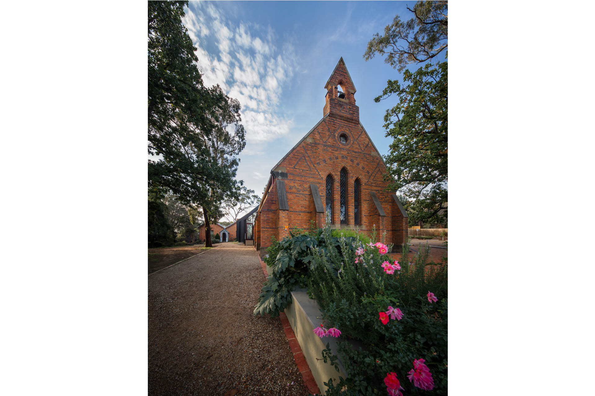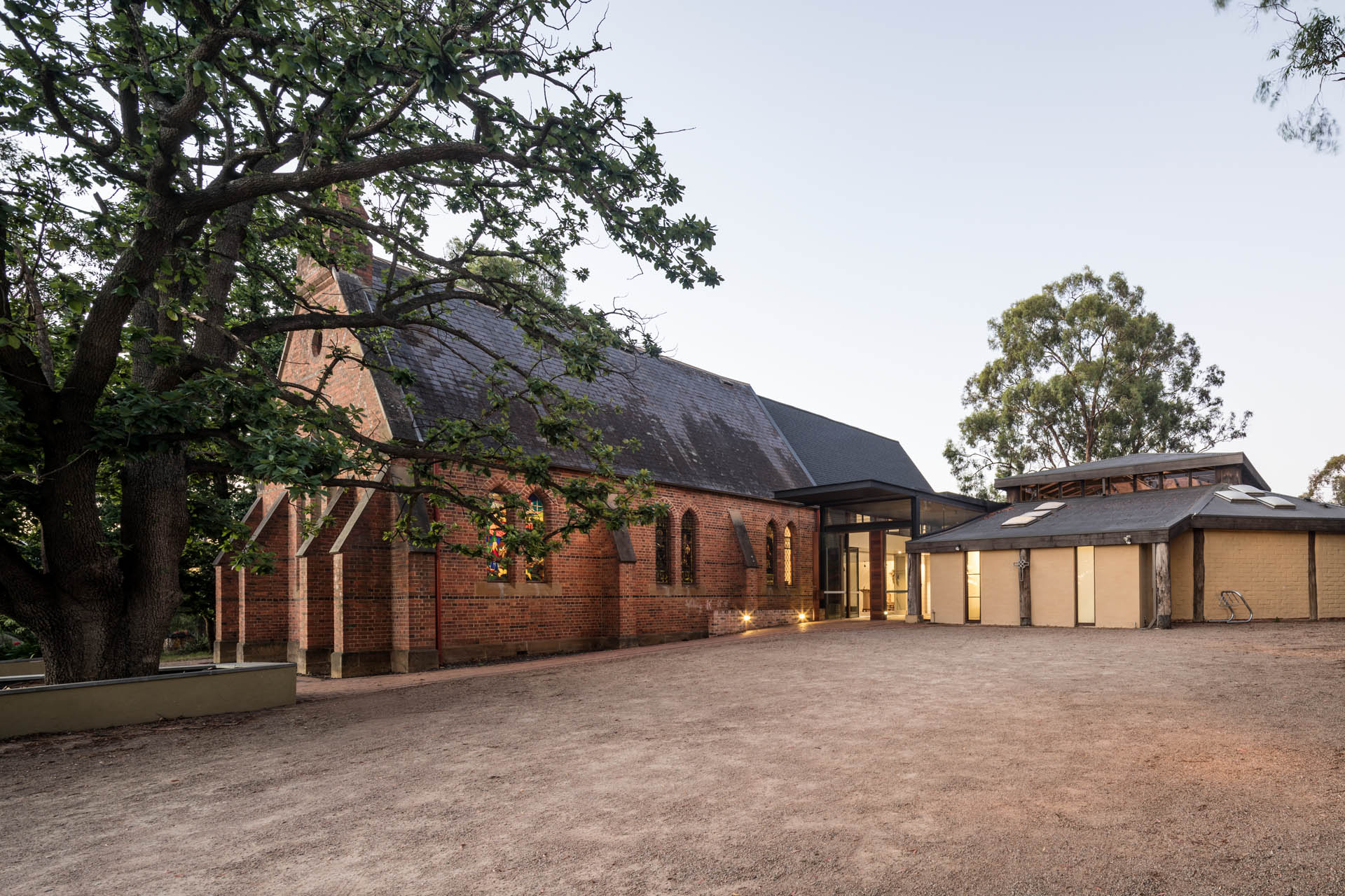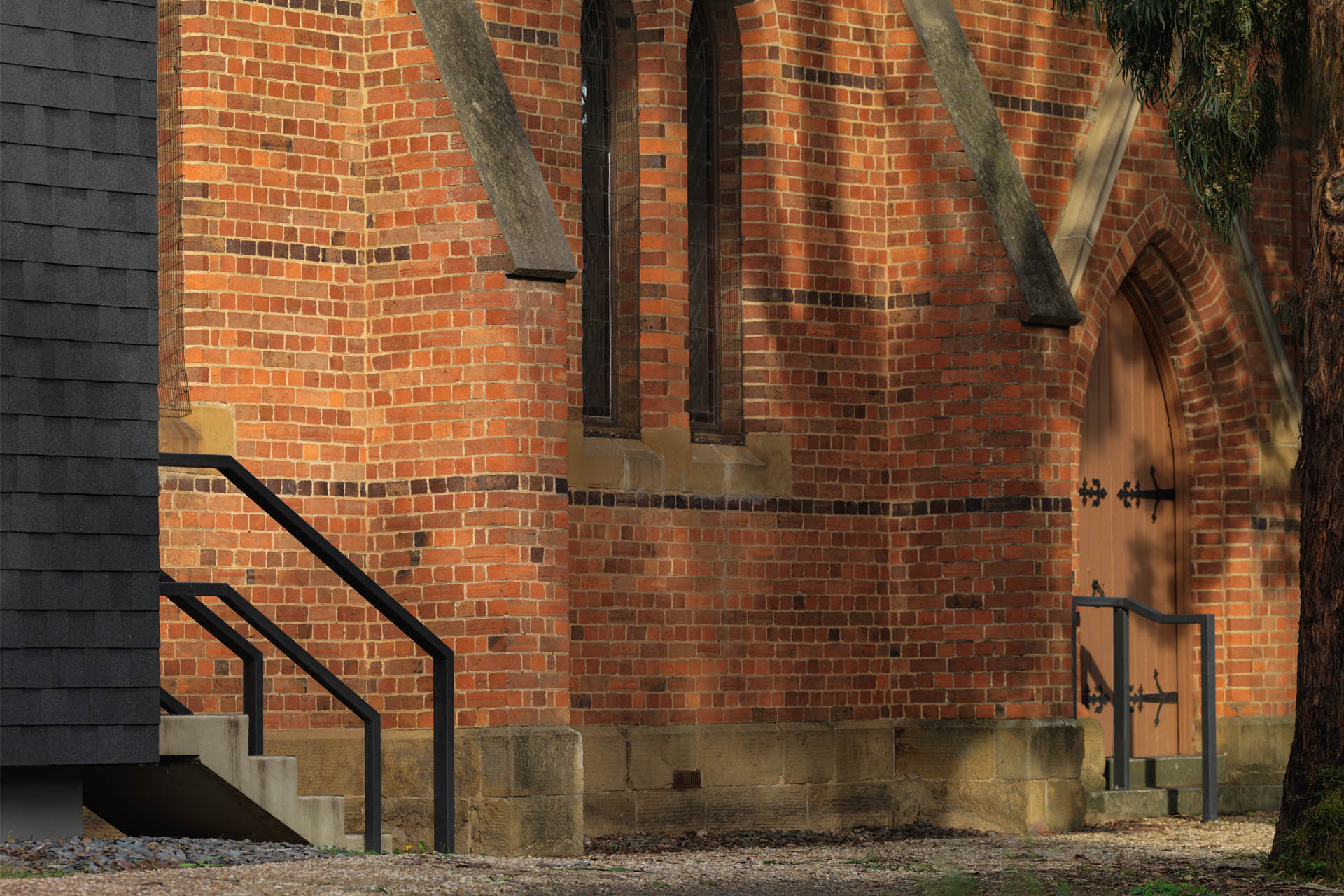 A disparate cluster of heritage structures set amongst a copse of exotic and indigenous trees provide the setting for an extension to St.Margaret’s worship space and parish centre. The church was designed by Nathaniel Billing and built in 1861, closely followed by the old vicarage in the 1870s, and then a century later in 1978 by the intriguing mud brick parish hall designed by Robert Marshall. The church and vicarage are both registered by Heritage Victoria which required a heritage permit for the proposed works. The extension has been designed to express a rapport to the polychromatic church through its form and textural materiality while respecting the vicarage. In addition, the internal timber ceiling and roof structure of the church have been restored, floor raised to that of the parish centre, with new lighting and heating as well as installation of handrails to the traditional entry.