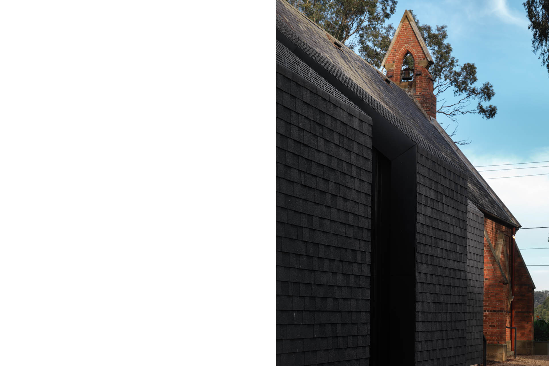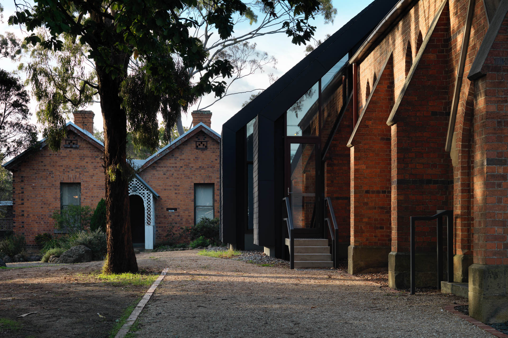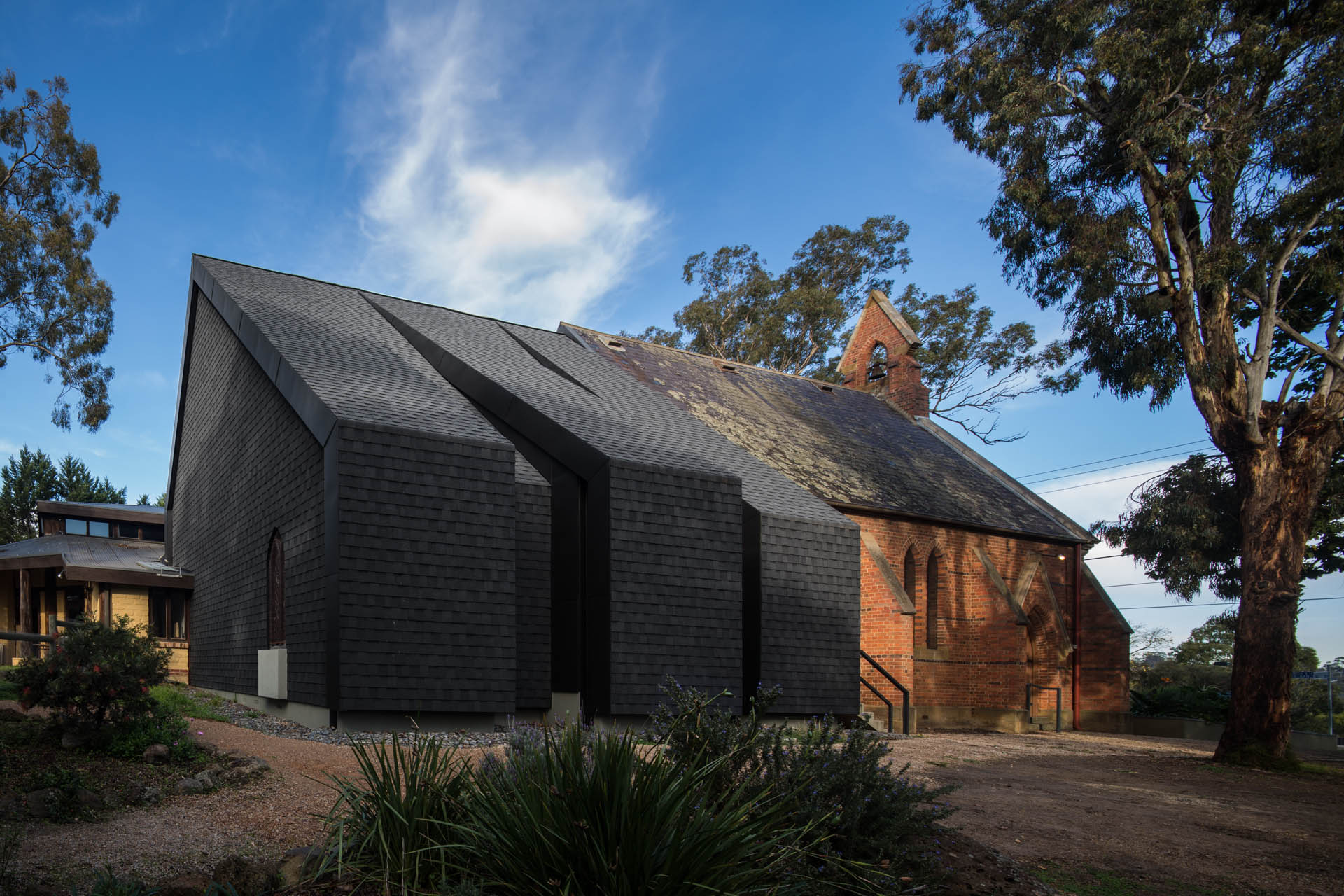 A disparate cluster of heritage structures set amongst a copse of exotic and indigenous trees provide the setting for an extension to St.Margaret’s worship space and parish centre. The church was designed by Nathaniel Billing and built in 1861, closely followed by the old vicarage in the 1870s, and then a century later in 1978 by the intriguing mud brick parish hall designed by Robert Marshall. The church and vicarage are both registered by Heritage Victoria which required a heritage permit for the proposed works. The extension has been designed to express a rapport to the polychromatic church through its form and textural materiality while respecting the vicarage. In addition, the internal timber ceiling and roof structure of the church have been restored, floor raised to that of the parish centre, with new lighting and heating as well as installation of handrails to the traditional entry.