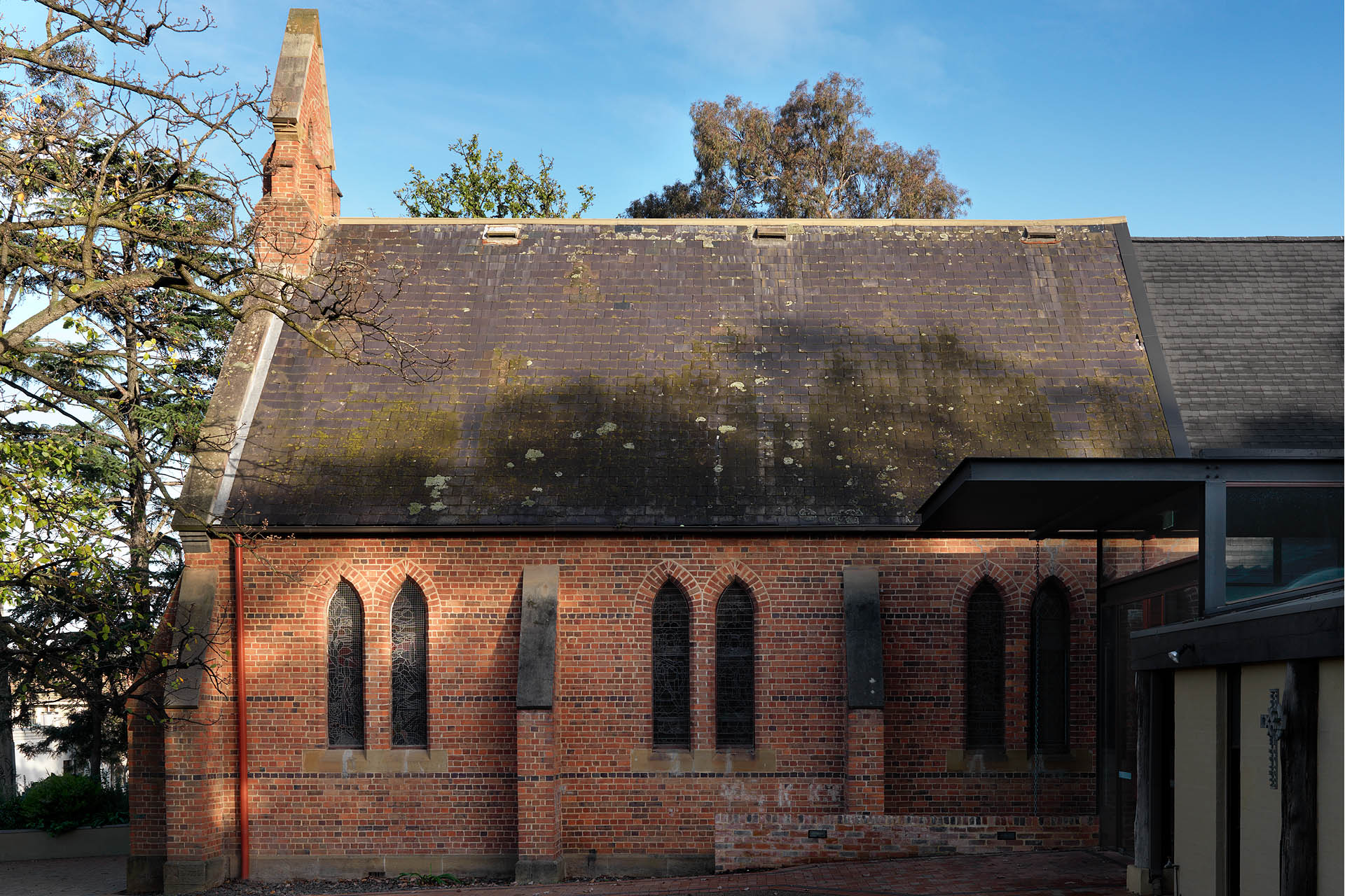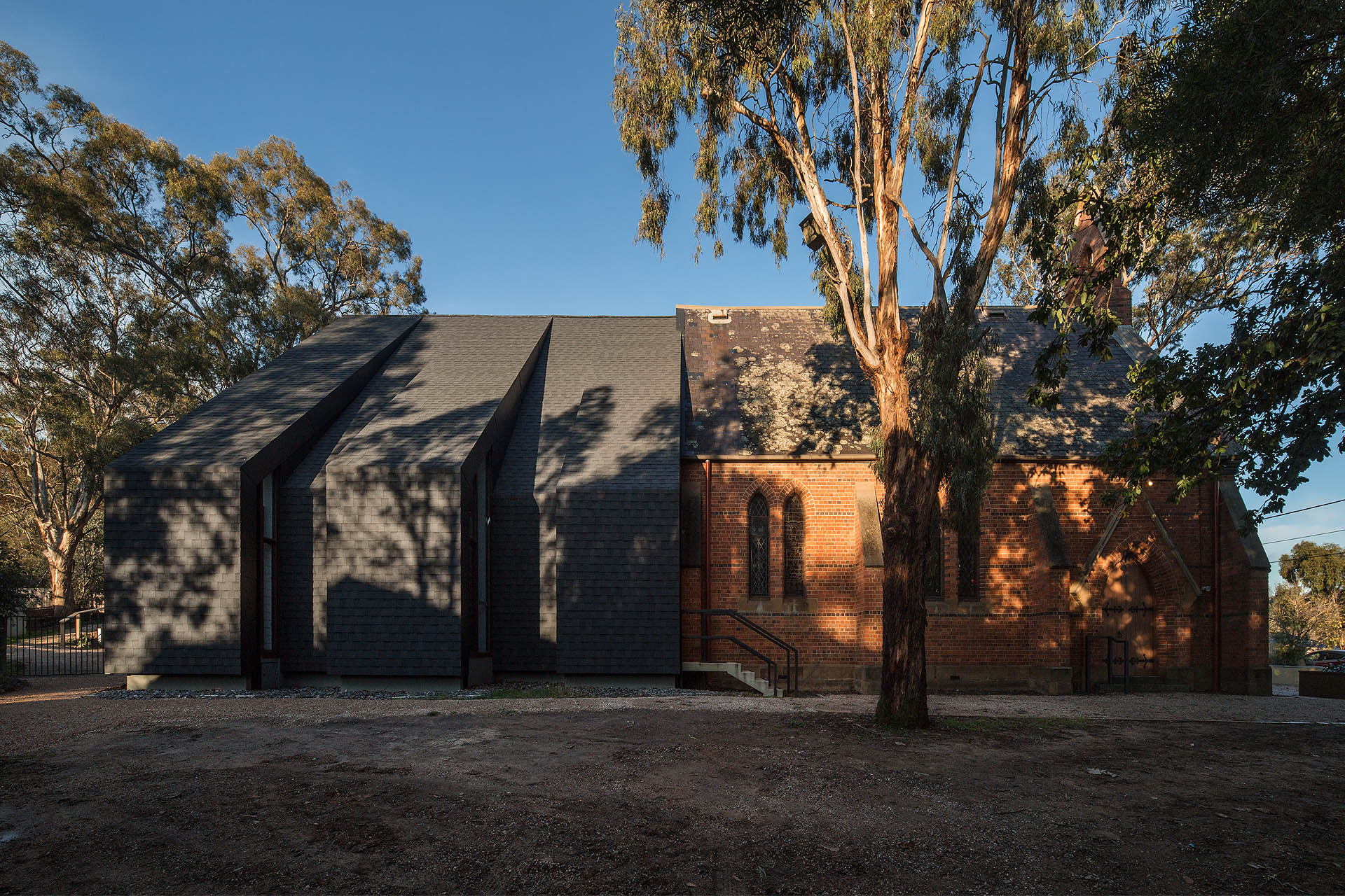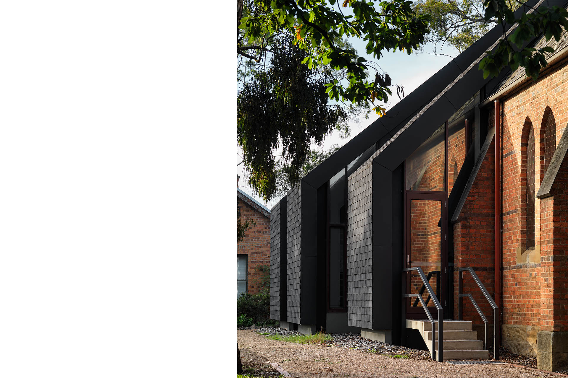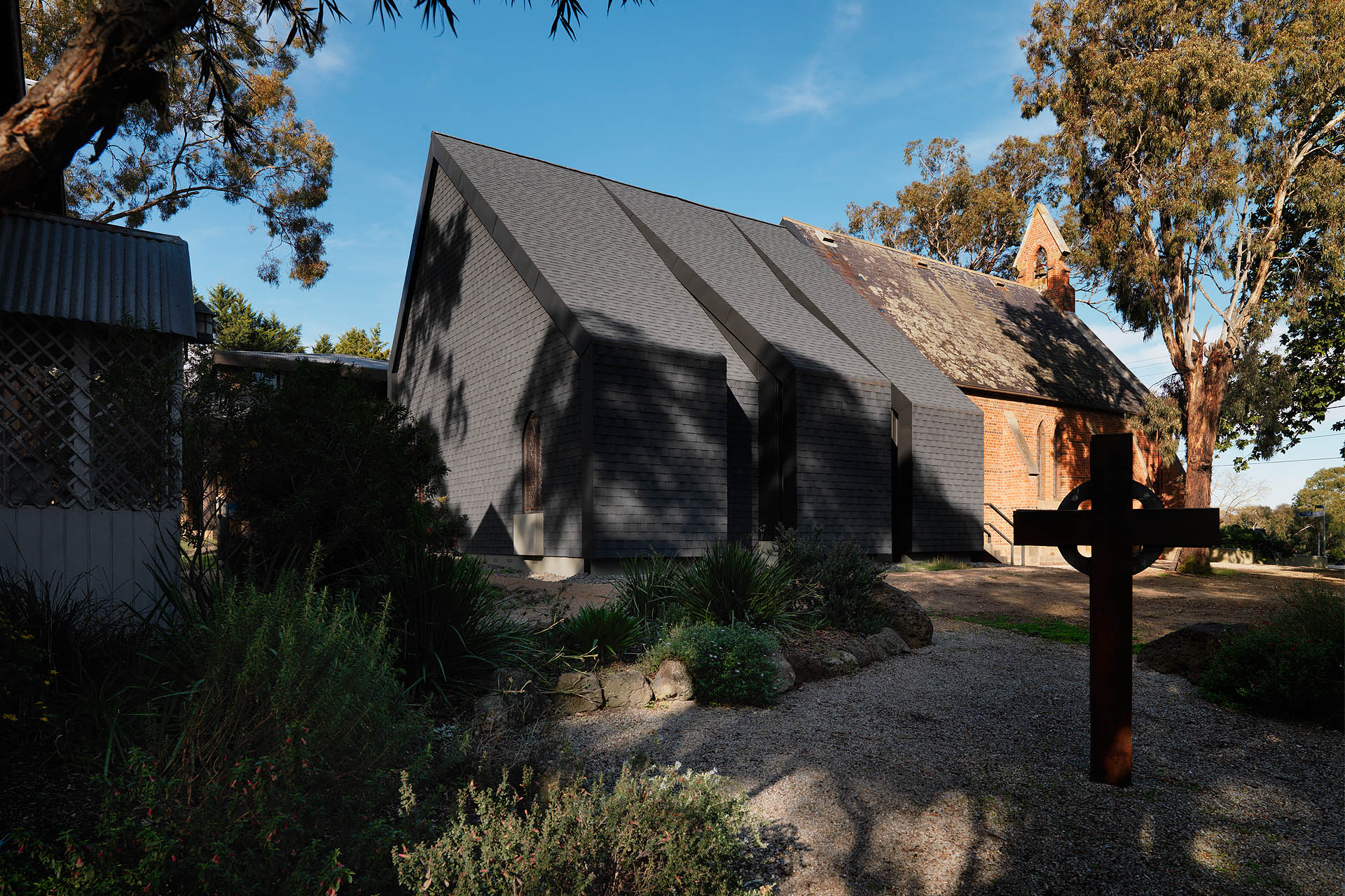 A black cantilevered canopy reaches out over the glazed entry between the church’s striking polychromatic brickwork and the uneven rendered mudbricks of the parish hall, welcoming parishioners and visitors alike to St. Margaret’s. This project stitched together the disparate components of the church into one complex, refurbished the hall with new kitchen and toilets, and fulfilled the original architect’s vision of an extended worship space. Both the original church and the old vicarage are registered by Heritage Victoria requiring the additions to be discrete from the street and demonstrate a rapport with the mid-nineteenth century structures. The worship space has been designed to operate in both a traditional axial seating configuration as well as a more contemporary horseshoe seating array. Modulated bays re-interpret the church’s tectonic rhythm, establishing a distinctive character with new liturgical and spatial opportunities for the worship space within.
