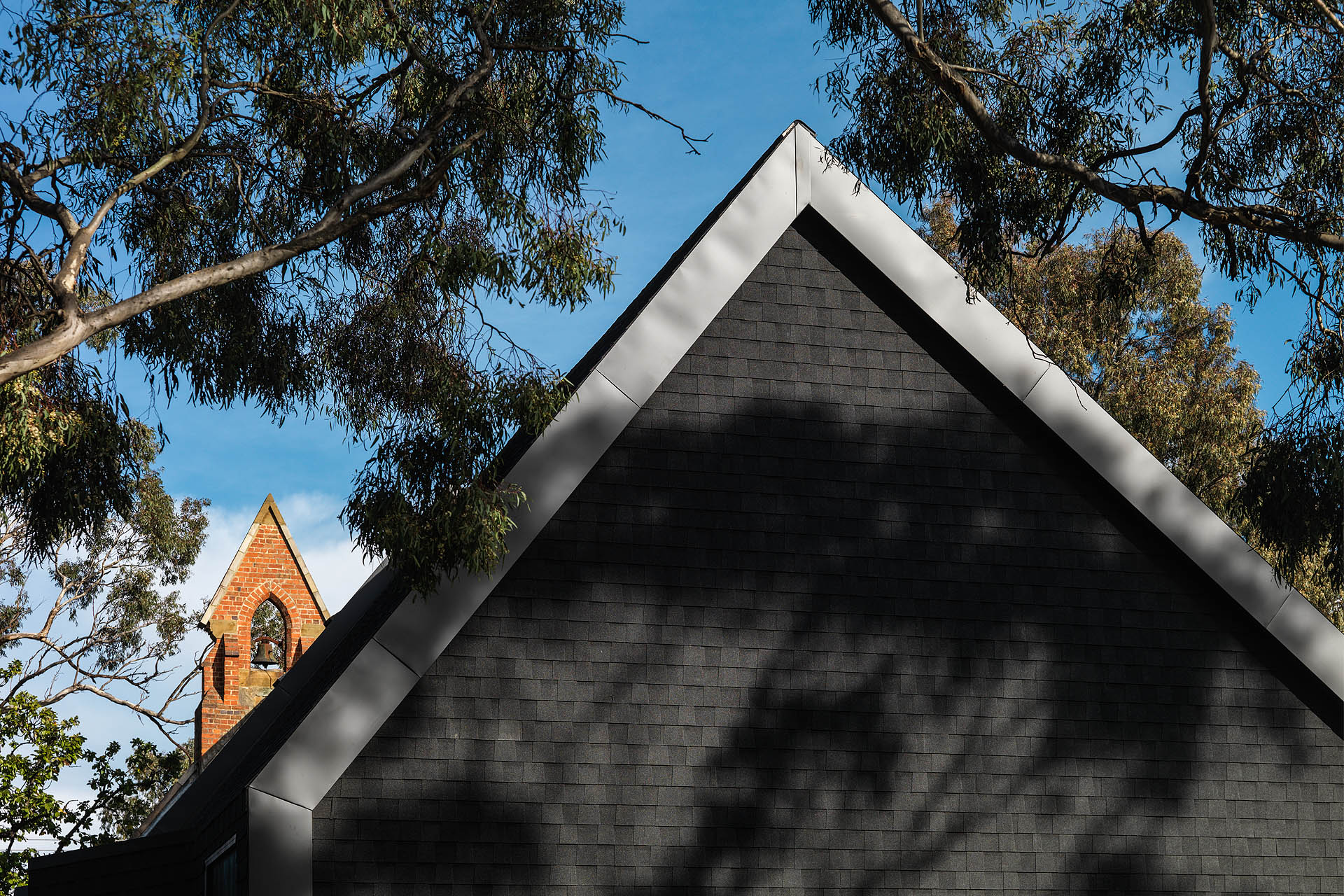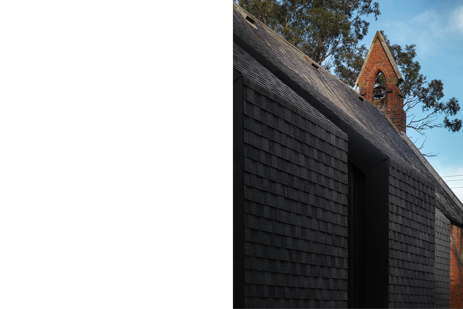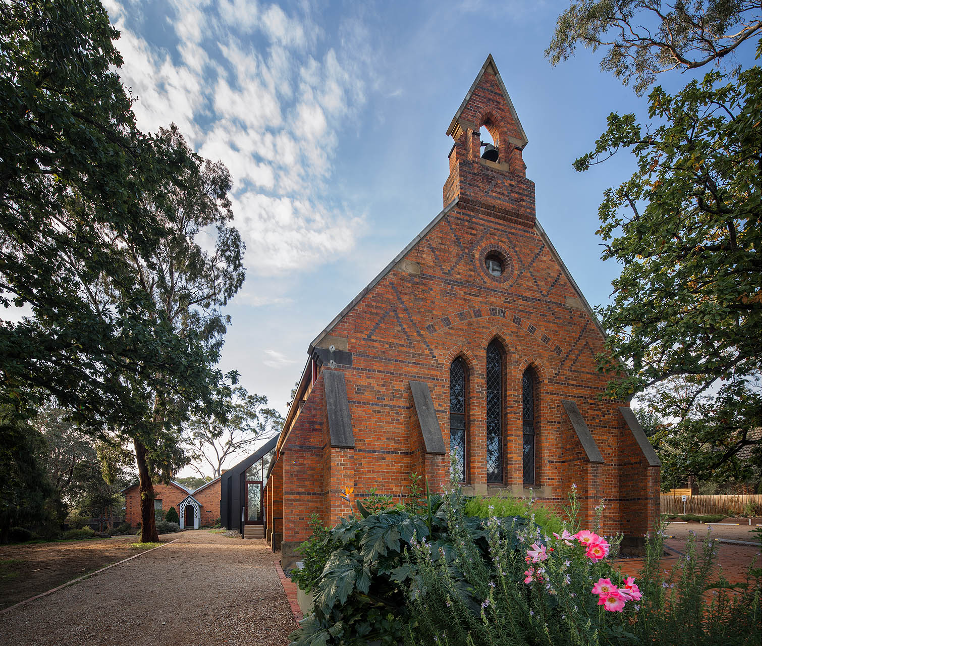 A black cantilevered canopy reaches out over the glazed entry between the church’s striking polychromatic brickwork and the uneven rendered mudbricks of the parish hall, welcoming parishioners and visitors alike to St. Margaret’s. This project stitched together the disparate components of the church into one complex, refurbished the hall with new kitchen and toilets, and fulfilled the original architect’s vision of an extended worship space. Both the original church and the old vicarage are registered by Heritage Victoria requiring the additions to be discrete from the street and demonstrate a rapport with the mid-nineteenth century structures. The worship space has been designed to operate in both a traditional axial seating configuration as well as a more contemporary horseshoe seating array. Modulated bays re-interpret the church’s tectonic rhythm, establishing a distinctive character with new liturgical and spatial opportunities for the worship space within.