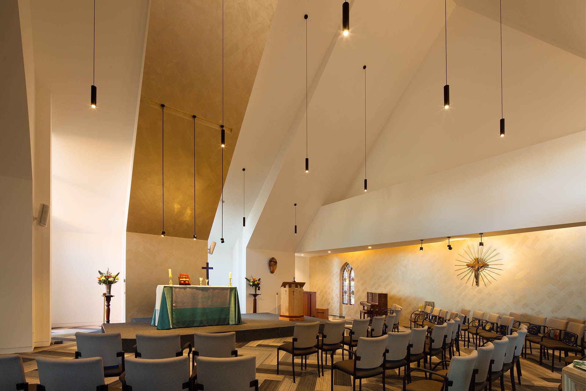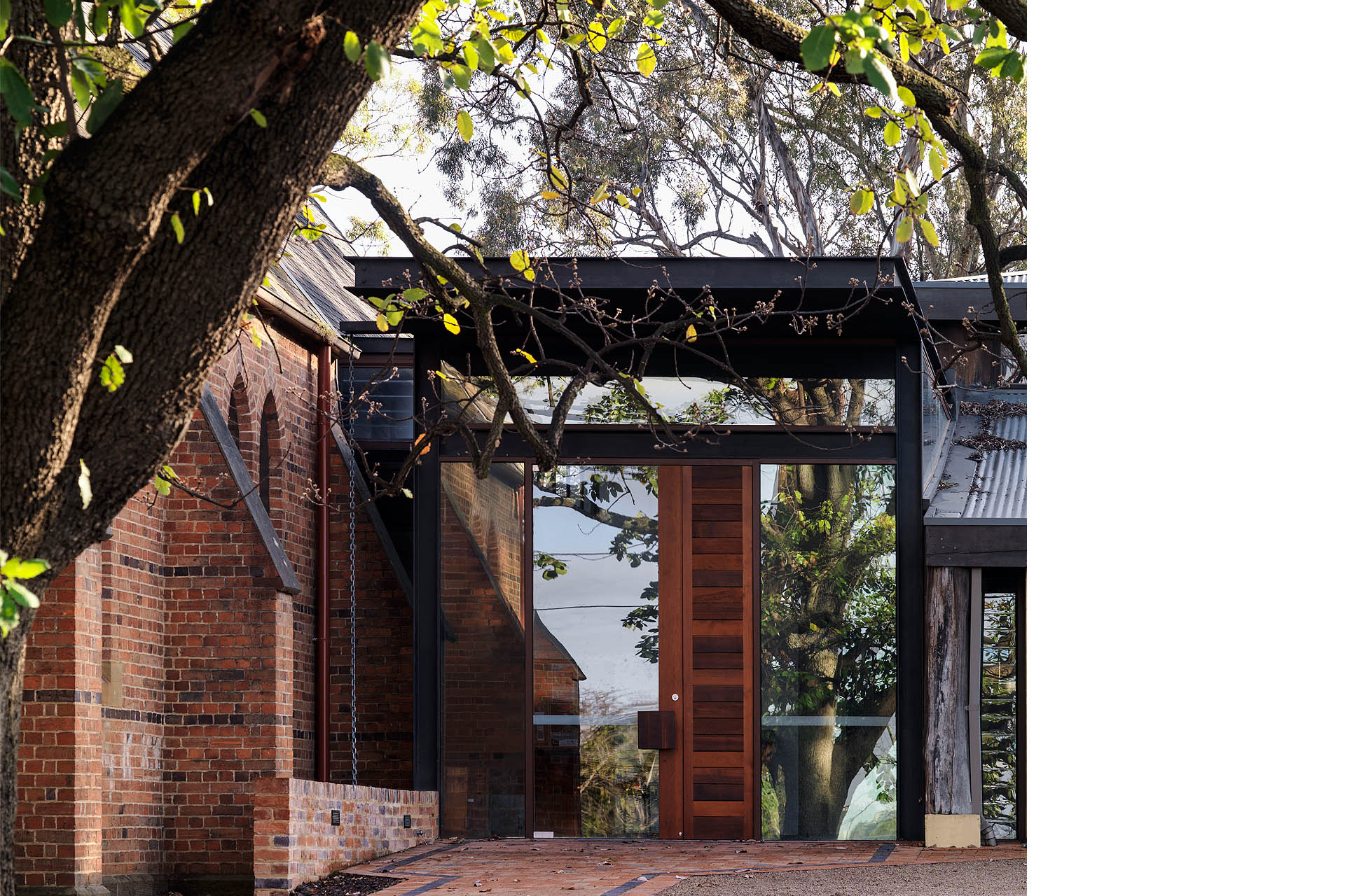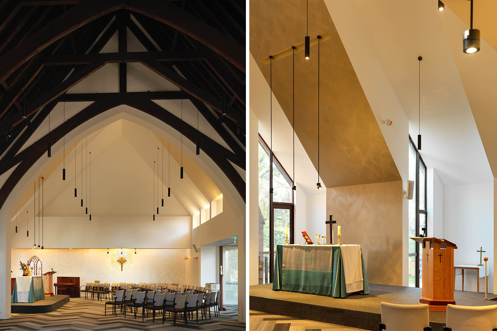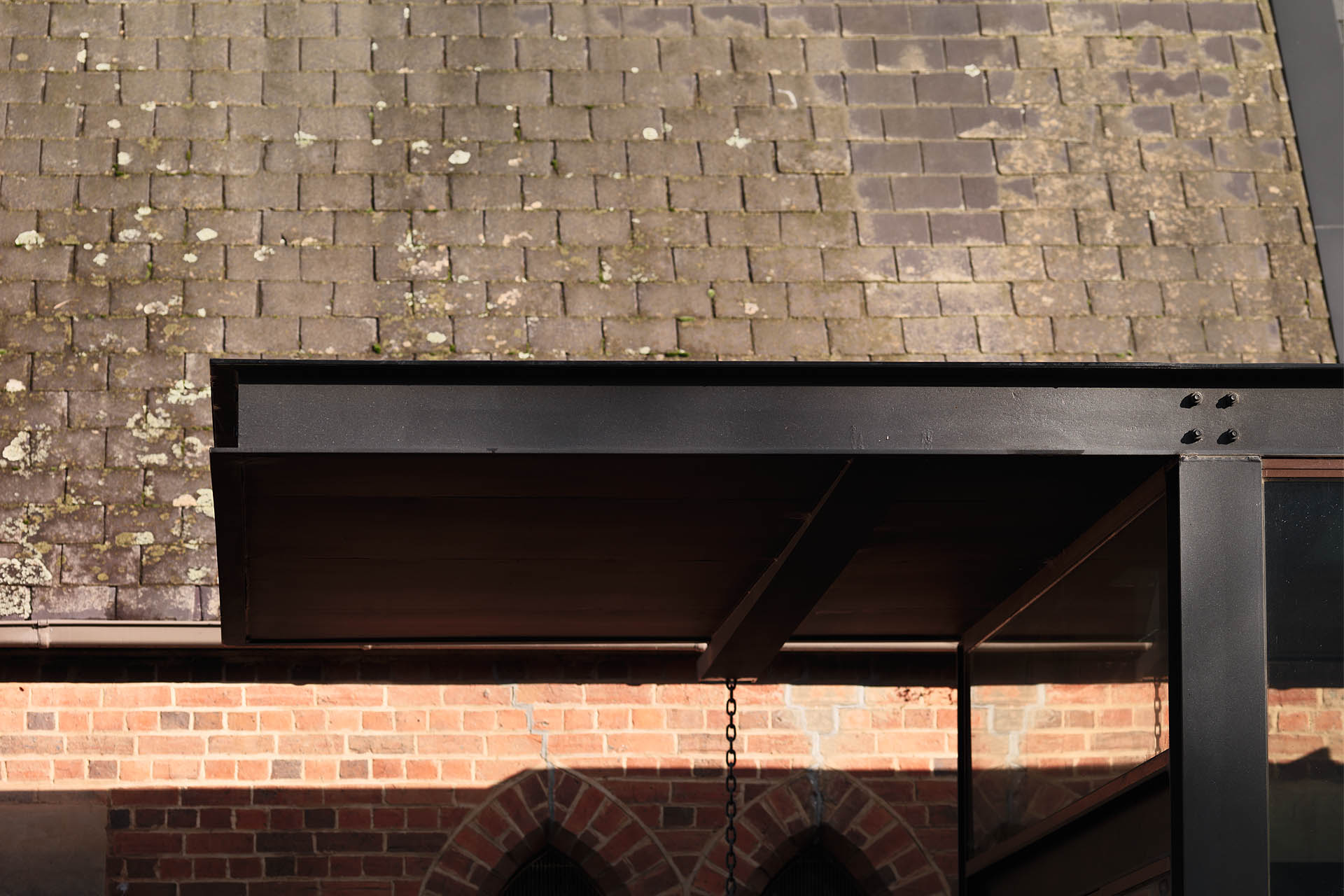 A black cantilevered canopy reaches out over the glazed entry between the church’s striking polychromatic brickwork and the uneven rendered mudbricks of the parish hall, welcoming parishioners and visitors alike to St. Margaret’s. This project stitched together the disparate components of the church into one complex, refurbished the hall with new kitchen and toilets, and fulfilled the original architect’s vision of an extended worship space. Both the original church and the old vicarage are registered by Heritage Victoria requiring the additions to be discrete from the street and demonstrate a rapport with the mid-nineteenth century structures. The worship space has been designed to operate in both a traditional axial seating configuration as well as a more contemporary horseshoe seating array. Modulated bays re-interpret the church’s tectonic rhythm, establishing a distinctive character with new liturgical and spatial opportunities for the worship space within.