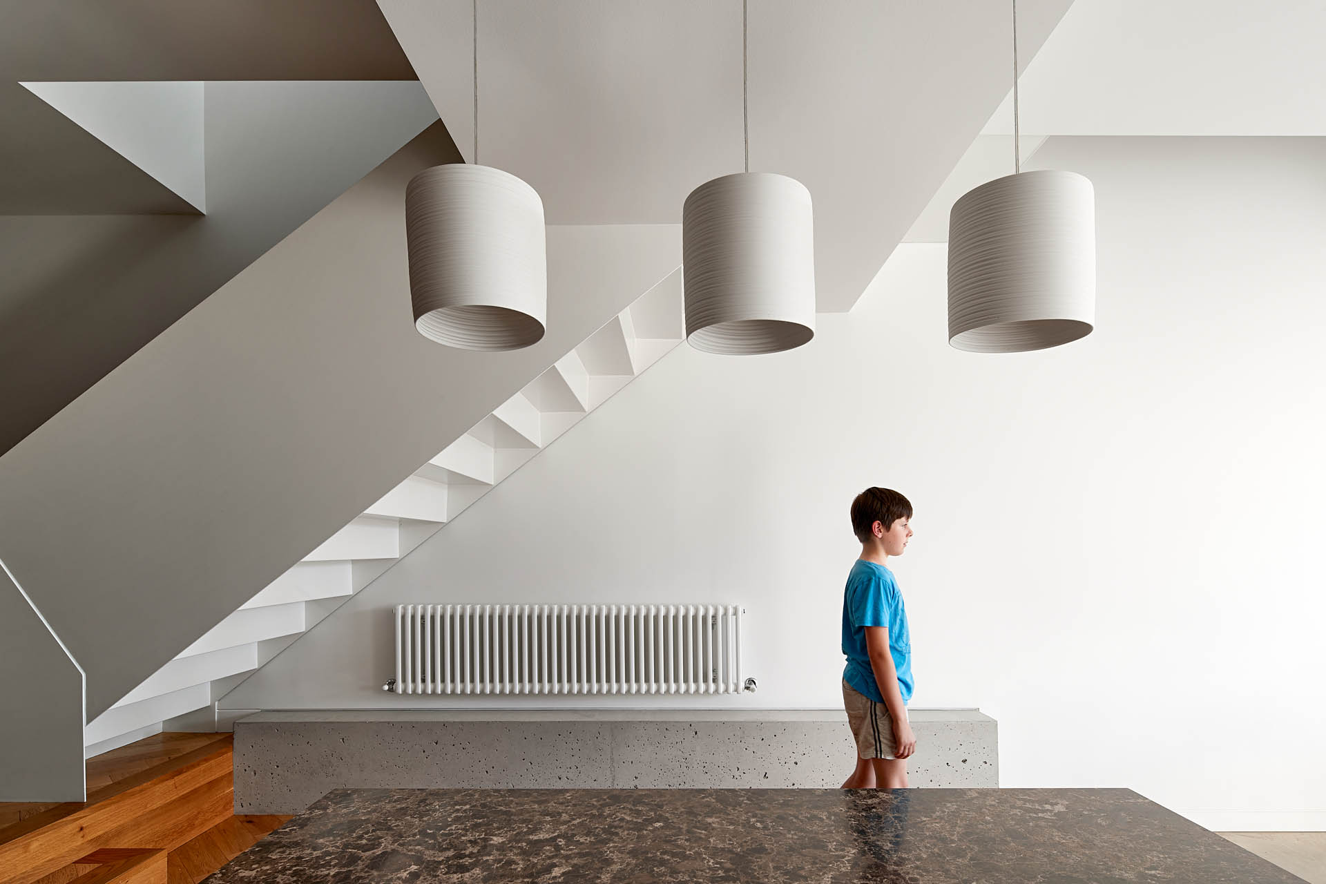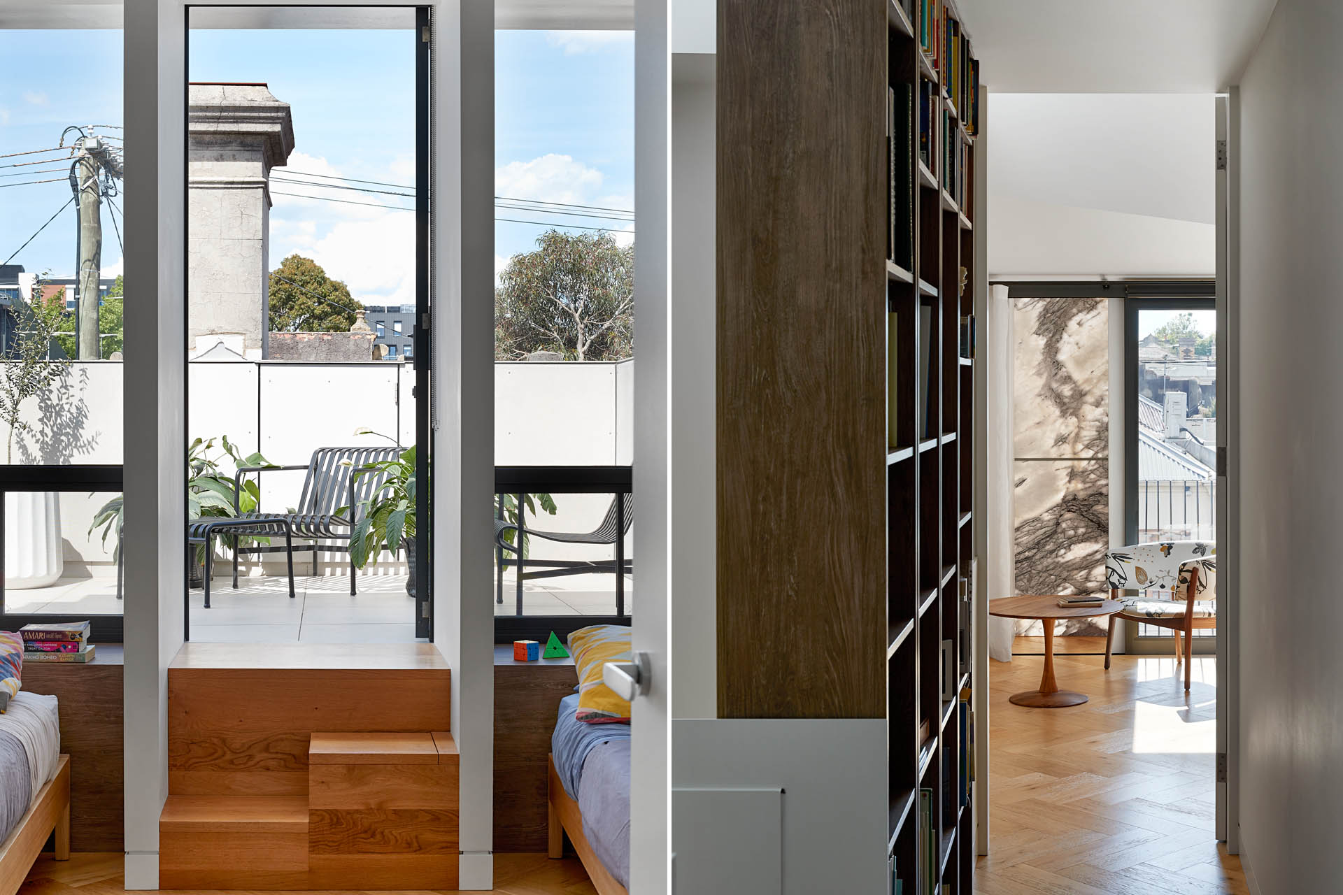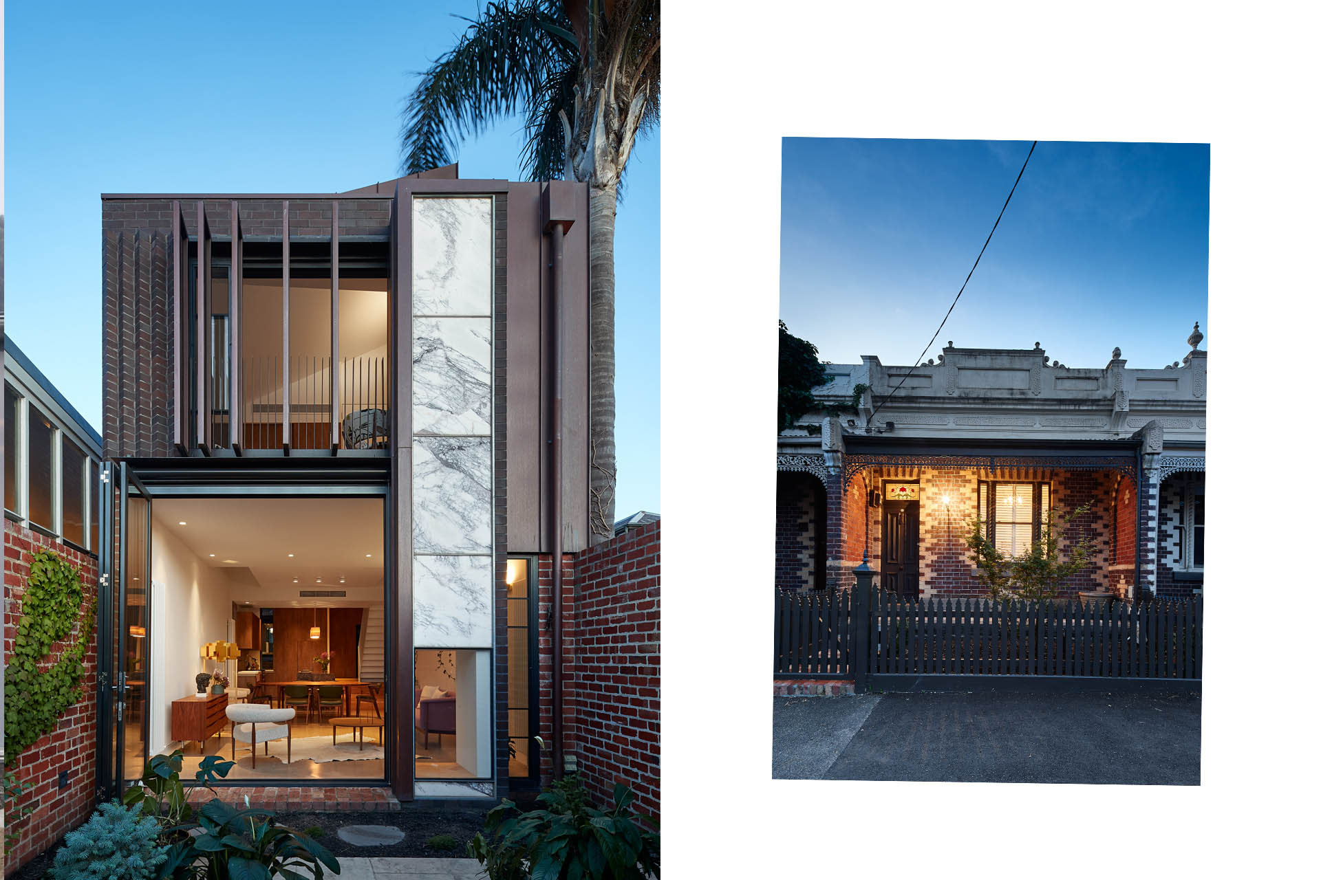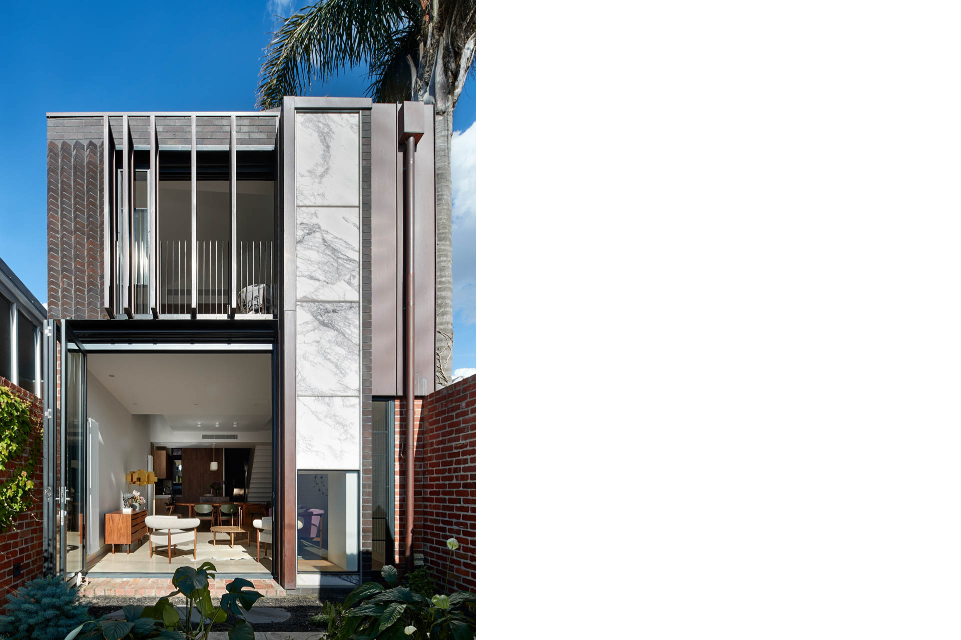 This two storey extension to a Victorian single fronted terrace house in North Carlton is populated by a myriad of rooflights and lanterns allowing daylight to cascade through the house and settle upon the mellow tonings of the burnished concrete slab below. A deck nestled within the existing roofscape and an abridged Juliet balcony to the primary bedroom provide upper level connections to outside while the lower level living spaces open up to the garden. The rear elevation is clad in earthy terracotta toned dry pressed bricks with a crown of copper above.