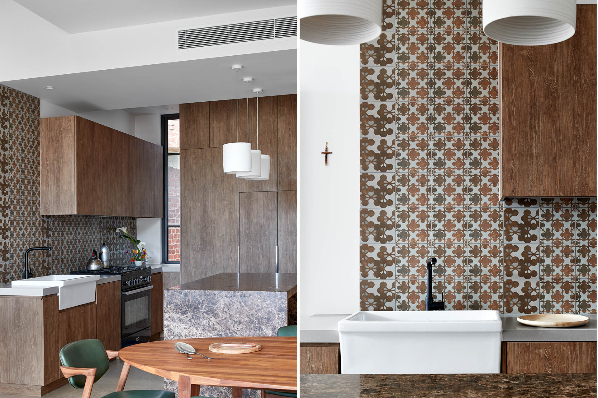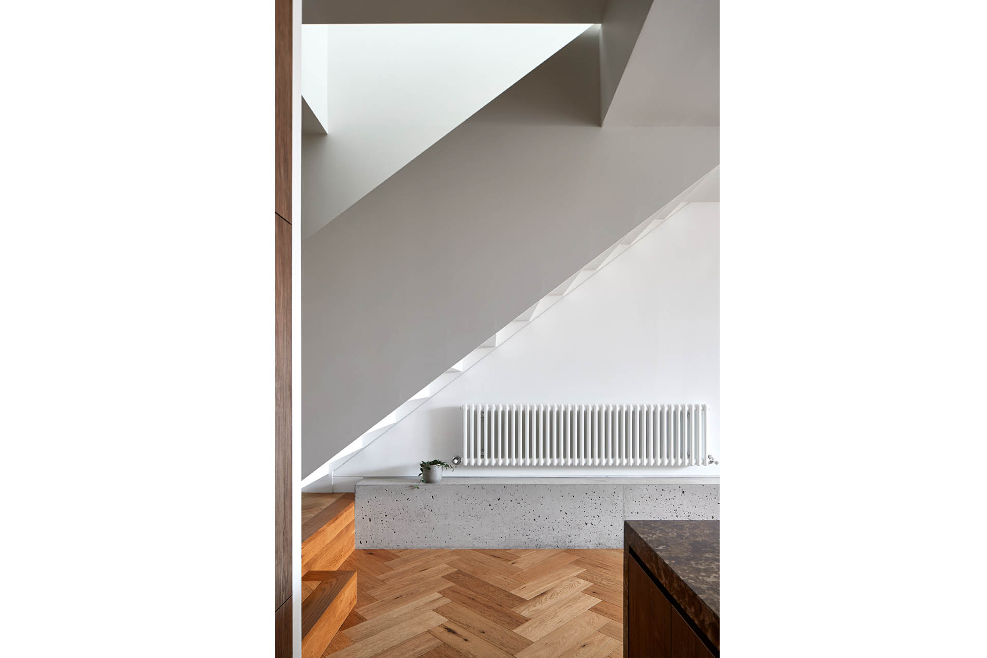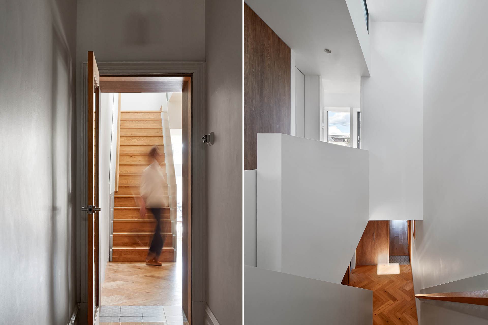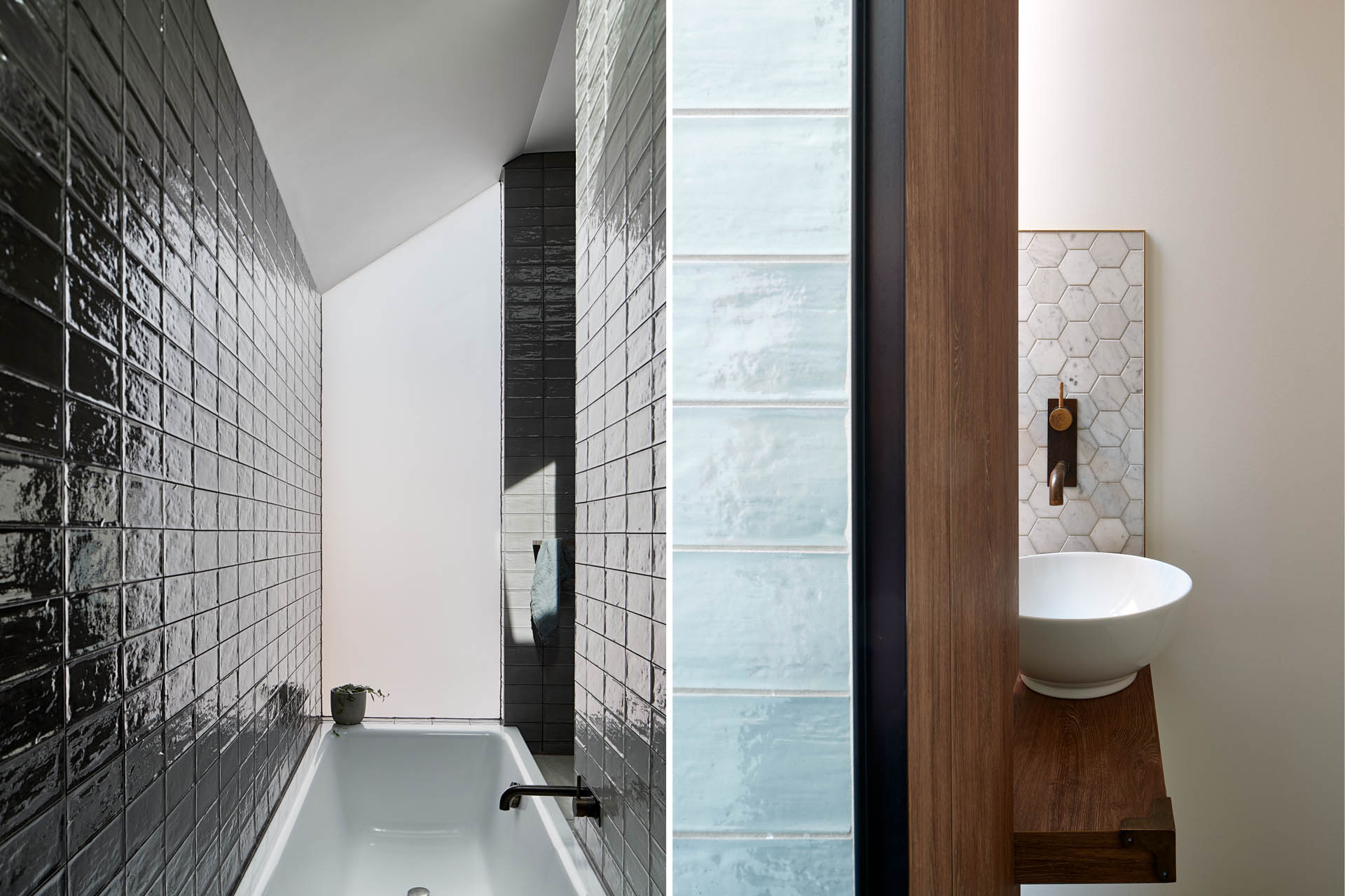 This two storey extension to a Victorian single fronted terrace house in North Carlton is populated by a myriad of rooflights and lanterns allowing daylight to cascade through the house and settle upon the mellow tonings of the burnished concrete slab below. A deck nestled within the existing roofscape and an abridged Juliet balcony to the primary bedroom provide upper level connections to outside while the lower level living spaces open up to the garden. The rear elevation is clad in earthy terracotta toned dry pressed bricks with a crown of copper above.
