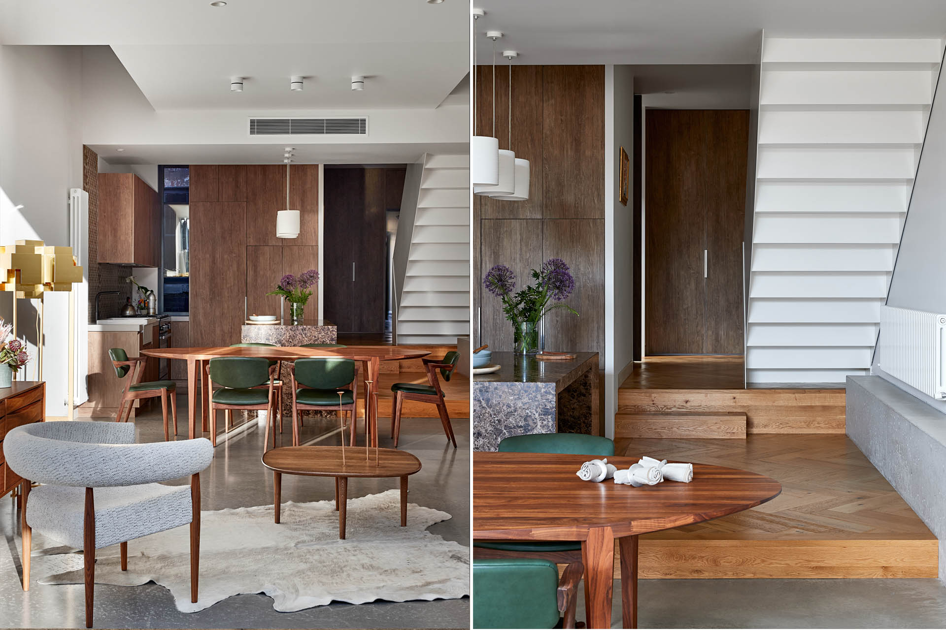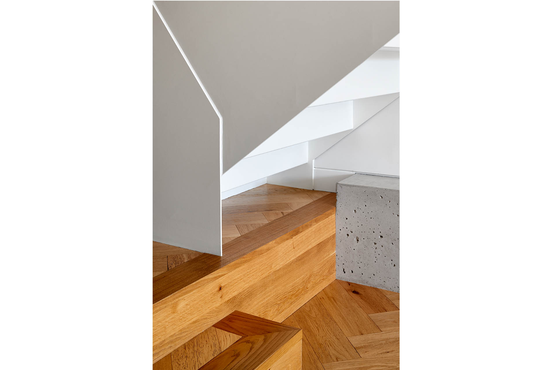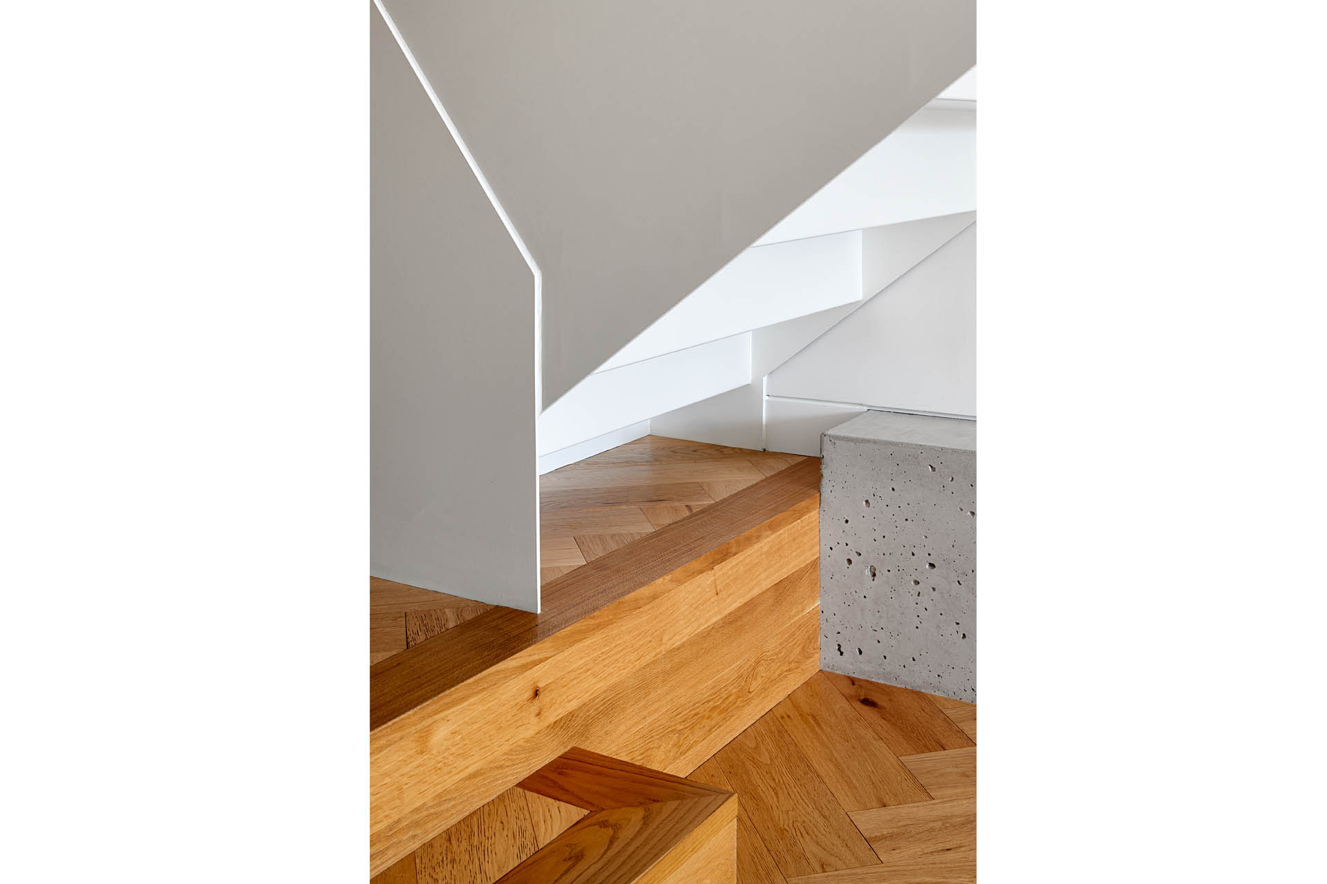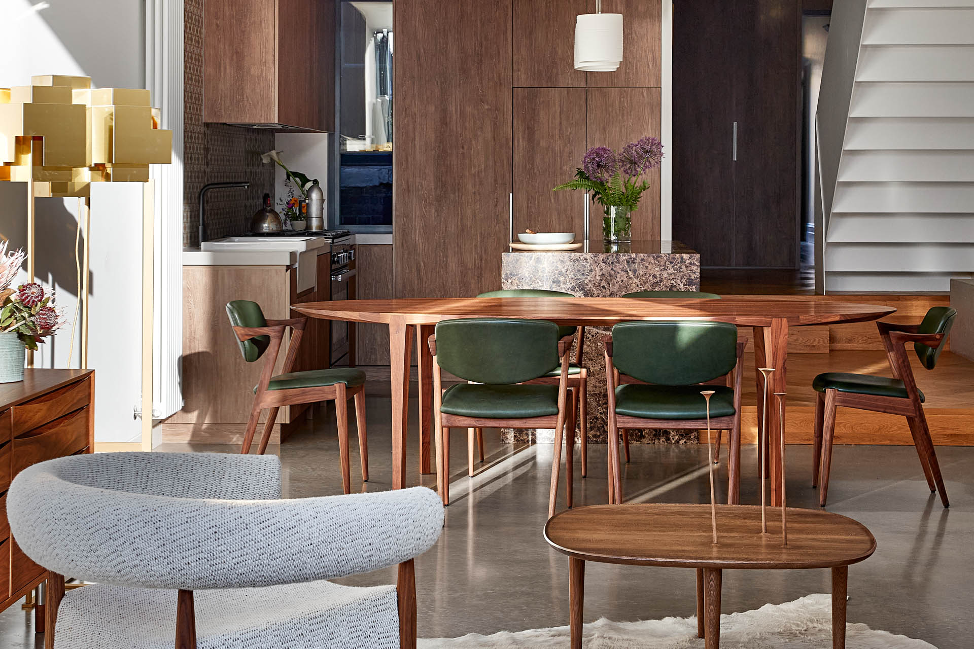 This two storey extension to a Victorian single fronted terrace house in North Carlton is populated by a myriad of rooflights and lanterns allowing daylight to cascade through the house and settle upon the mellow tonings of the burnished concrete slab below. A deck nestled within the existing roofscape and an abridged Juliet balcony to the primary bedroom provide upper level connections to outside while the lower level living spaces open up to the garden. The rear elevation is clad in earthy terracotta toned dry pressed bricks with a crown of copper above.
