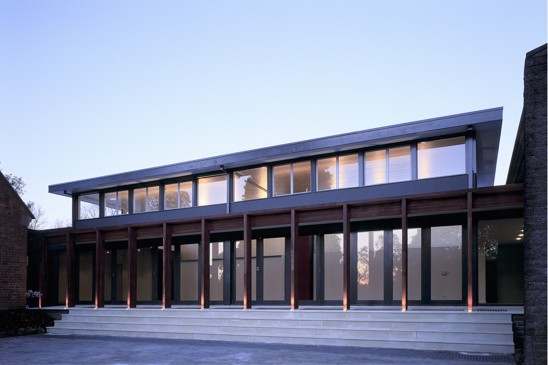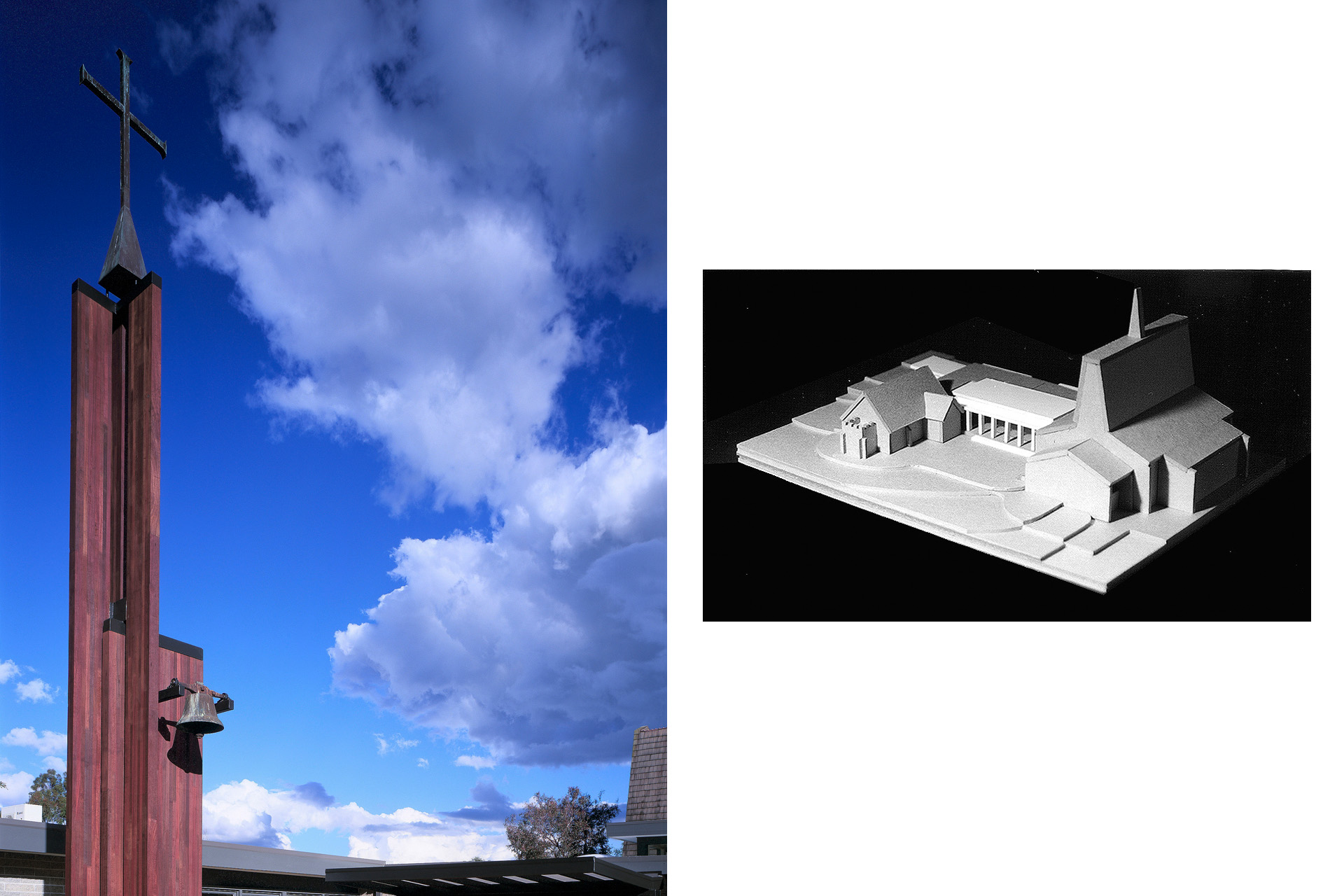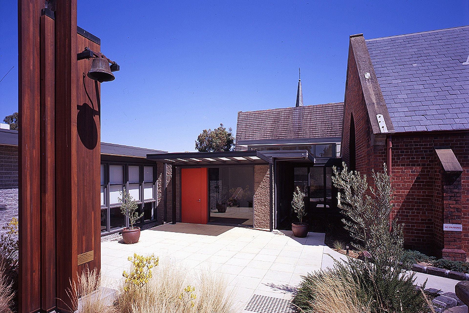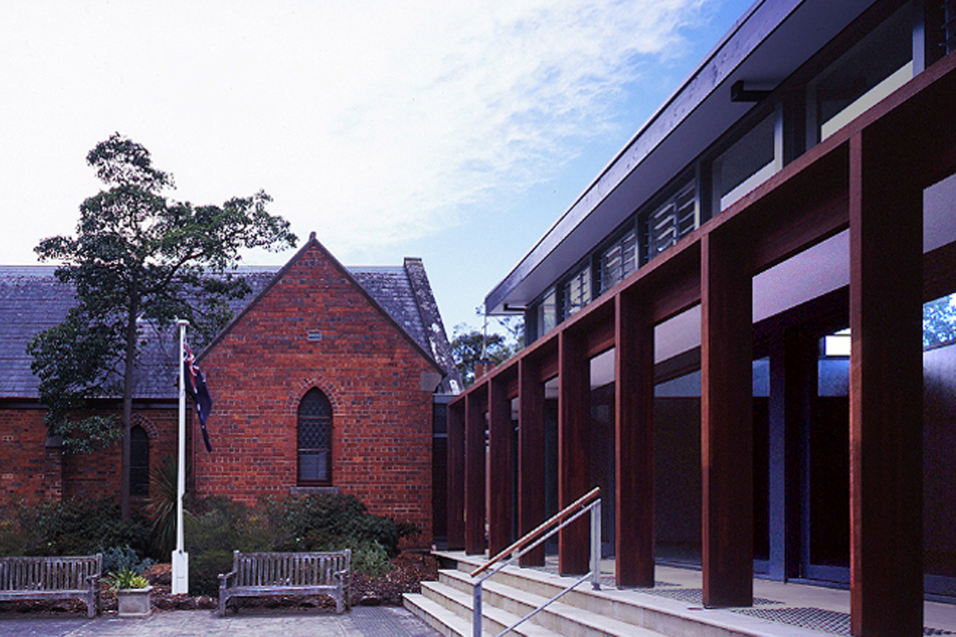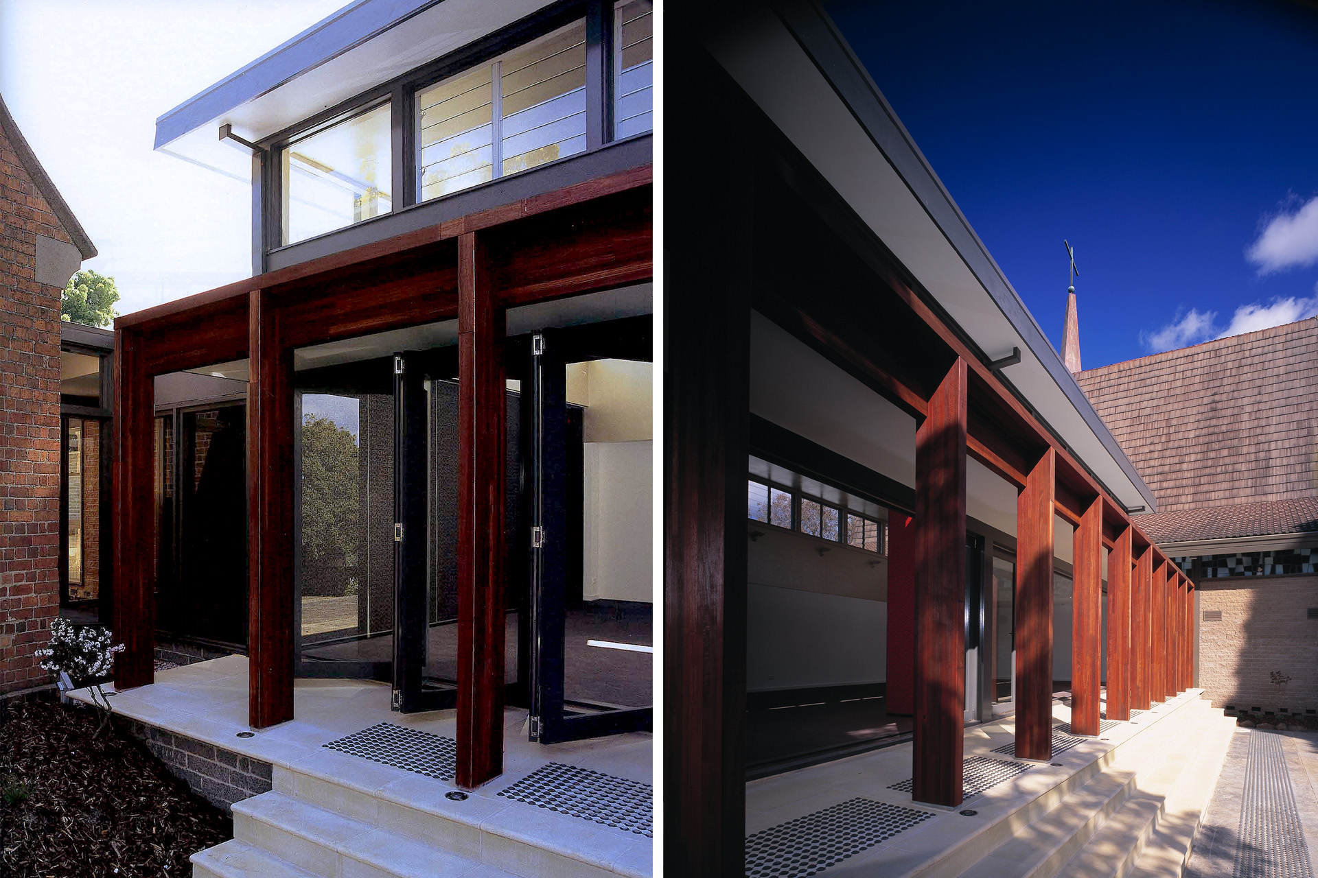 A laminated jarrah loggia reaches out to both the Nathaniel Billing designed 1865 red brick  church and the 1969 modern church, uniting them and an utilitarian parish structure into a singular complex with enhanced facilities and disabled access throughout.  A multi-purpose divisible meeting space resides behind the loggia while to the other side of the old church, a 6m high laminated jarrah campanile celebrates the consolidation of two parishes and demarcates the weekday entry with consolidated offices behind.
