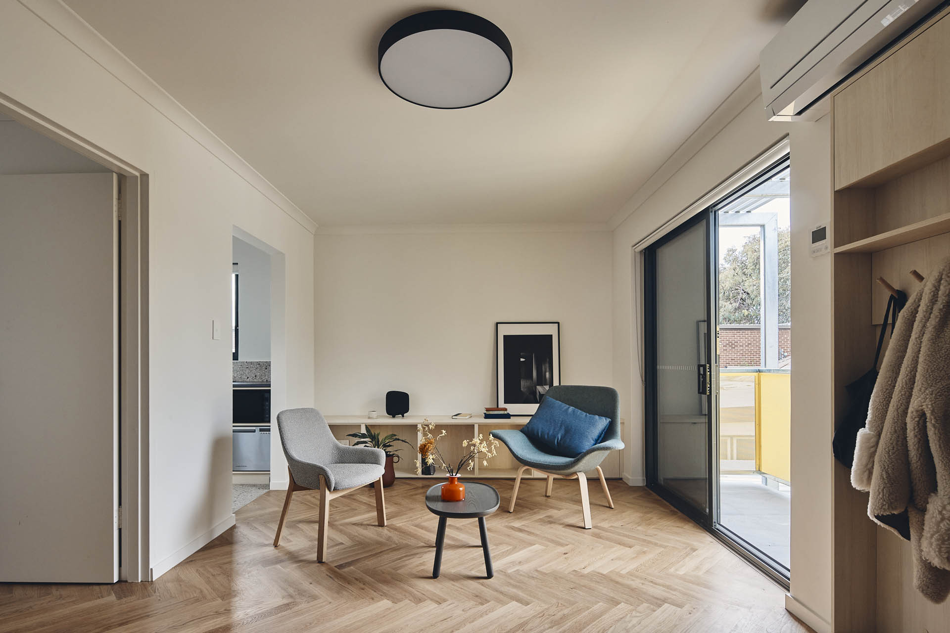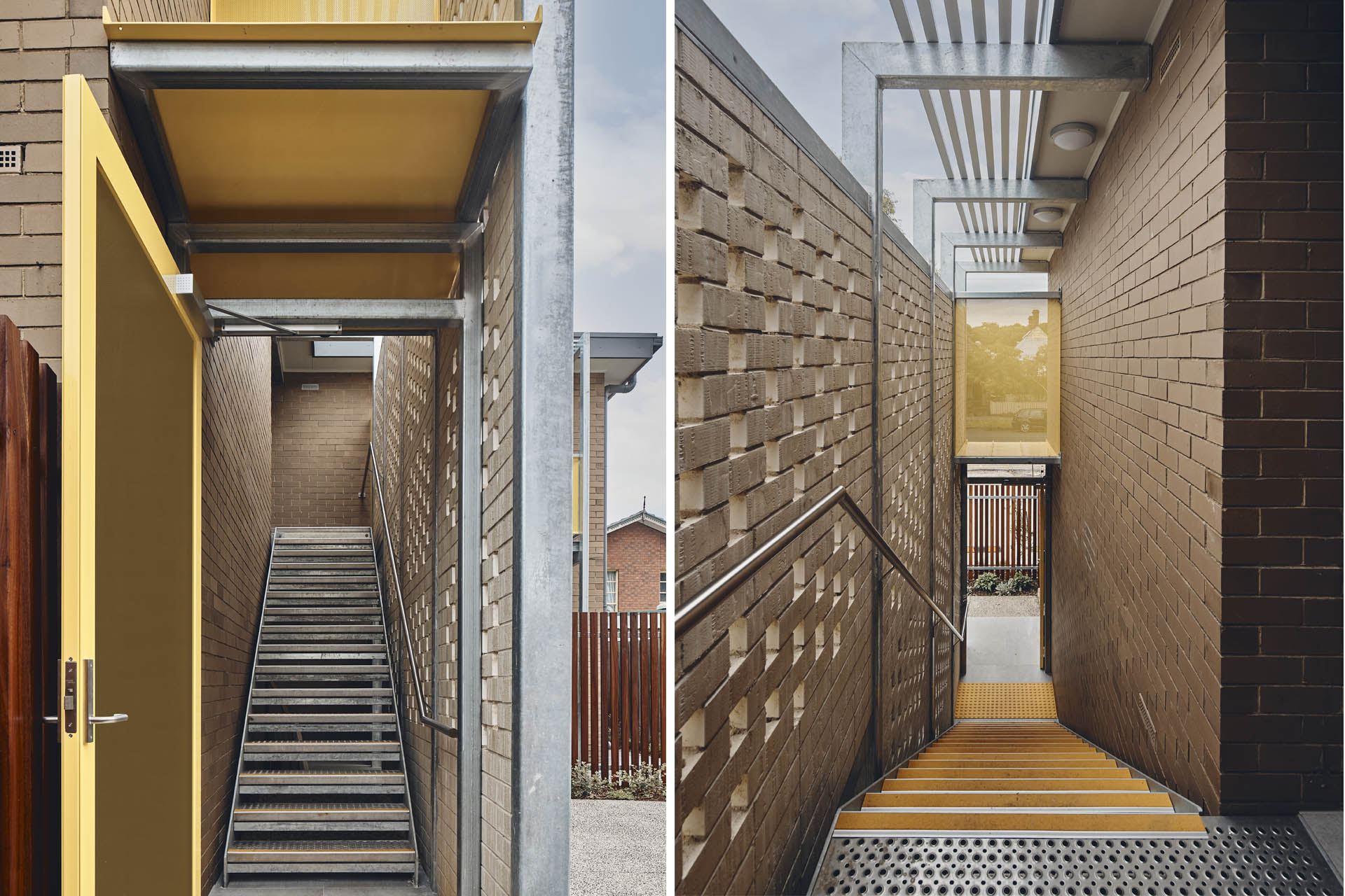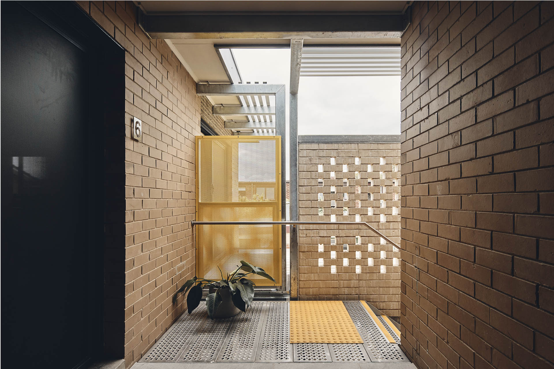 A tired, archetypal, suburban six pack apartment building, close to public transport, bicycle paths and shops in Brunswick, has been philanthropically transformed into Launch Housing’s Home Ground emergency and low-cost, social housing. The building envelope was bolstered by the introduction of thermally insulated roofing, double glazing throughout with full height sliding doors to living spaces allowing their extension onto balconies and private, landscaped gardens. Internalised, walled staircase and foyers together with a walled frontage have greatly enhanced personal security for residents. The abolition of gas augmented by an extensive photovoltaic solar collection system significantly reduces the carbon footprint and fosters operational energy independence. Interiors are rejuvenated with new kitchens, bathrooms, finishes, lighting and fittings.